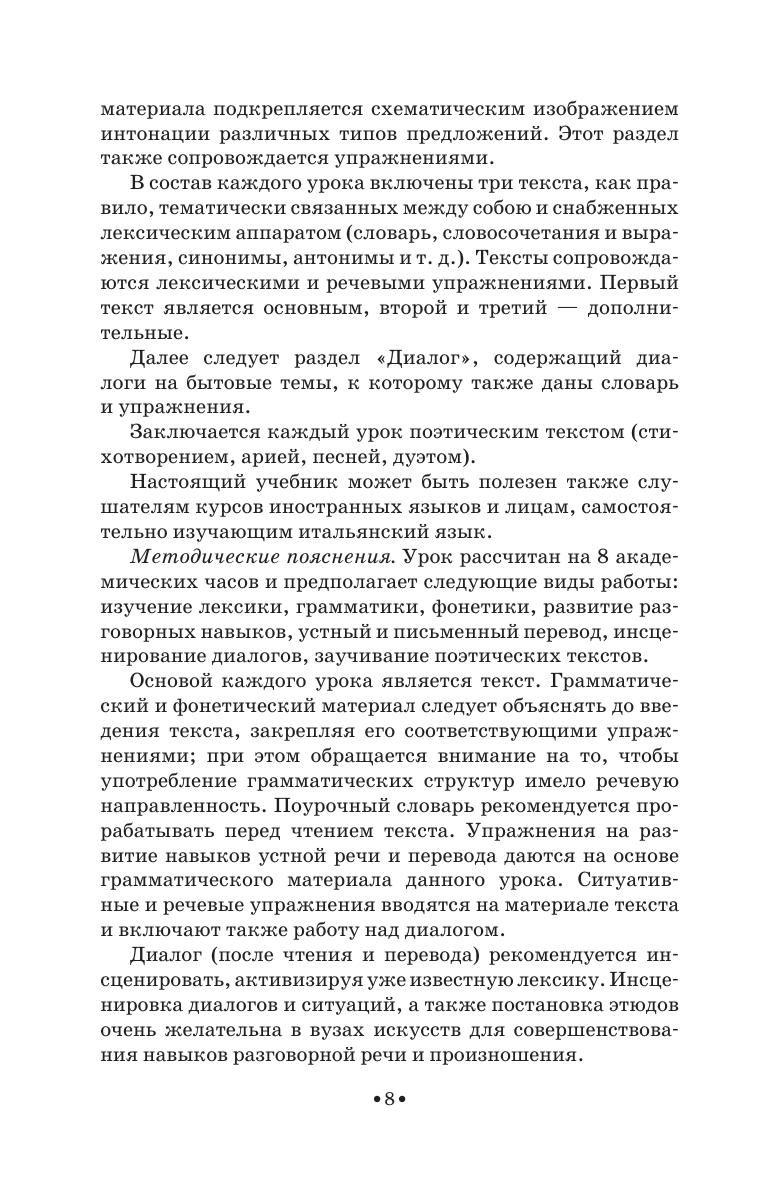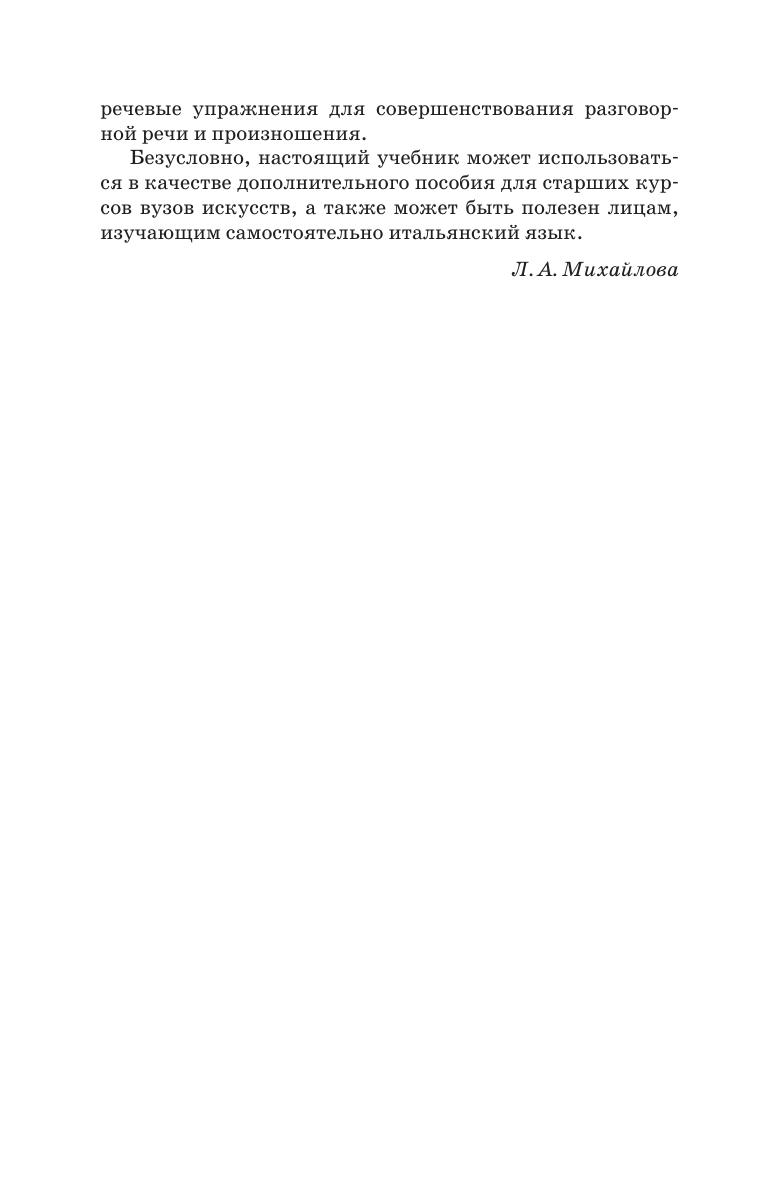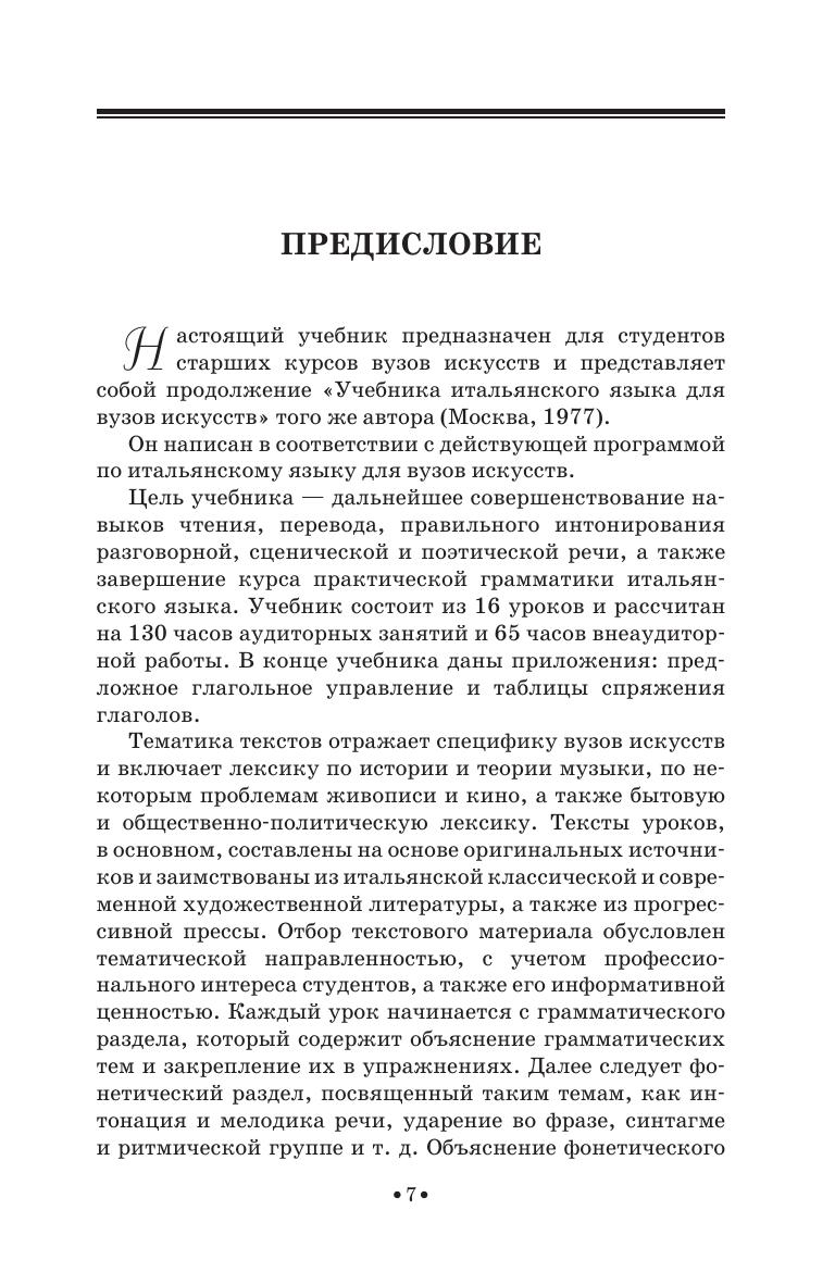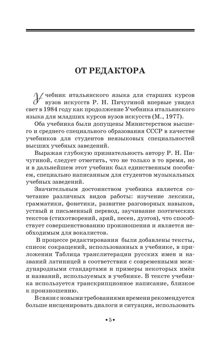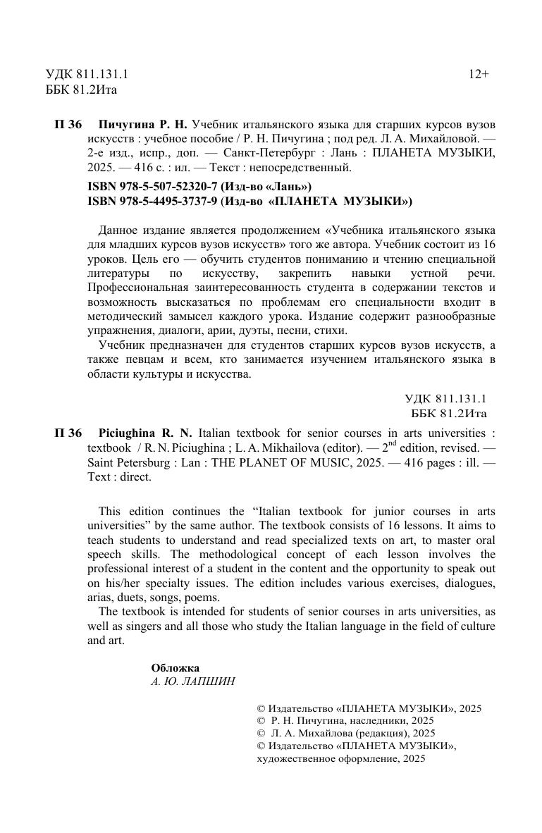 Данное издание является продолжением «Учебника итальянского языка для младших курсов вузов искусств» того же автора. Учебник состоит из 16 уроков. Цель его — обучить студентов пониманию и чтению специальной литературы по искусству, закрепить навыки устной речи. Профессиональная заинтересованность студента в содержании текстов и возможность высказаться по проблемам его специальности входит в методический замысел каждого урока. Издание содержит разнообразные упражнения, диалоги, арии, дуэты, песни, стихи. Учебник предназначен для студентов старших курсов вузов искусств, а также певцам и всем, кто занимается изучением итальянского языка в области культуры и искусства. This edition is continues the “Italian textbook for junior courses in arts universities” by the same author. The textbook consists of 16 lessons. It aims to teach students to understand and read specialized texts on art, to master oral speech skills. The methodological concept of each lesson involves the professional interest of a student in the content and the opportunity to speak out on his/her specialty issues. The edition includes various exercises, dialogues, arias, duets, songs, poems. The textbook is intended for students of senior courses of arts universities, as well as singers and all those who study the Italian language in the field of culture and art.