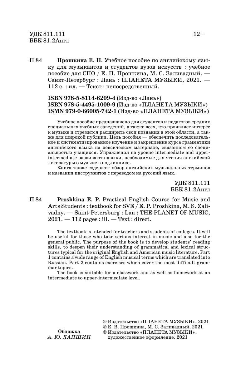 Учебное пособие предназначено для студентов и педагогов средних специальных учебных заведений, а также всех, кто проявляет интерес к музыке и стремится расширить свои познания в этой области, а также для широкой публики. Цель пособия — обеспечить последовательное и систематизированное изучение и закрепление курса грамматики английского языка на лексическом материале, связанном со специальностью учащихся. Упражнения на уровне intermediate and upper-intermediate развивают навыки, необходимые для чтения английской литературы о музыке в подлиннике. Книга также содержит обзор английских музыкальных терминов и названия инструментов с переводом на русский язык.