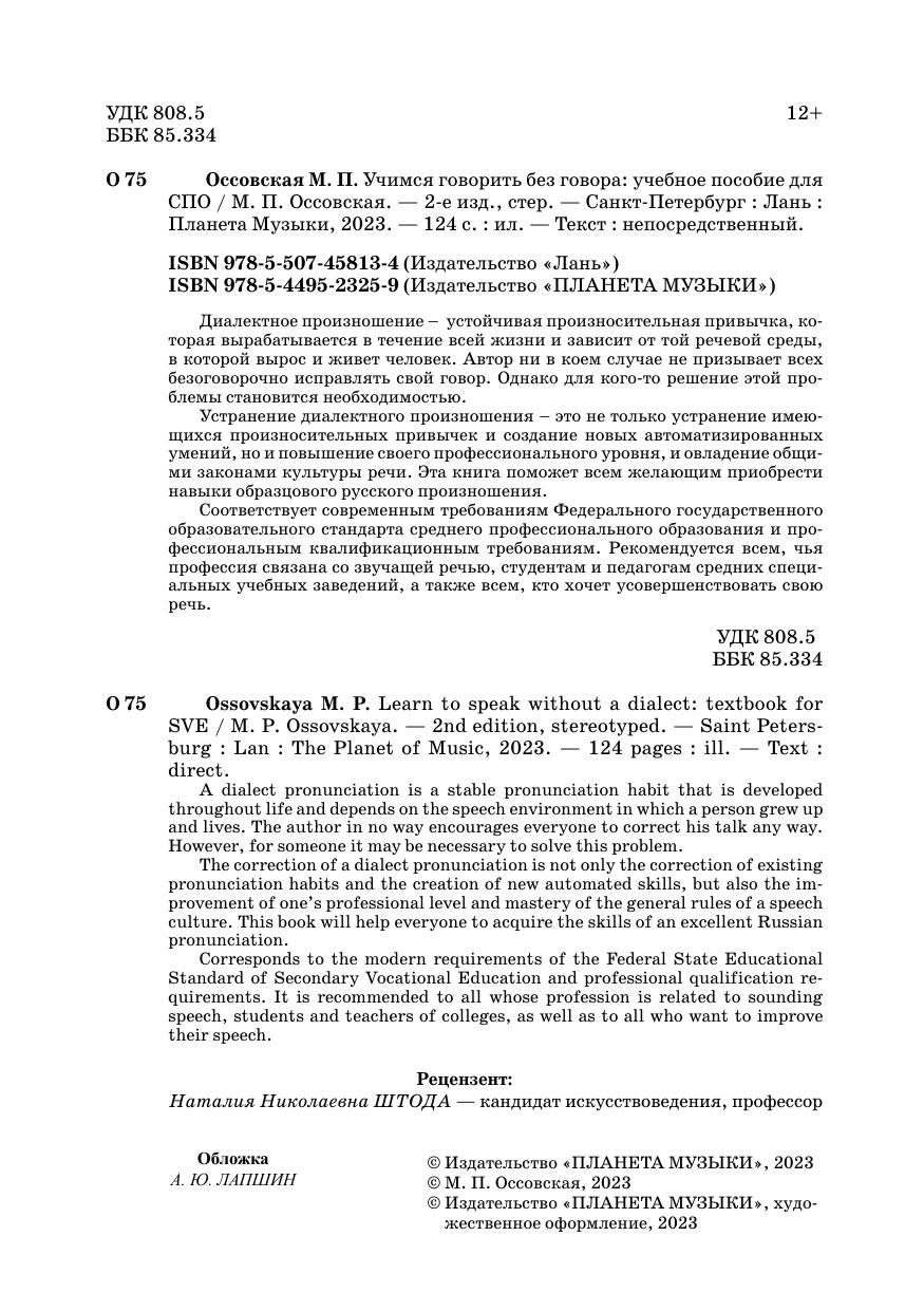The correction of a dialect pronunciation is not only the correction of existing pronunciation habits and the creation of new automated skills, but also the improvement of one’s professional level and mastery of the general rules of a speech culture. This book will help everyone to acquire the skills of an exсellent Russian pronunciation.
