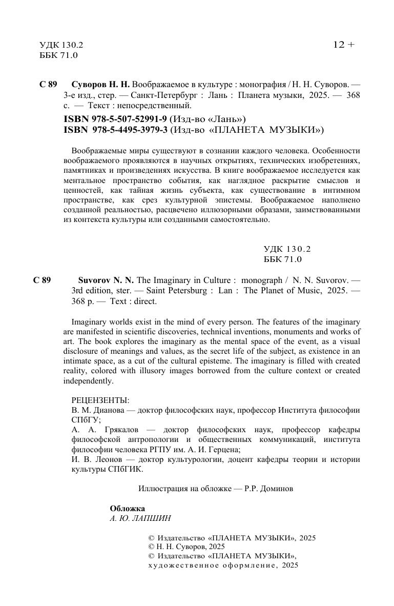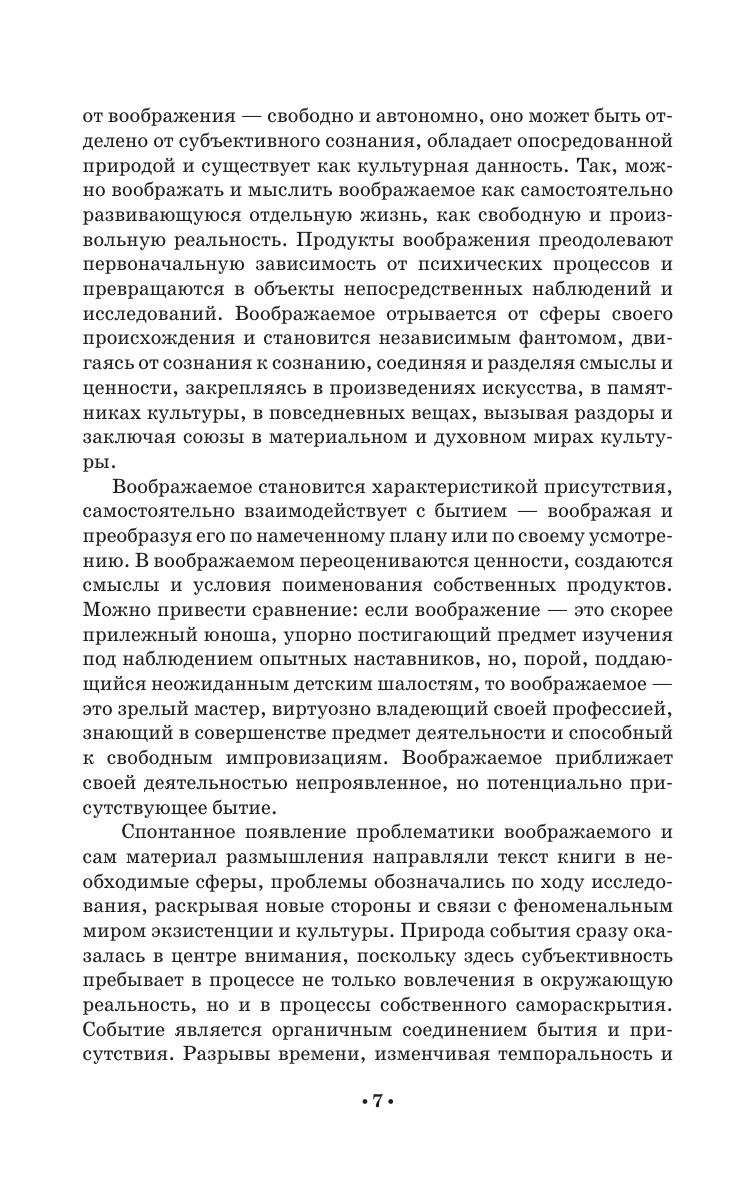 Воображаемые миры существуют в сознании каждого человека. Особенности воображаемого проявляются в научных открытиях, технических изобретениях, памятниках и произведениях искусства. В книге воображаемое исследуется как ментальное пространство события, как наглядное раскрытие смыслов и ценностей, как тайная жизнь субъекта, как существование в интимном пространстве, как срез культурной эпистемы. Воображаемое наполнено созданной реальностью, расцвечено иллюзорными образами, заимствованными из контекста культуры или созданными самостоятельно. Imaginary worlds exist in the mind of every person. The features of the imaginary are manifested in scientific discoveries, technical inventions, monuments and works of art. The book explores the imaginary as the mental space of the event, as a visual disclosure of meanings and values, as the secret life of the subject, as existence in an intimate space, as a cut of the cultural episteme. The imaginary is filled with created reality, colored with illusory images borrowed from the culture context or created independently.