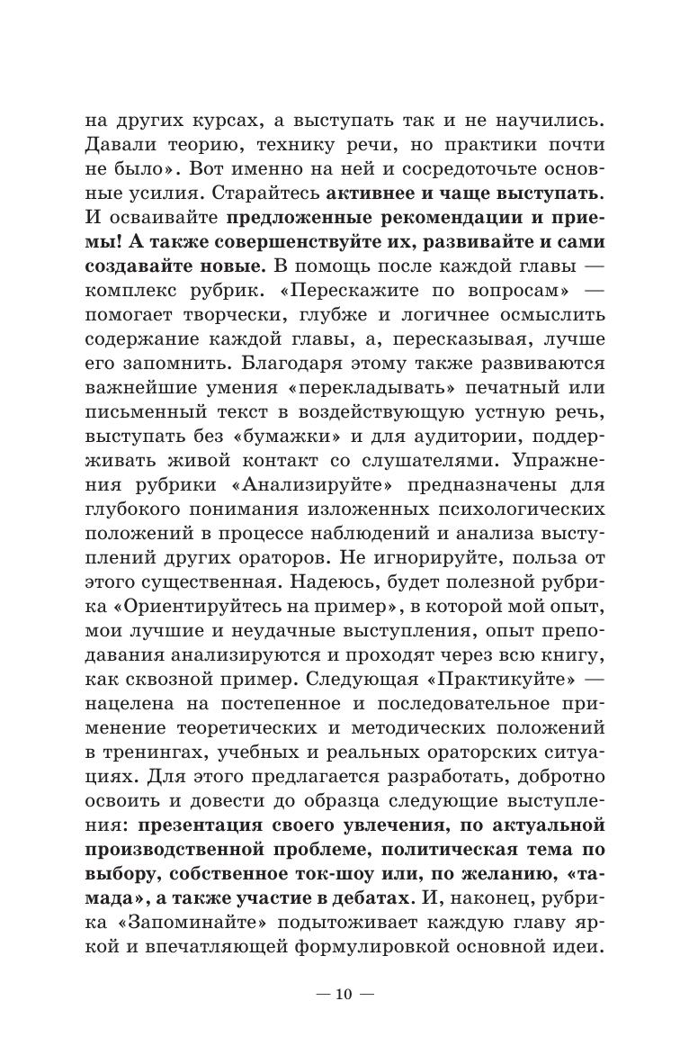 The current guide contains an original and effective methodology for teaching oratory. The main thing in it is a psychological approach that allows you to feel better and more deeply understand the oratorical processes, the specifics of the audience and the situation, which makes it possible to better manage the speech, achieving its greater effectiveness. A lot of attention is paid to bright oratorical techniques.