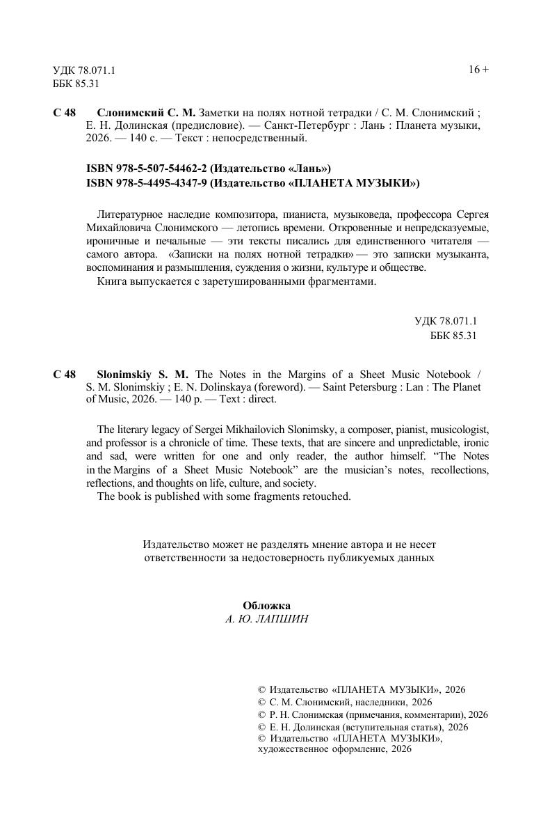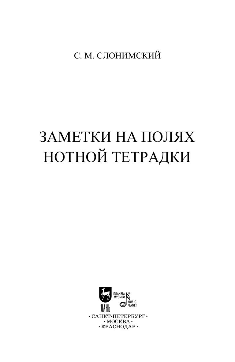 Литературное наследие композитора, пианиста, музыковеда, профессора Сергея Михайловича Слонимского — летопись времени. Откровенные и непредсказуемые, ироничные и печальные — эти тексты писались для единственного читателя — самого автора. «Записки на полях нотной тетрадки» — это записки музыканта, воспоминания и размышления, суждения о жизни, культуре и обществе. Книга выпускается с заретушированными фрагментами. The literary legacy of Sergei Mikhailovich Slonimsky, a composer, pianist, musicologist, and professor is a chronicle of time. These texts, that are sincere and unpredictable, ironic and sad, were written for one and only reader, the author himself. “The Notes in the Margins of a Sheet Music Notebook” are the musician’s notes, recollections, reflections, and thoughts on life, culture, and society. The book is published with some fragments retouched.