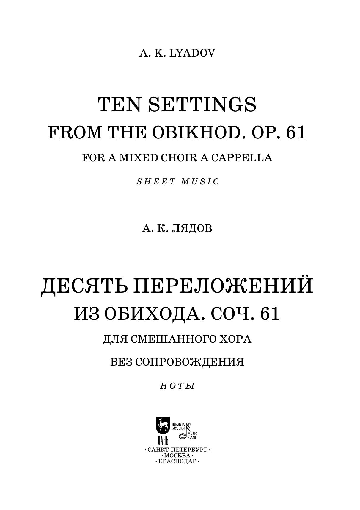 Ten Settings from the Obikhod Op. 61 by A. K. Lyadov (1855–1914) is a rare example of the composer’s addressing to the genre of sacred music. The idea came to Lyadov as early as 1881, but the first edition of the collection took place only in 1907 (according to other sources — in 1909). Most pieces of this opus are four-part choirs, except for the first (six-part) and the ninth (five-part) numbers.