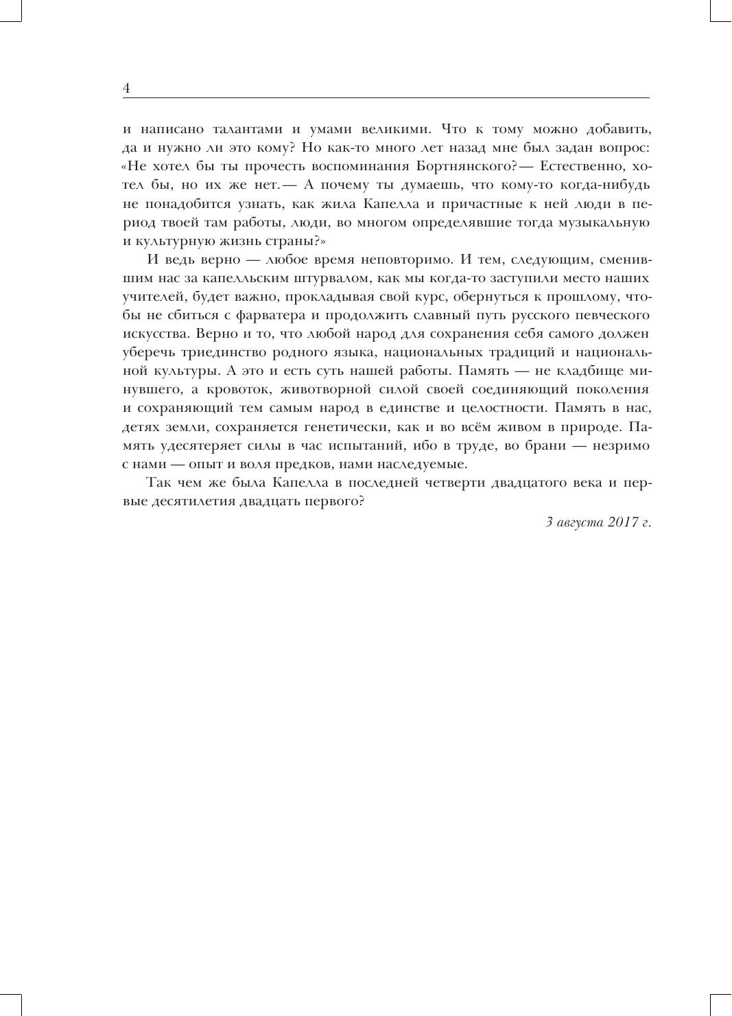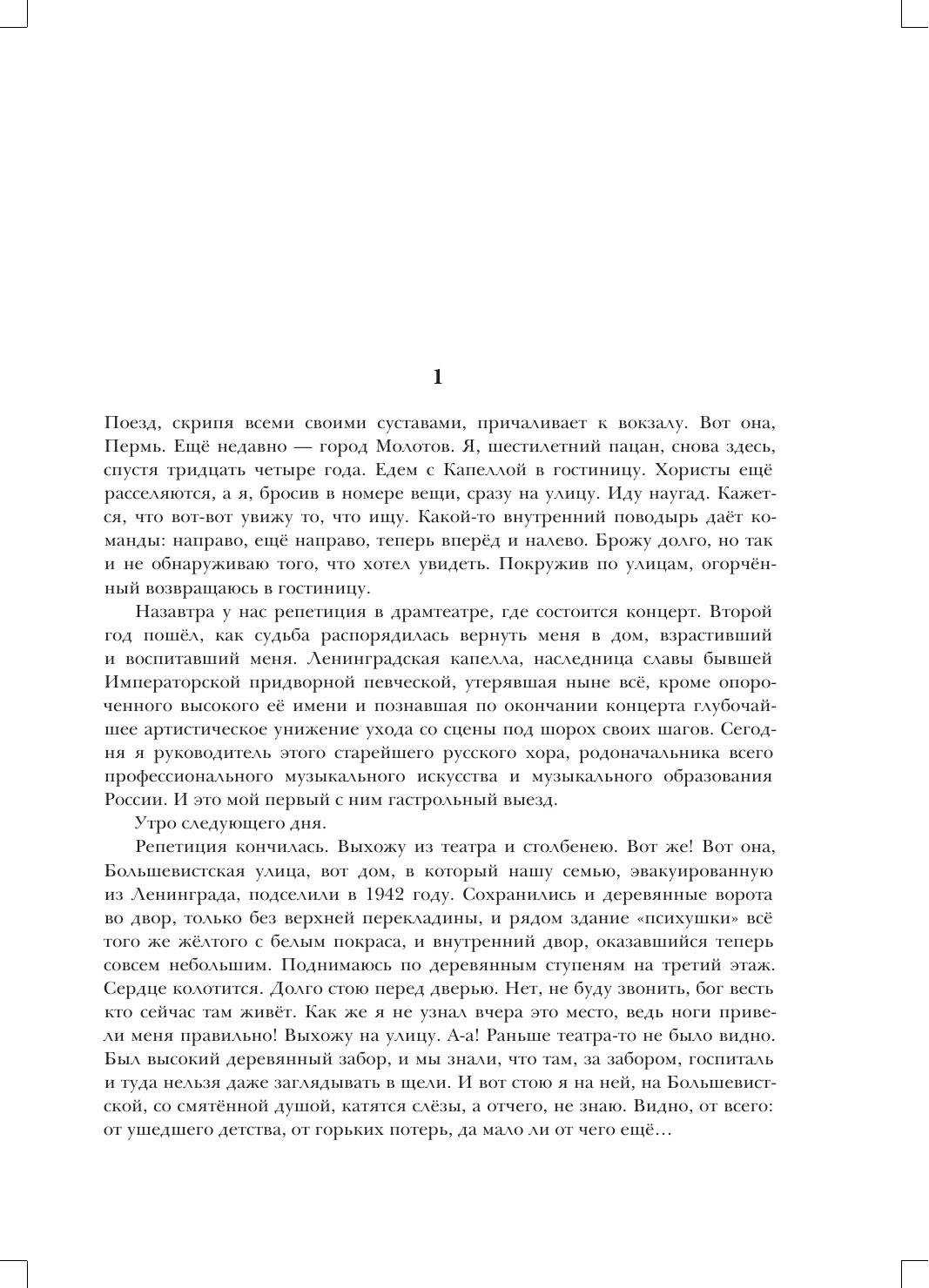 Автор не только рисует портреты выдающихся наставников, под влиянием которых происходило его формирование как музыканта, и современников, вместе с которыми ему посчастливилось творить, но, глядя через призму работы старейшего музыкального учреждения России — Петербургской капеллы, повествует о прошлом и настоящем хорового исполнительства и гуманитарного образования в России.