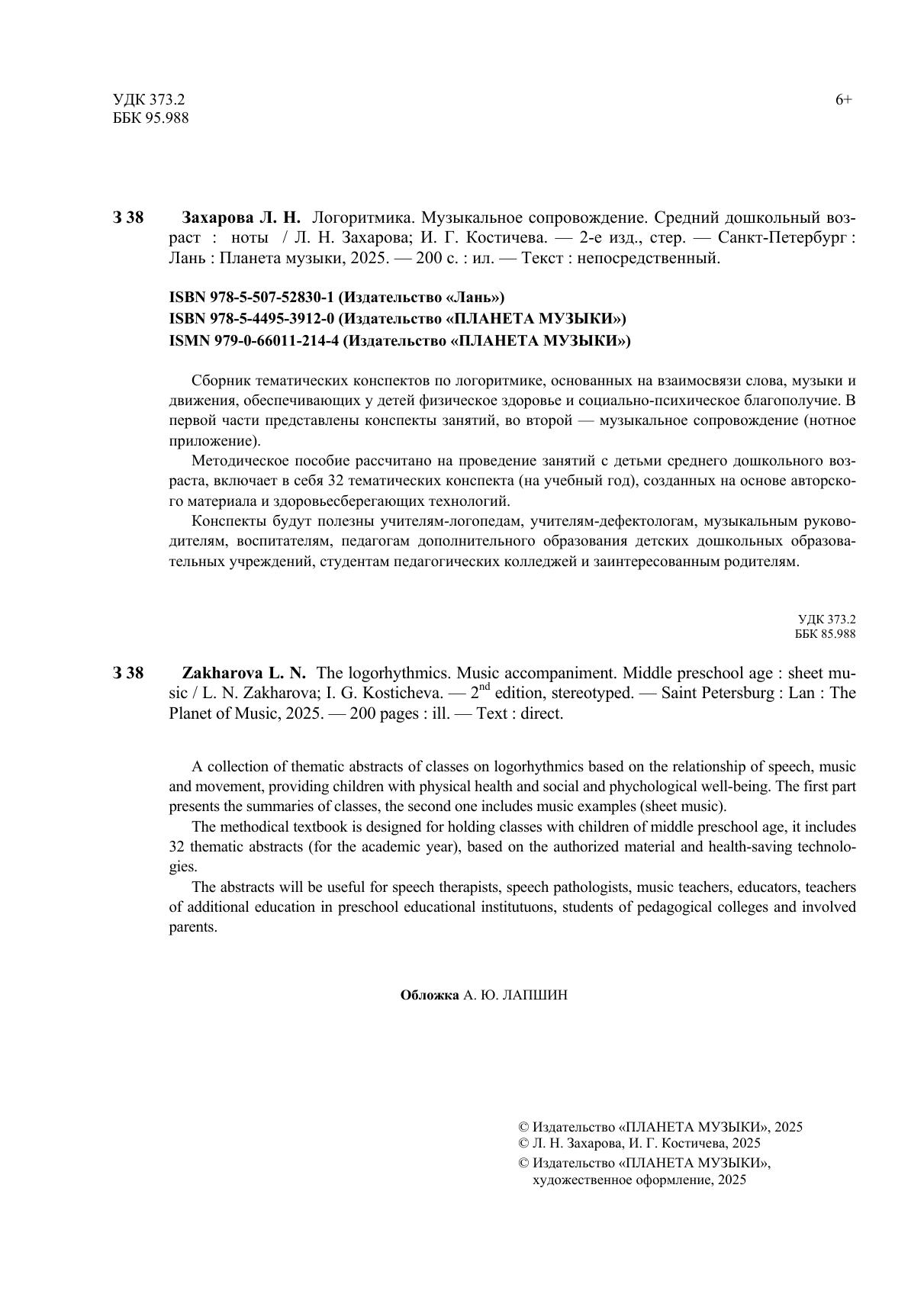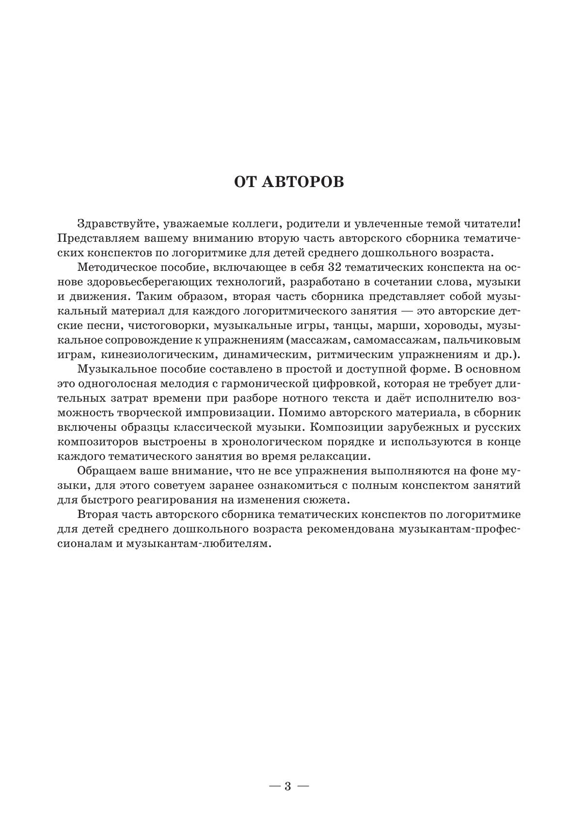 Сборник тематических конспектов по логоритмике разработанных на взаимосвязи слова, музыки и движения, обеспечивающих у детей физическое здоровье и социально-психологическое благополучие. В первой части представлены конспекты занятий, во второй — музыкальное сопровождение (нотное приложение). Методическое пособие рассчитано на проведение занятий с детьми среднего дошкольного возраста, включает в себя 32 тематических конспекта (на учебный год), созданных на основе авторского материала и здоровьесберегающих технологий. Конспекты будут полезны учителям-логопедам, учителям-дефектологам, музыкальным руководителям, воспитателям, педагогам дополнительного образования детских дошкольных образовательных учреждений, студентам педагогических колледжей и заинтересованным родителям. A collection of thematic abstracts of classes on logorhythmics based on the relationship of speech, music and movement, providing children with physical health and social and psychological well-being. The first part presents the summaries of classes, the second one includes music examples (sheet music). The methodical textbook is designed for holding classes with children of middle preschool age, it includes 32 thematic abstracts (for the academic year), based of the authorized material and health-saving technologies. The abstracts will be useful for speech therapists, speech pathologists, music teachers, educators, teachers of additional education in preschool educational institutions, students of pedagogical colleges and involved parents.