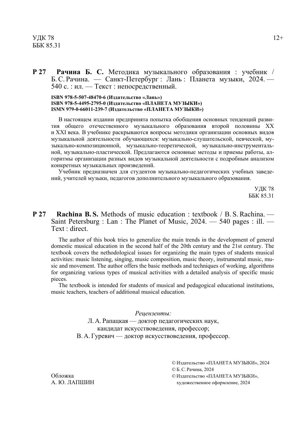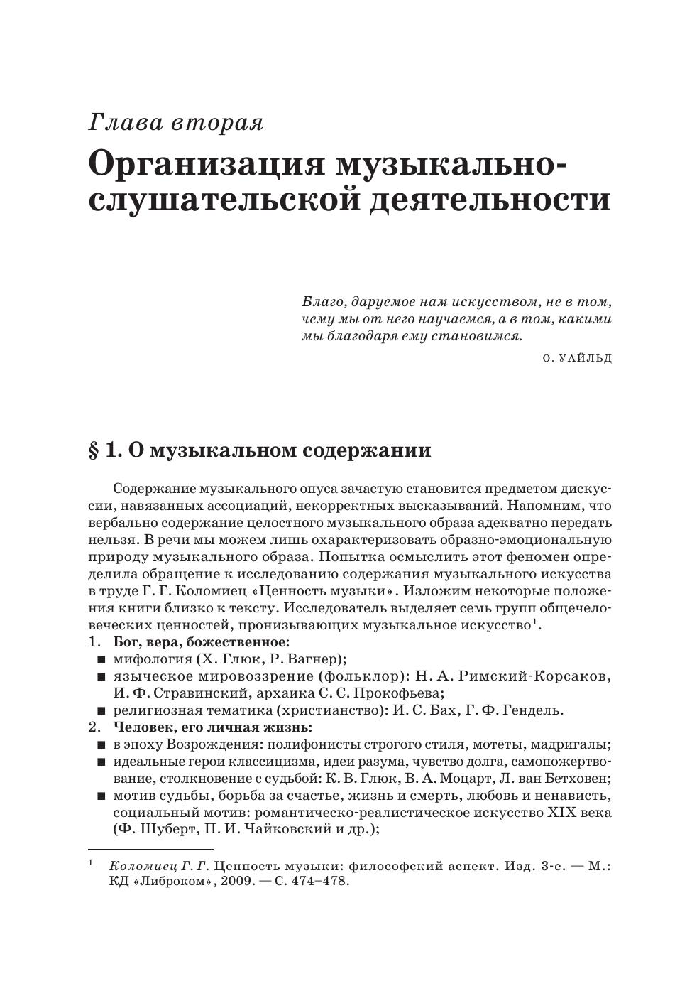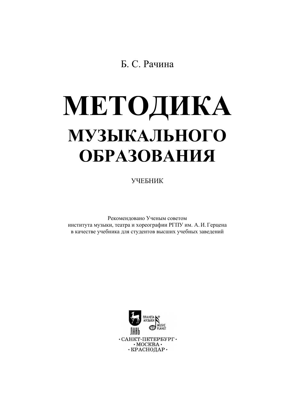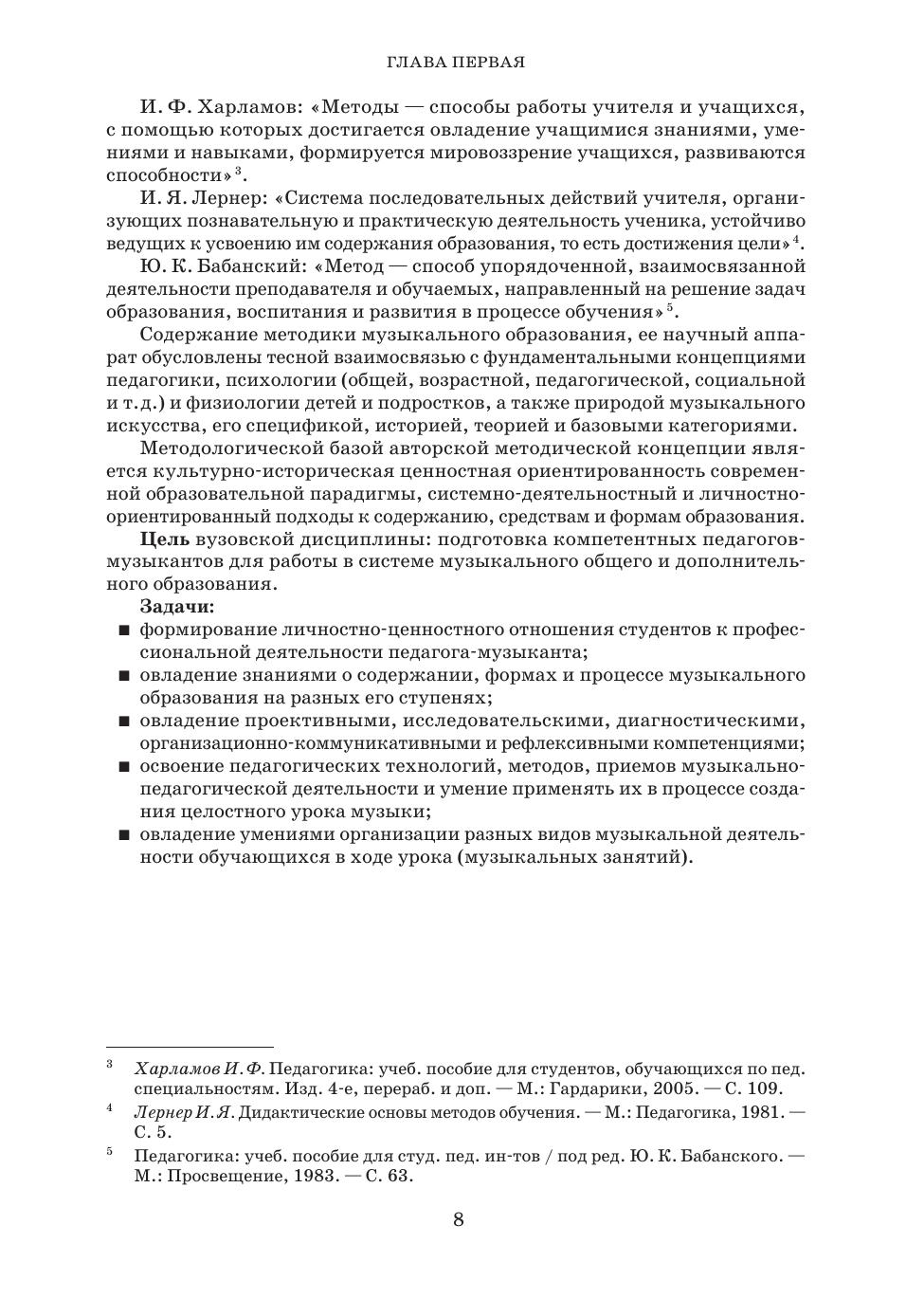 В настоящем издании предпринята попытка обобщения основных тенденций развития общего отечественного музыкального образования второй половины ХХ и ХХI века. В учебнике раскрываюся вопросы методики организации основных видов музыкальной деятельности обучающихся: музыкально-слушательской, певческой, музыкально-композиционной, музыкально-теоретической, музыкально-инструментальной, музыкально-пластической. Предлагаются основные методы и приемы работы, алгоритмы организации разных видов музыкальной деятельности с подробным анализом конкретных музыкальных произведений. Учебник предназначен для студентов музыкально-педагогических учебных заведений, учителей музыки, педагогов дополнительного музыкального образования. The author of this book tries to generalize the main trends in the development of general domestic musical education in the second half of the 20th century and the 21st century. The textbook covers the nethodological issues for organizing the main types of students musical activities: music listening, singing, music composition, music theory, instrumental music, music and movement. The author offers the basic methods and techniques of working, algorithms for organizing various types of musical activities with a detailed analysis of specific music pieces. The textbook is intended for students of musical and pedagogical educational institutions, music teachers, teachers of additional musical education.