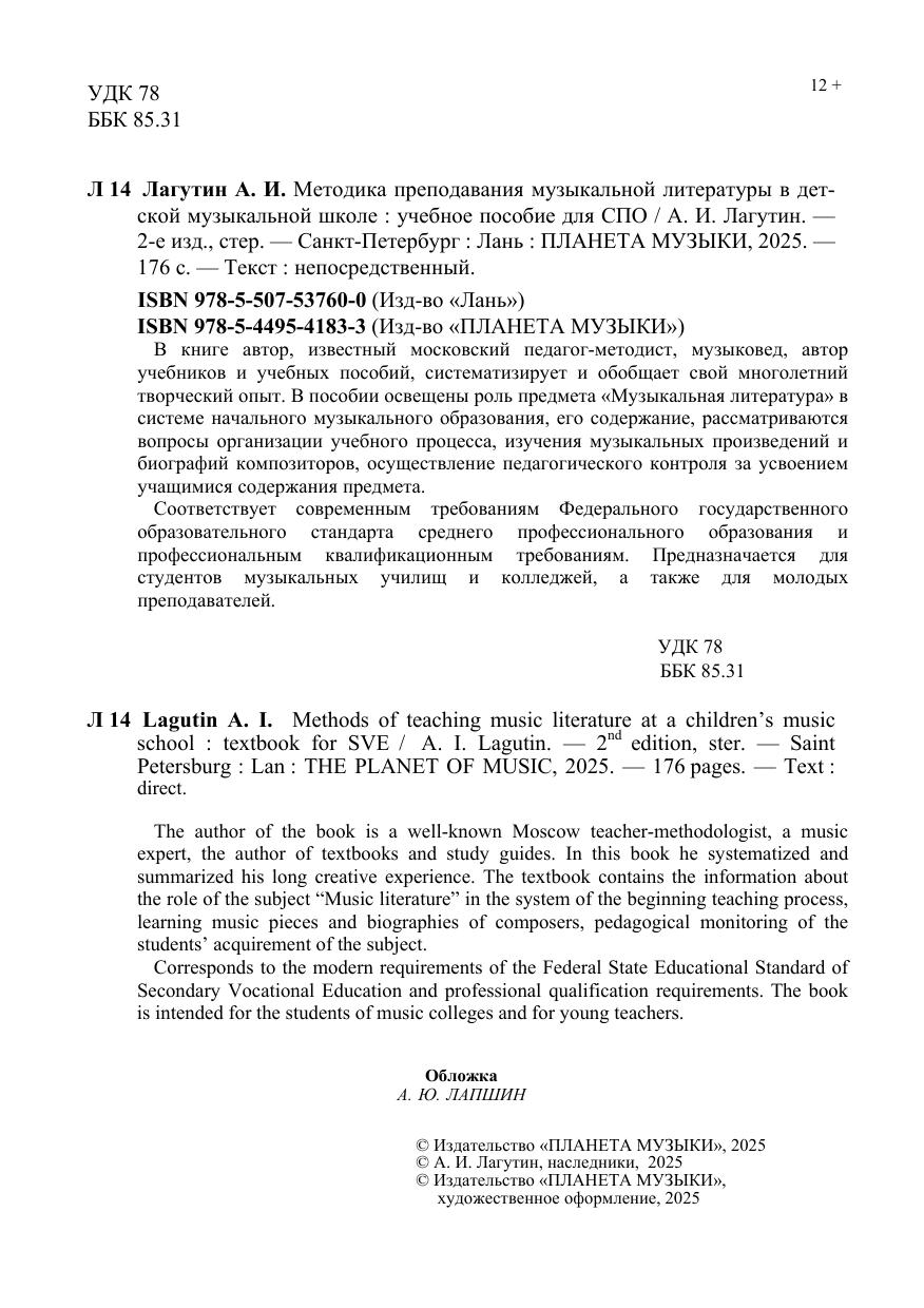 В книге автор, известный московский педагог-методист, музыковед, автор учебников и учебных пособий, систематизирует и обобщает свой многолетний творческий опыт. В пособии освещены роль предмета "Музыкальная литература" в системе начального музыкального образования, его содержание, рассматриваются вопросы организации учебного процесса, изучения музыкальных произведений и биографий композиторов, осуществлени педагогического контроля за усвоением учащимися содержания предмета. Предназначается для студентов музыкальных училищ и колледжей, а также для молодых преподавателей. The author of the book is a well-known Moscow teacher-methodologist, a music expert, the author of textbooks and study guides. In this book he systematized and summarized his long creative experience. The textbook contains the information about the role of the subject “Music literature” inthe system of the beginning teaching process, learning music pieces and biographies of composers, pedagogical monitoring of the students’ acquirement of the subject. The book is intended for the students of music colleges and for young teachers.