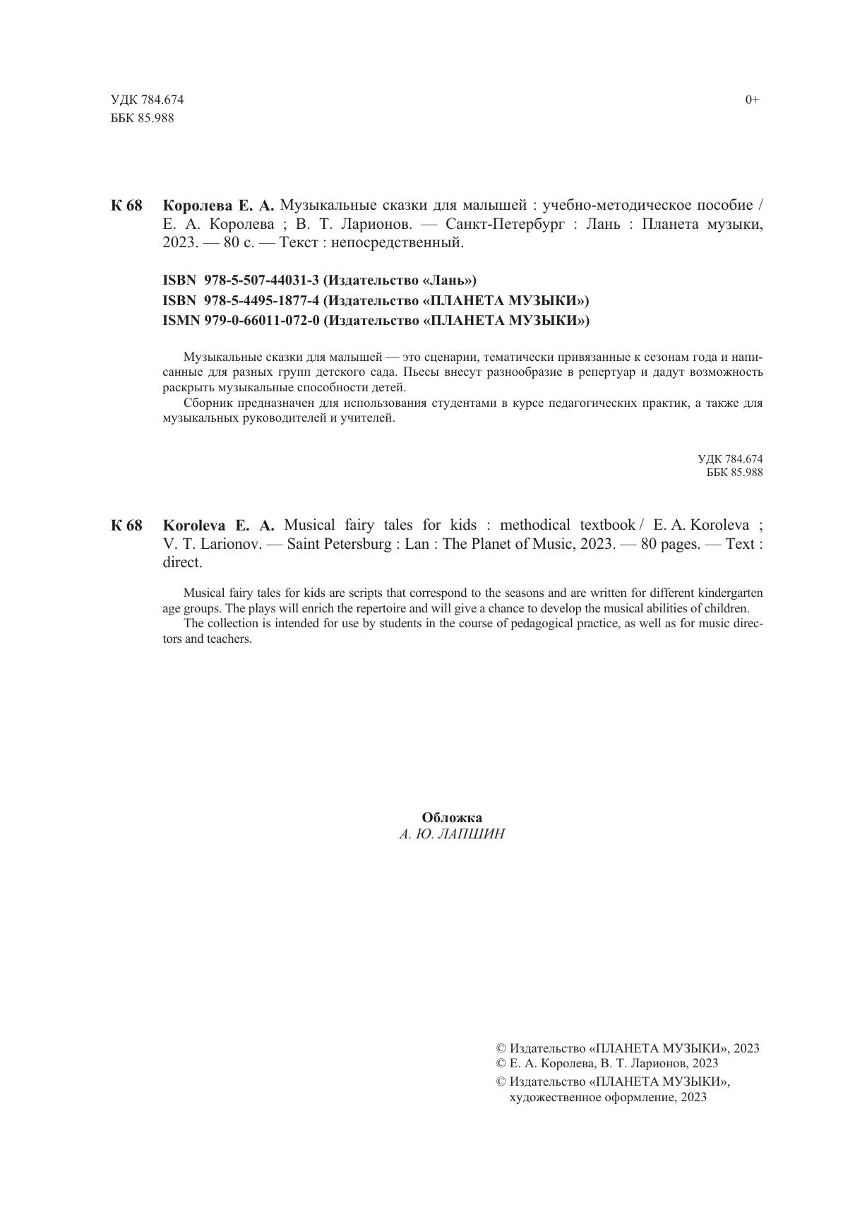 Музыкальные сказки для малышей — это сценарии, тематически привязанные к сезонам года и написанные для разных групп детского сада. Пьесы внесут разнообразие в репертуар и дадут возможность раскрыть музыкальные способности детей. Сборник предназначен для использования студентами в курсе педагогических практик, а также для музыкальных руководителей и учителей. Musical fairy tales for kids are scripts that correspond to the seasons and are written for different kindergarten age groups. The plays will enrich the repertoire and will give a chance to develop the musical abilities of children. The collection is intended for use by students in the course of pedagogical practice, as well as for music directors and teachers.