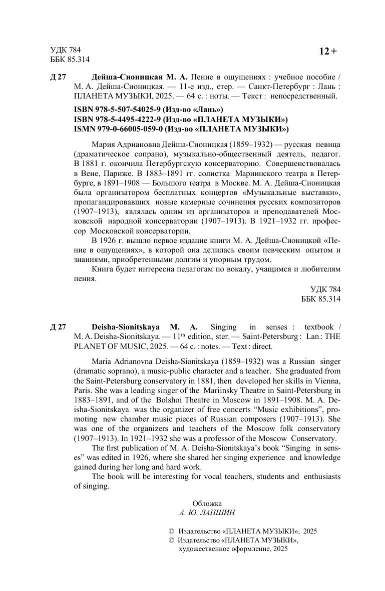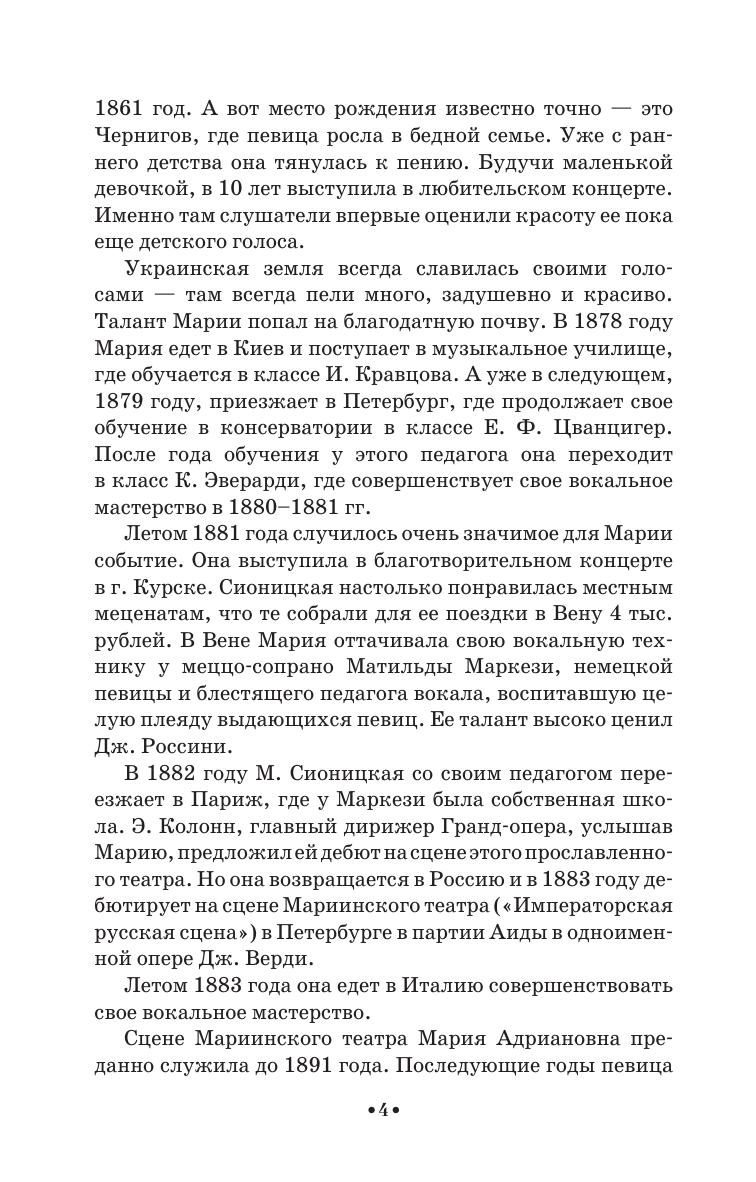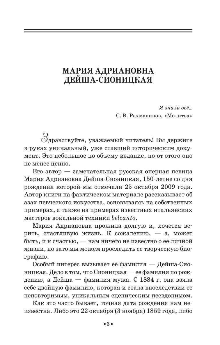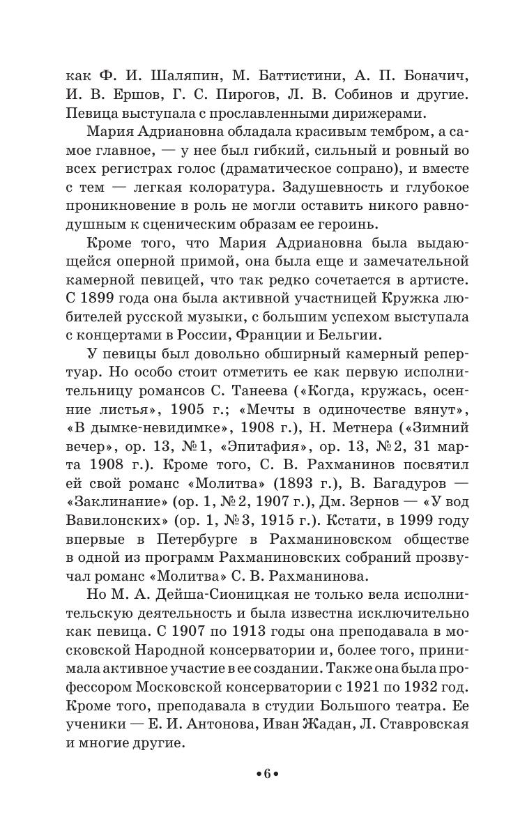 Мария Адриановна Дейша-Сионицкая (1859–1932) — русская певица (драматическое сопрано), музыкально-общественный деятель, педагог. В 1881 г. окончила Петербургскую консерваторию. Совершенствовалась в Вене, Париже. В 1883–1891 гг. солистка Мариинского театра в Петербурге, в 1891–1908 — Большого театра в Москве. М. А. Дейша-Сионицкая была организатором бесплатных концертов «Музыкальные выставки», пропагандировавших новые камерные сочинения русских композиторов (1907–1913), являлась одним из организаторов и преподавателей Московской народной консерватории (1907–1913). В 1921–1932 гг. профессор Московской консерватории. В 1926 г. вышло первое издание книги М. А. Дейша-Сионицкой «Пение в ощущениях», в которой она делилась своим певческим опытом и знаниями, приобретенными долгим и упорным трудом. Книга будет интересна педагогам по вокалу, учащимя и любителям пения.