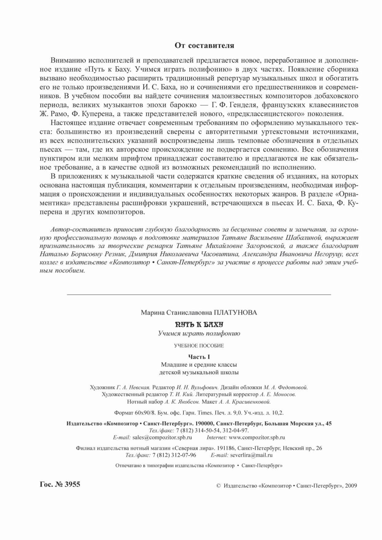 Вниманию исполнителей и преподавателей предлагается издание «Путь к Баху. Учимся играть полифонию» в двух частях. Появление сборника вызвано необходимостью расширить традиционный репертуар музыкальных школ и обогатить его не только произведениями И. С. Баха, но и сочинениями его предшественников и современников. В учебном пособии вы найдете сочинения малоизвестных композиторов добаховского периода, великих музыкантов эпохи барокко — Г. Ф. Генделя, французских клавесинистов Ж. Рамо, Ф. Куперена, а также представителей нового, «предклассицистского» поколения. Настоящее издание отвечает современным требованиям по оформлению музыкального текста: большинство из произведений сверены с авторитетными уртекстовыми источниками, из всех исполнительских указаний воспроизведены лишь темповые обозначения в отдельных пьесах — там, где их авторское происхождение не подвергается сомнению. Все обозначения пунктиром или мелким шрифтом принадлежат составителю и предлагаются не как обязательное требование, а в качестве одной из возможных рекомендаций по исполнению.