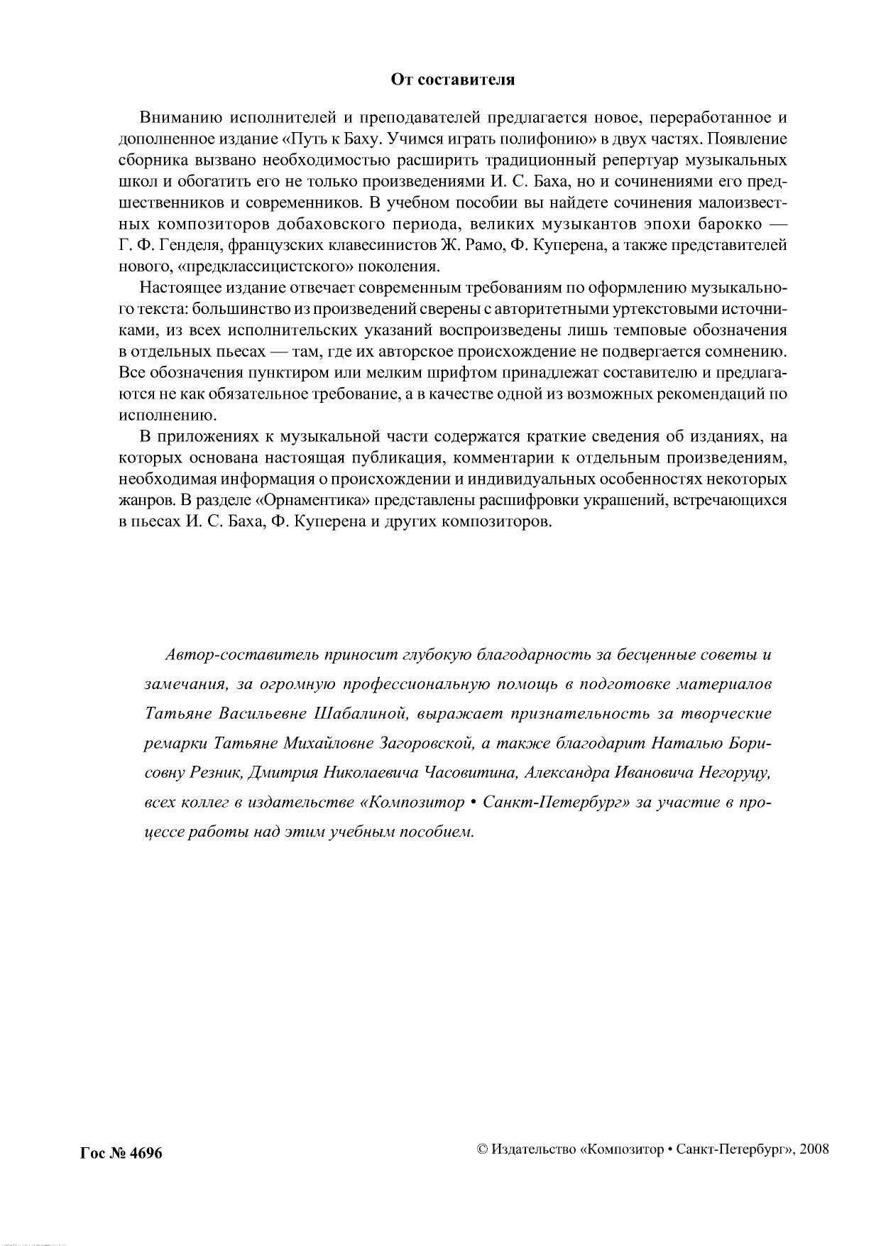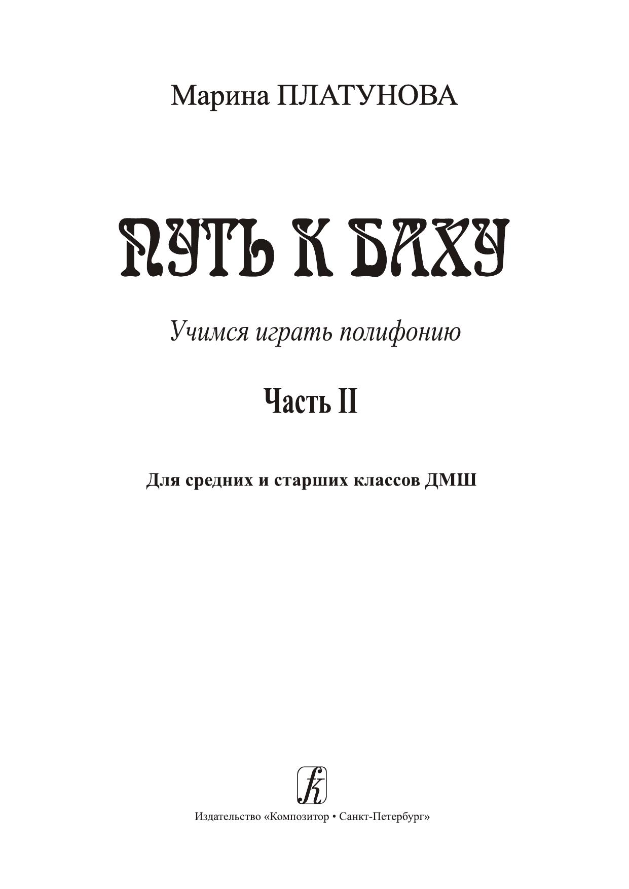 Вниманию исполнителей и преподавателей предлагается издание «Путь к Баху. Учимся играть полифонию» в двух частях. Появление сборника вызвано необходимостью расширить традиционный репертуар музыкальных школ и обогатить его не только произведениями И. С. Баха, но и сочинениями его предшественников и современников. В учебном пособии вы найдете сочинения малоизвестных композиторов добаховского периода, великих музыкантов эпохи барокко — Г. Ф. Генделя, французских клавесинистов Ж. Рамо, Ф. Куперена, а также представителей нового, «предклассицистского» поколения. Настоящее издание отвечает современным требованиям по оформлению музыкального текста: большинство из произведений сверены с авторитетными уртекстовыми источниками, из всех исполнительских указаний воспроизведены лишь темповые обозначения в отдельных пьесах — там, где их авторское происхождение не подвергается сомнению. Все обозначения пунктиром или мелким шрифтом принадлежат составителю и предлагаются не как обязательное требование, а в качестве одной из возможных рекомендаций по исполнению.