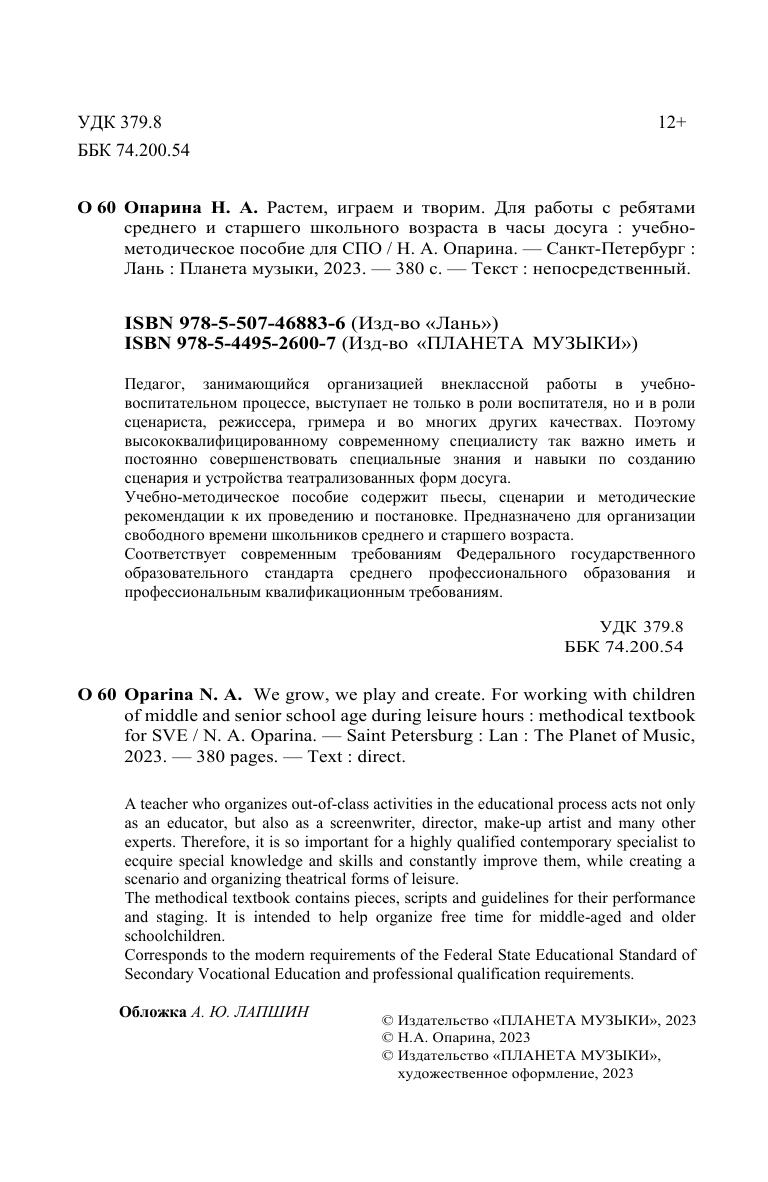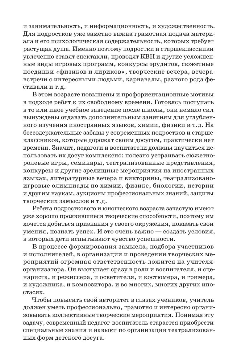 Педагог, занимающийся организацией внеклассной работы в учебно-воспитательном процессе, выступает не только в роли воспитателя, но и в роли сценариста, режиссера, гримера и во многих других качествах. Поэтому высококвалифицированному современному специалисту так важно иметь и постоянно совершенствовать специальные знания и навыки по созданию сценария и устройства театрализованных форм досуга Учебно-методическое пособие содержит пьесы, сценарии и методические рекомендации к их проведению и постановке. Предназначено для организации свободного времени школьников среднего и старшего возраста. Соответствует современным требованиям Федерального государственного образовательного стандарта среднего профессионального образования и профессиональным квалификационным требованиям. A teacher who organizes out-of-class activities in the educational process acts not only as an educator, but also as a screenwriter, director, make-up artist and many other experts. Therefore, it is so important for a highly qualified contemporary specialist to ecquire special knowledge and skills and constantly improve them, while creating a scenario and organizing theatrical forms of leisure. The methodical textbook contains pieces, scripts and guidelines for their performance and staging. It is intended to help organize free time for middle-aged and older schoolchildren. Corresponds to the modern requirements of the Federal State Educational Standard of Secondary Vocational Education and professional qualification requirements.