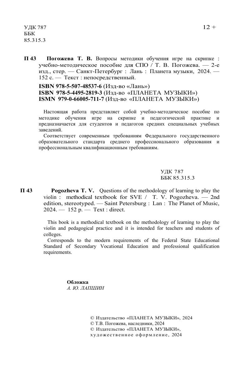 Настоящая работа представляет собой учебно-методическое пособие по методике обучения игре на скрипке и педагогической практике и предназначается для студентов и педагогов средних специальных учебных заведений. Соответствует современным требованиям Федерального государственного образовательного стандарта среднего профессионального образования и профессиональным квалификационным требованиям. This book is a methodical textbook on the methodology of learning to play the violin and pedagogical practice and it is intended for teachers and students of colleges. Corresponds to the modern requirements of the Federal State Educational Standard of Secondary Vocational Education and professional qualification requirements.