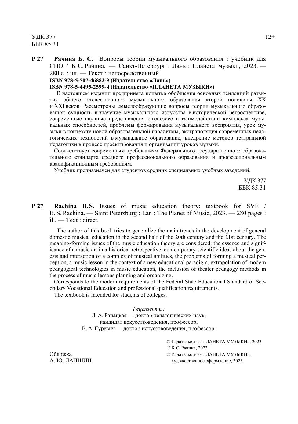 В настоящем издании предпринята попытка обобщения основных тенденций развития общего отечественного музыкального образования второй половины ХХ и ХХI века. Рассмотрены смыслобразующие вопросы теории музыкального образования: сущность и значение музыкального искусства в исторической ретроспективе, современные научные представления о генезисе и взаимодействии комплекса музыкальных способностей, проблемы формирования музыкального восприятия, урок музыки в контексте новой образовательной парадигмы, экстраполяция современных педагогических технологий в музыкальное образование, внедрение методов театральной педагогики в процесс проектирования и организацию уроков музыки. Соответствует современным требованиям Федерального государственного образовательного стандарта среднего профессионального образования и профессиональным квалификационным требованиям. Учебник предназначен для студентов средних специальных учебных заведений. The author of this book tries to generalize the main trends in the development of general domestic musical education in the second half of the 20th century and the 21st century. The meaningforming issues of the music education theory are considered: the essence and significance of a music art in a historical retrospective, contemporary scientific ideas about the genesis and interaction of a complex of musical abilities, the problems of forming a musical perception, a music lesson in the context of a new educational paradigm, extrapolation of modern pedagogical technologies in music education, the inclusion of theater pedagogy methods in the process of music lessons planning and organizing. Corresponds to the modern requirements of the Federal State Educational Standard of Secondary Vocational Education and professional qualification requirements. The textbook is intended for students of colleges.