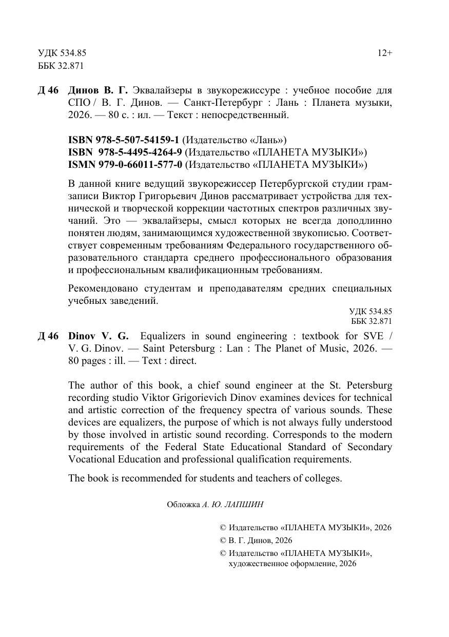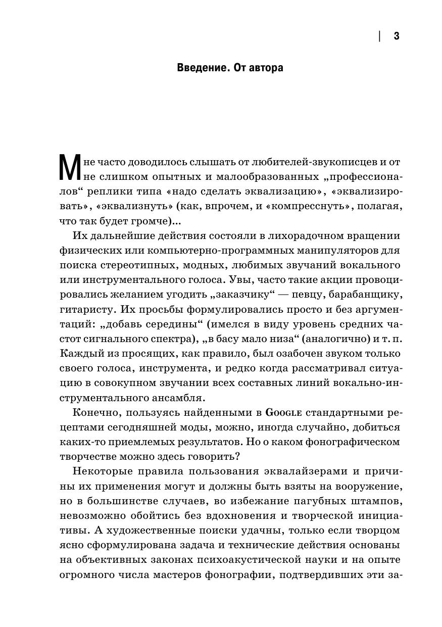 В данной книге ведущий звукорежиссёр Петербургской студии грамзаписи Виктор Григорьевич Динов рассматривает устройства для технической и творческой коррекции частотных спектров различных звучаний. Это — эквалайзеры, смысл которых не всегда доподлинно понятен людям, занимающимся художественной звукописью. Соответствует современным требованиям Федерального государственного образовательного стандарта среднего профессионального образования и профессиональным квалификационным требованиям. Рекомендовано студентам и преподавателям средних специальных учебных заведений. The author of this book, a chief sound engineer at the St. Petersburg recording studio Viktor Grigorievich Dinov examines devices for technical and artistic correction of the frequency spectra of various sounds. These devices are equalizers, the purpose of which is not always fully understood by those involved in artistic sound recording. Corresponds to the modern requirements of the Federal State Educational Standard of Secondary Vocational Education and professional qualification requirements. The book is recommended for students and teachers of colleges.