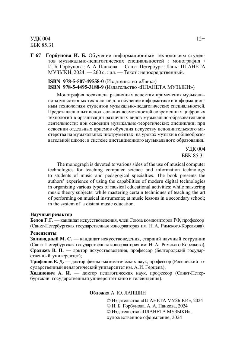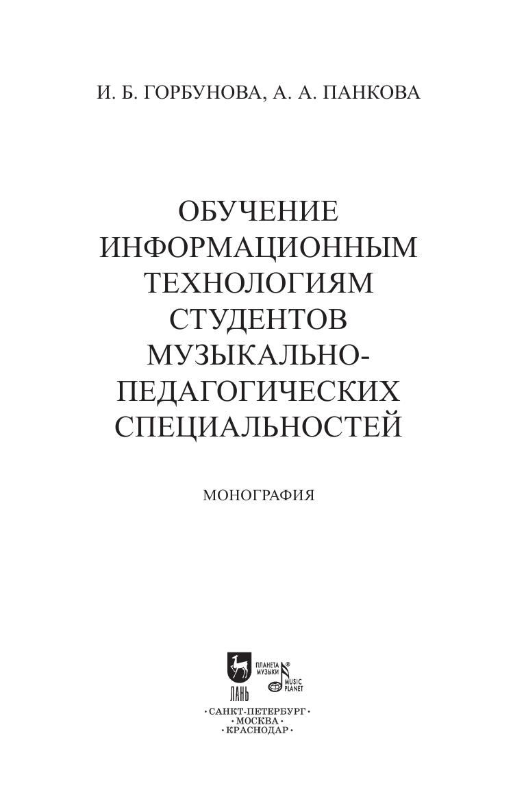 Монография посвящена различным аспектам применения музыкально-компьютерных технологий для обучение информатике и информационным технологиям студентов музыкально-педагогических специальностей. Представлен опыт использования возможностей современных цифровых технологий в организации различных видов музыкально-образовательной деятельности: при освоении музыкально-теоретических дисциплин, при освоении отдельных приёмов обучения искусству исполнительского мастерства на музыкальных инструментах, на уроках музыки в общеобразовательной школе, в системе дистанционного музыкального образования. The monograph is devoted to various sides of the use of musical computer technologies for teaching computer science and information technology to students of music and pedagogical specialties. The book presents the authors’ experience of using the capabilities of modern digital technologies in organizing various types of musical educational activities: while mastering music theory subjects, while mastering certain techniques of teaching the art of performing on musical instruments, at music lessons in a secondary school, in the system of a distant music education.
