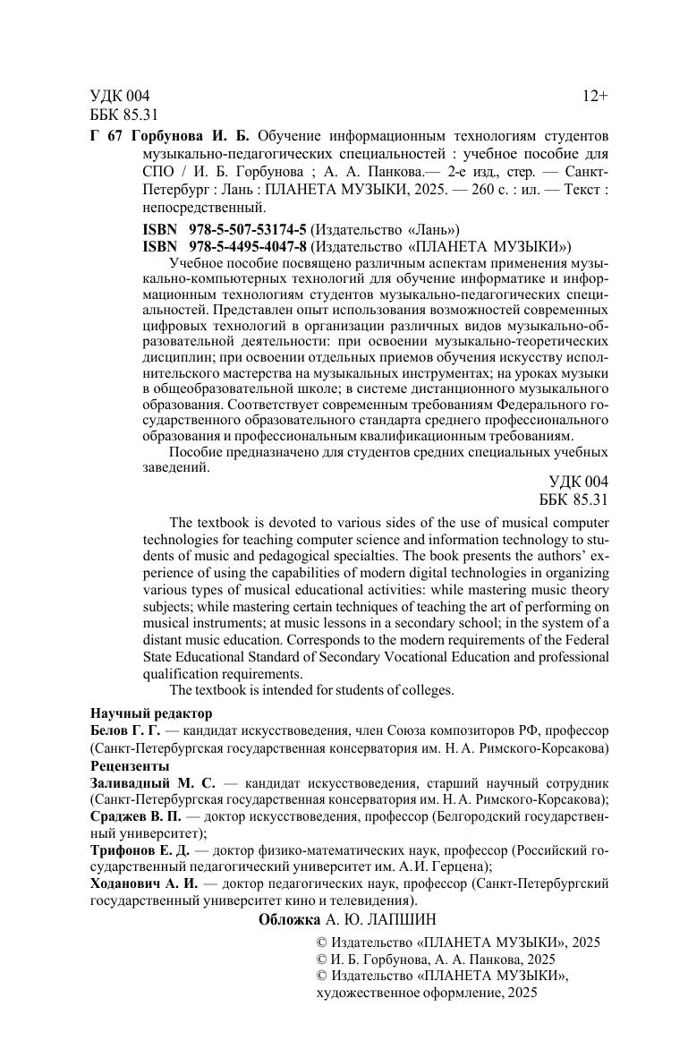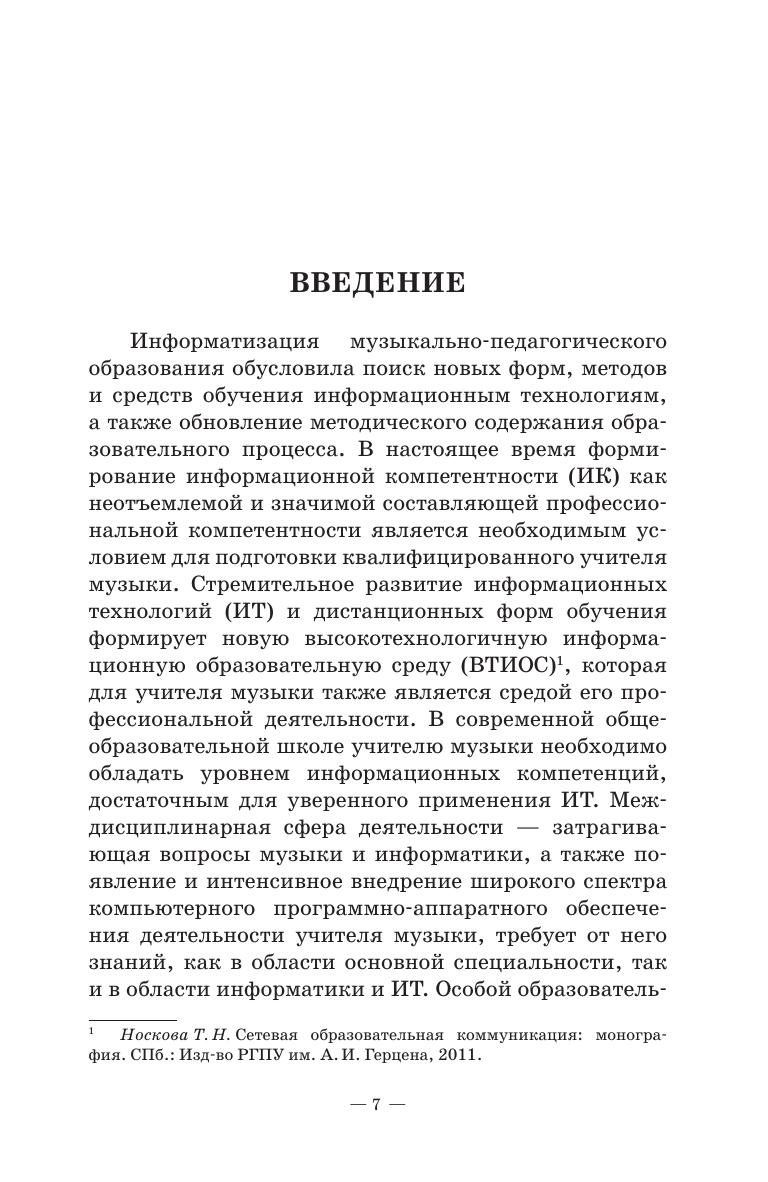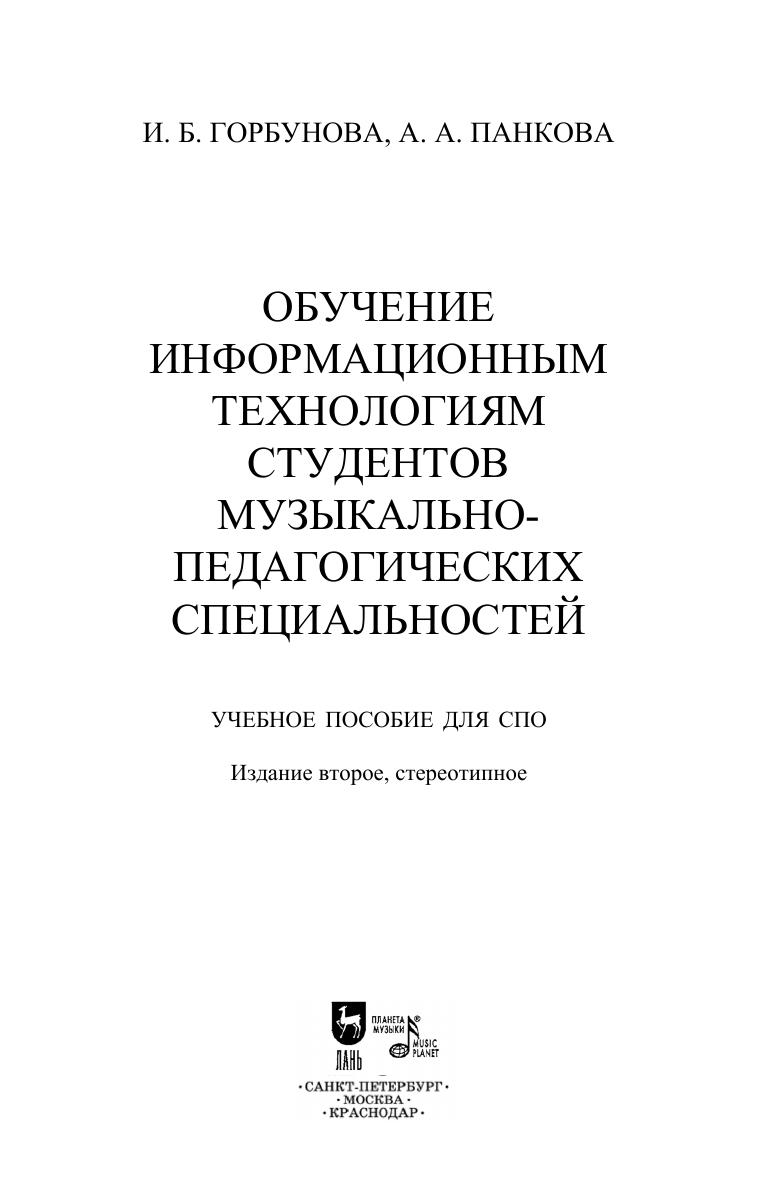 Учебное пособие посвящено различным аспектам применения музыкально-компьютерных технологий для обучение информатике и информационным технологиям студентов музыкально-педагогических специальностей. Представлен опыт использования возможностей современных цифровых технологий в организации различных видов музыкально-образовательной деятельности: при освоении музыкально-теоретических дисциплин, при освоении отдельных приёмов обучения искусству исполнительского мастерства на музыкальных инструментах, на уроках музыки в общеобразовательной школе, в системе дистанционного музыкального образования.Соответствует современным требованиям Федерального государственного образовательного стандарта среднего профессионального образования и профессиональным квалификационным требованиям. Пособие предназначено для студентов средних специальных учебных заведений. The textbook is devoted to various sides of the use of musical computer technologies for teaching computer science and information technology to students of music and pedagogical specialties. The book presents the authors’ experience of using the capabilities of modern digital technologies in organizing various types of musical educational activities: while mastering music theory subjects, while mastering certain techniques of teaching the art of performing on musical instruments, at music lessons in a secondary school, in the system of a distant music education. Corresponds to the modern requirements of the Federal State Educational Standard of Secondary Vocational Education and professional qualification requirements. The textbook is intended for students of colleges.