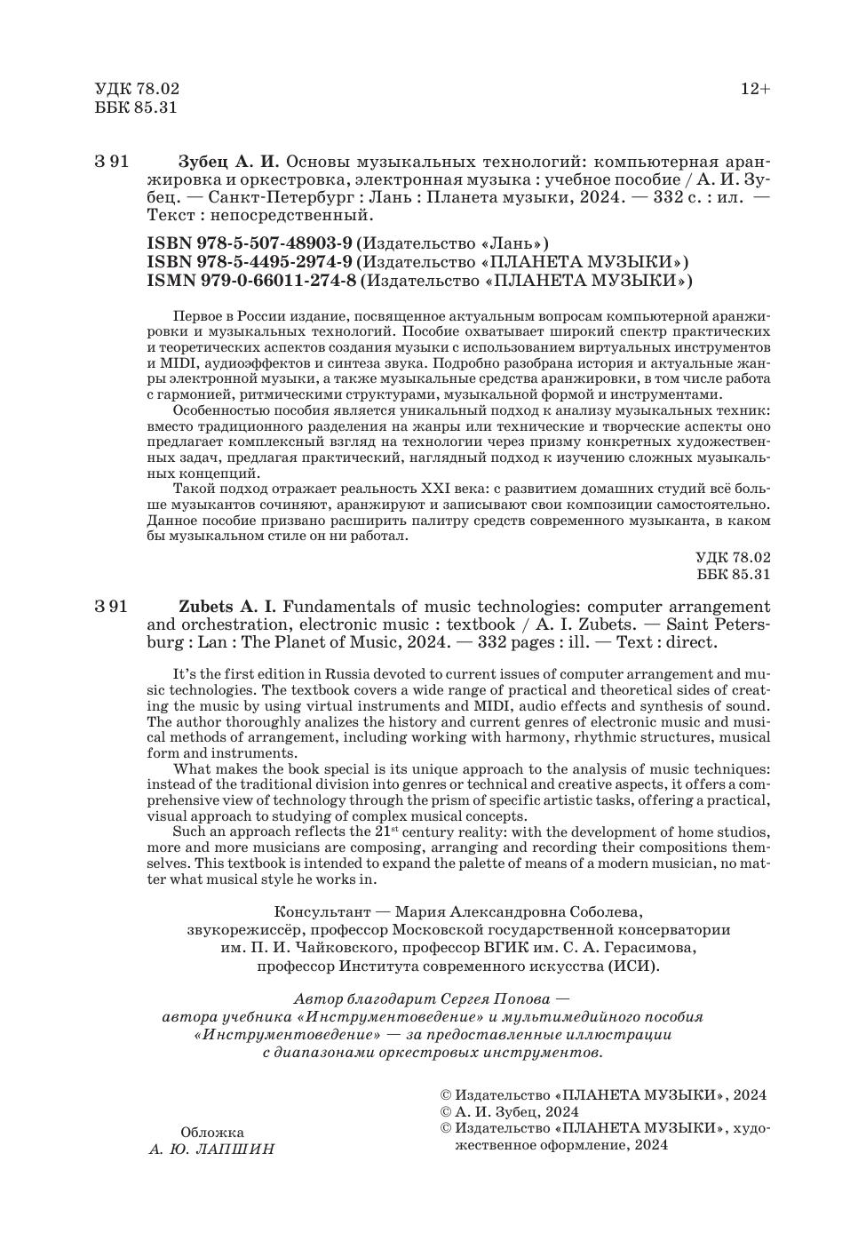 Первое в России издание, посвященное актуальным вопросам компьютерной аранжировки и музыкальных технологий. Пособие охватывает широкий спектр практических и теоретических аспектов создания музыки с использованием виртуальных инструментов и MIDI, аудио эффектов и синтеза звука. Подробно разобрана история и актуальные жанры электронной музыки, а также музыкальные средства аранжировки, в том числе работа с гармонией, ритмическими структурами, музыкальной формой и инструментами. Особенностью пособия является уникальный подход к анализу музыкальных техник: вместо традиционного разделения на жанры или технические и творческие аспекты, оно предлагает комплексный взгляд на технологии через призму конкретных художественных задач, предлагая практический, наглядный подход к изучению сложных музыкальных концепций. Такой подход отражает реальность 21-го века: с развитием домашних студий всё больше музыкантов сочиняет, аранжирует и записывает свои композиции самостоятельно. Данное пособие призвано расширить палитру средств современного музыканта, в каком бы музыкальном стиле он ни работал. It’s the first edition in Russia devoted to current issues of computer arrangement and music technologies. The textbook covers a wide range of practical and theoretical sides of creating the music by using virtual instruments and MIDI, audio effects and synthesis of sound. The author thoroughly analizes the history and current genres of electronic music and musical methods of arrangement, including working with harmony, rhythmic structures, musical form and instruments. What makes the book special is its unique approach to the analysis of music techniques: instead of the traditional division into genres or technical and creative aspects, it offers a comprehensive view of technology through the prism of specific artistic tasks, offering a practical, visual approach to studying of complex musical concepts. Such an approach reflects the 21st century reality: with the development of home studios, more and more musicians are composing, arranging and recording their compositions themselves. This textbook is intended to expand the palette of means of a modern musician, no matter what musical style he works in.