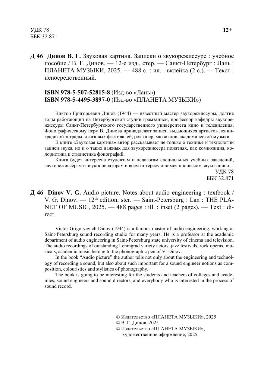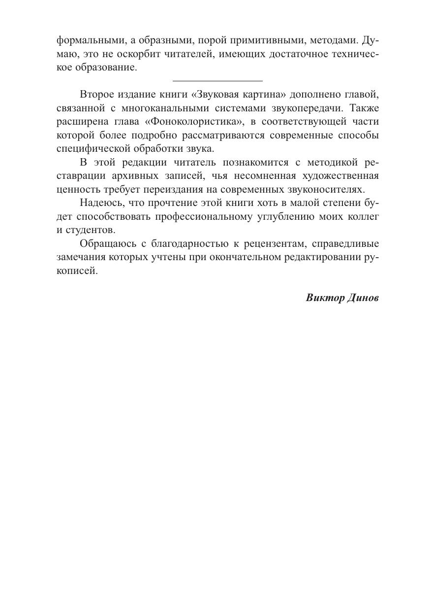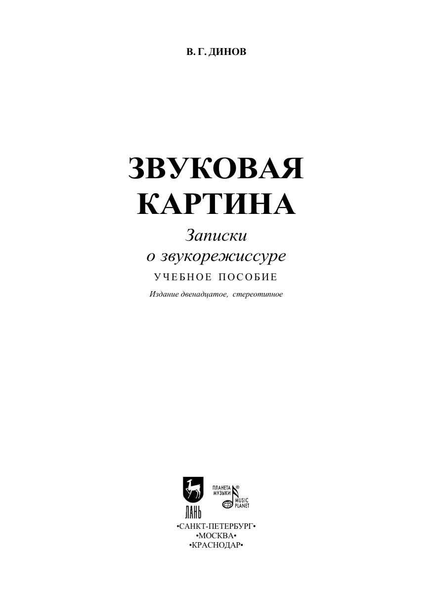 Виктор Григорьевич Динов (1944) — известный мастер звукорежиссуры, долгие годы работающий на Петербургской студии грамзаписи, профессор кафедры звукорежиссуры Санкт-Петербургского государственного университета кино и телевидения. Фонографическому перу В. Динова принадлежат записи выдающихся артистов ленинградской эстрады, джазовых фестивалей, рок-опер, мюзиклов, академической музыки. В книге «Звуковая картина» автор рассказывает не только о технике и технологии записи звука, но и о таких важных для звукорежиссера понятиях как композиция, колористика и стилистика фонографий. Книга будет интереса студентам и педагогам специальных учебных заведений, звукорежиссерам и звукооператорам и всем интересующимся процессом звукозаписи.