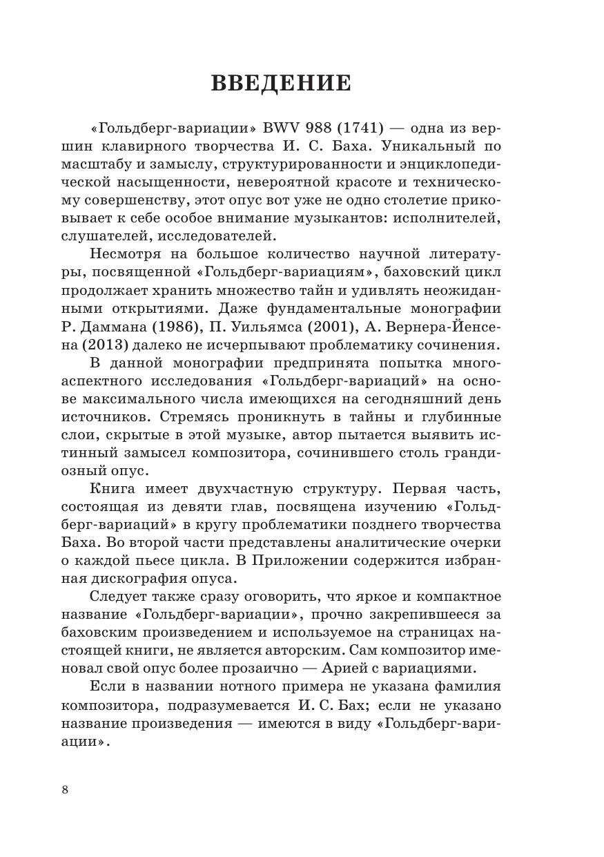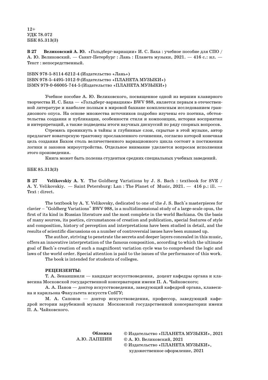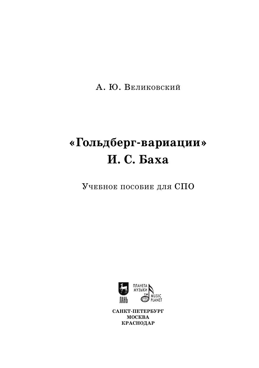 The textbook by A. Y. Velikovsky, dedicated to one of the J. S. Bach's masterpieces for clavier – "Goldberg Variations" BWV 988, is a multidimensional study of a large-scale opus, the first of its kind in Russian literature and the most complete in the world Bachiana. On the basis of many sources, its poetics, circumstances of creation and publication, special features of style and composition, history of perception and interpretations have been studied in detail, and the results of scientific discussions on a number of controversial issues have been summed up.