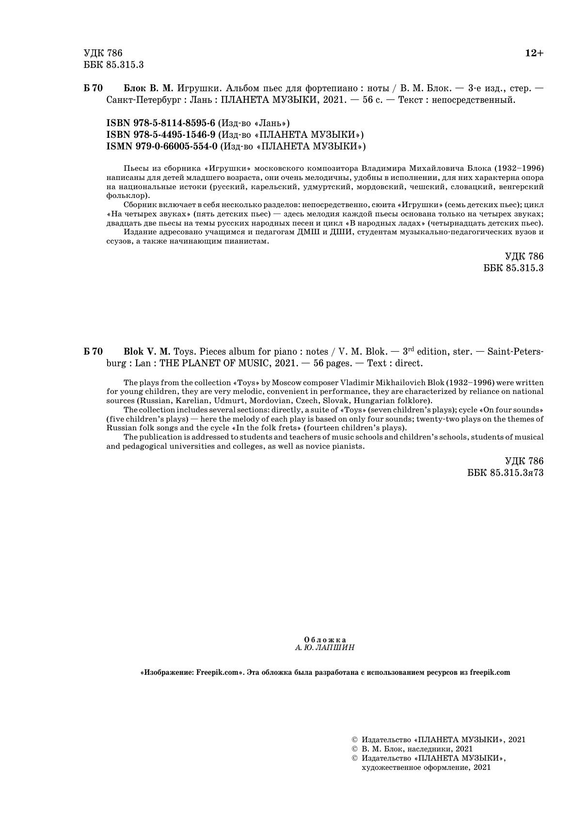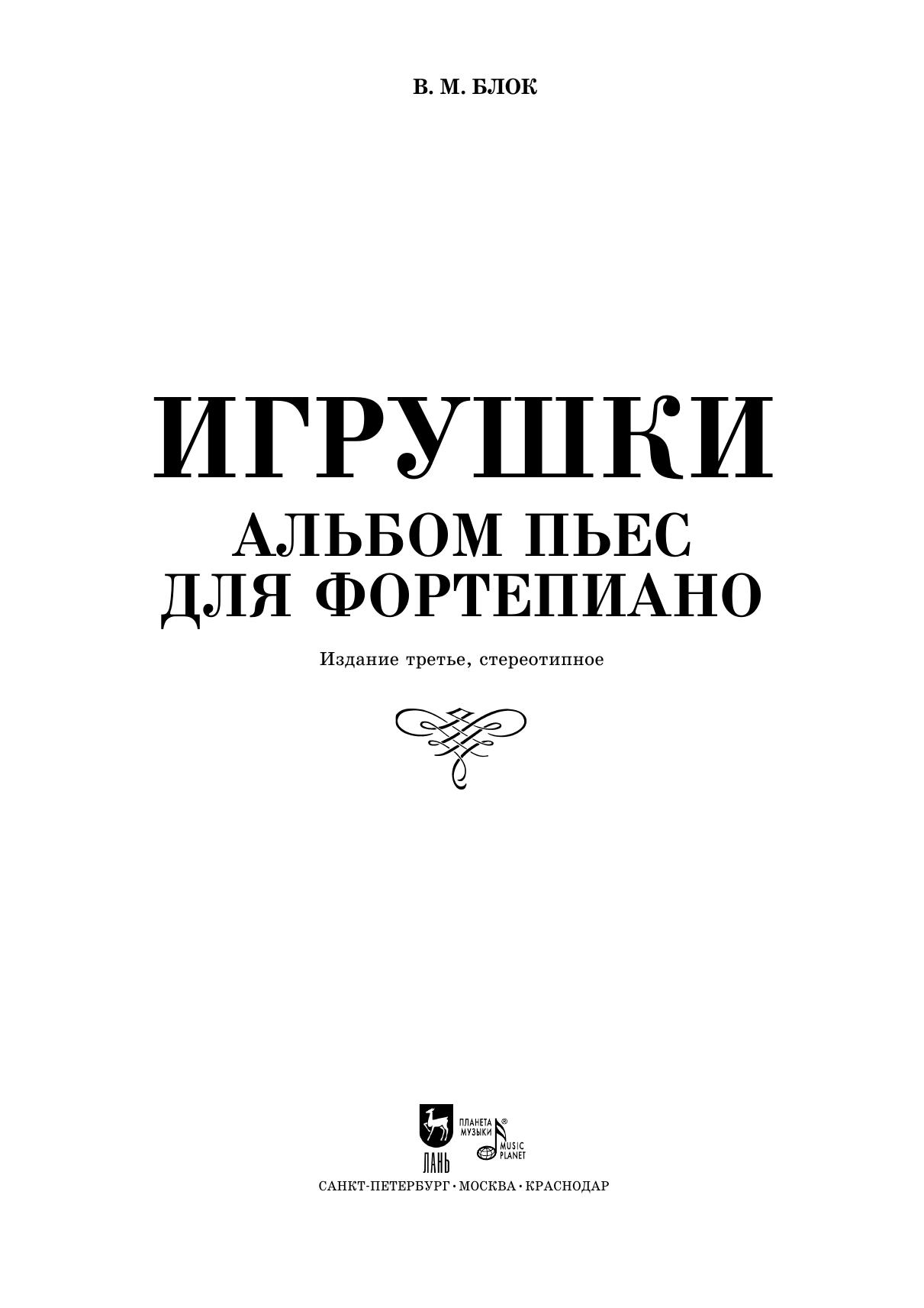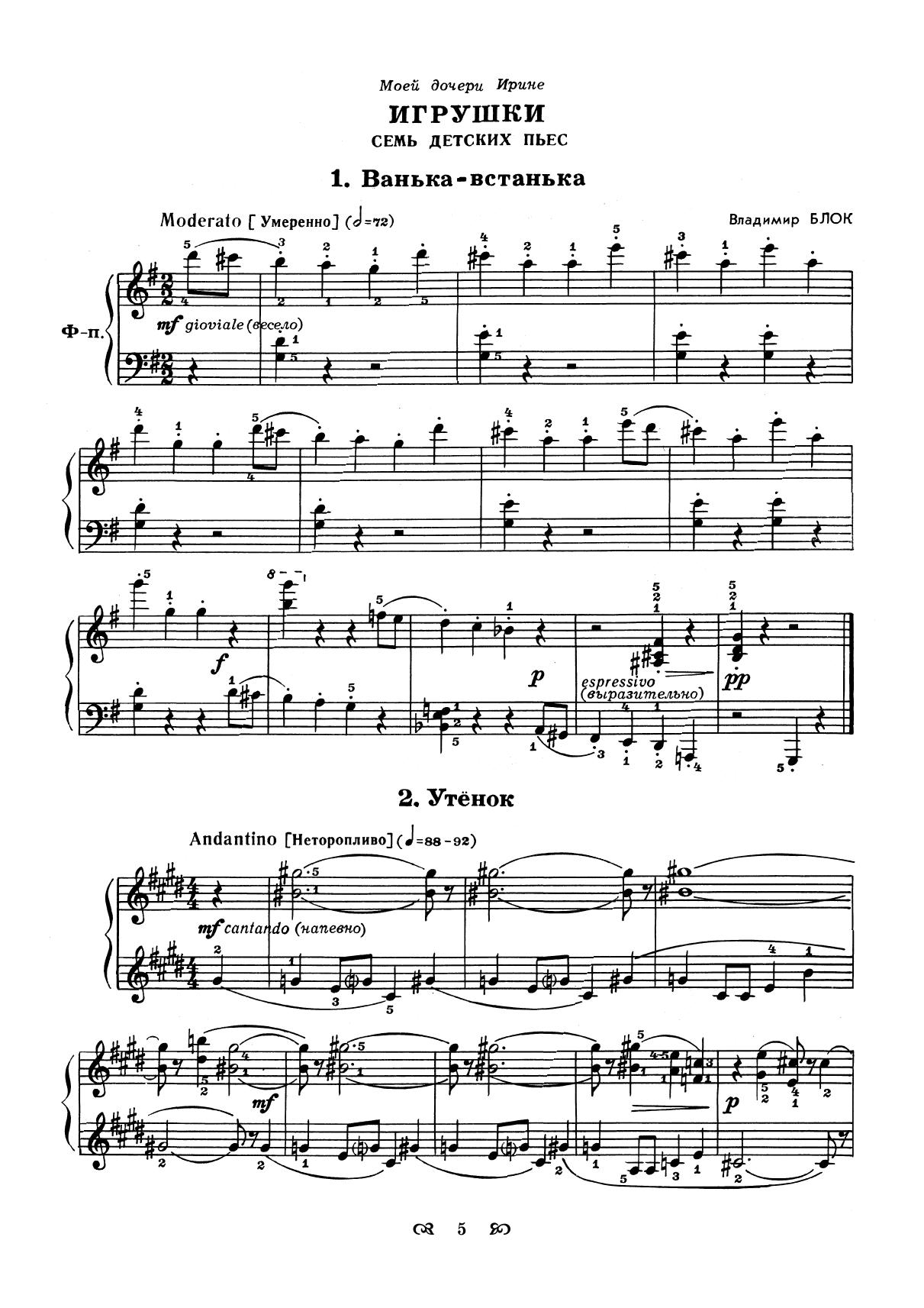 The plays from the collection «Toys» by Moscow composer Vladimir Mikhailovich Blok (1932–1996) were written for young children, they are very melodic, convenient in performance, they are characterized by reliance on national sources (Russian, Karelian, Udmurt, Mordovian, Czech, Slovak, Hungarian folklore).