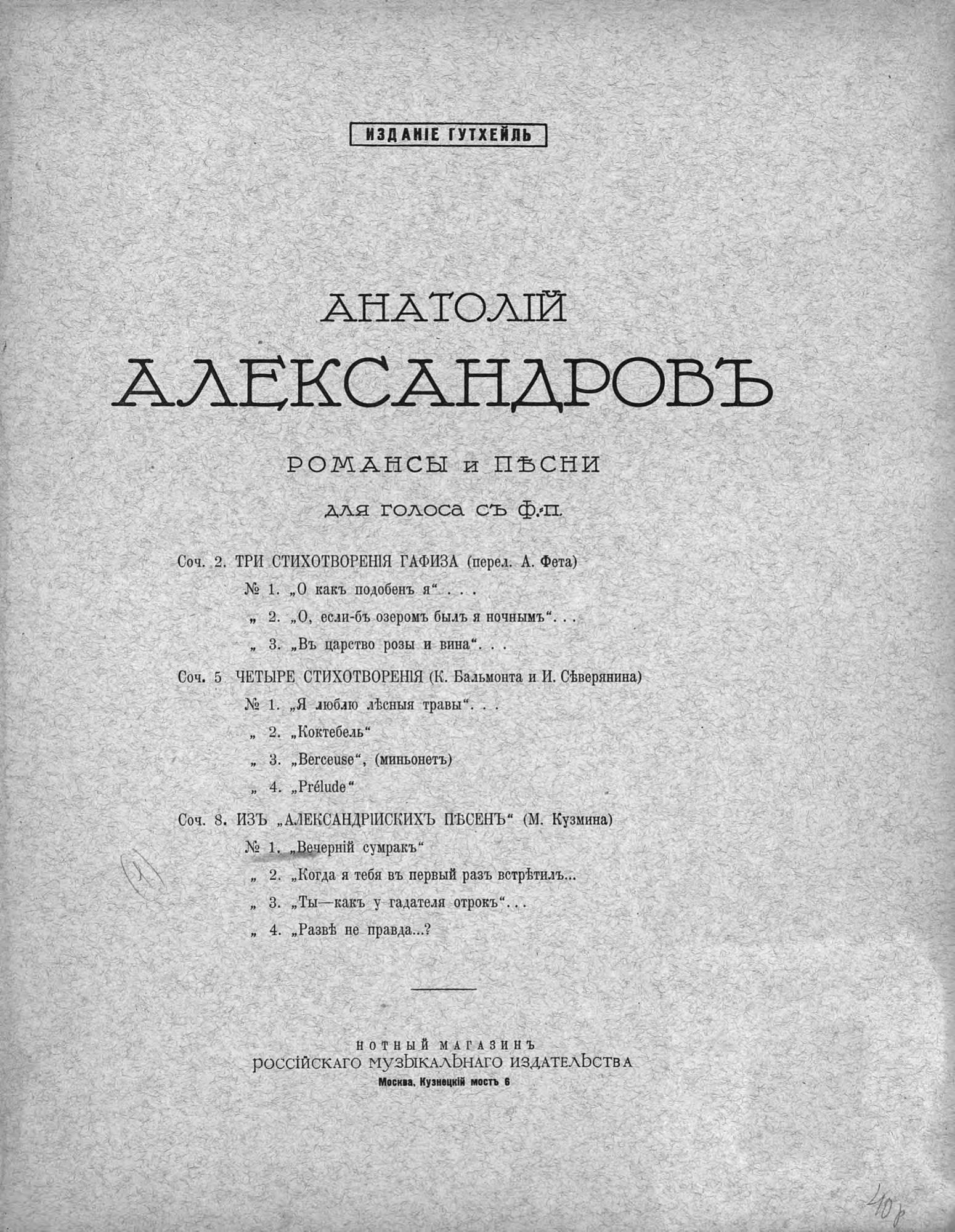 "Из Александрийских песен" (М. Кузьмина [т. е. Кузмина]) для голоса и фортепиано