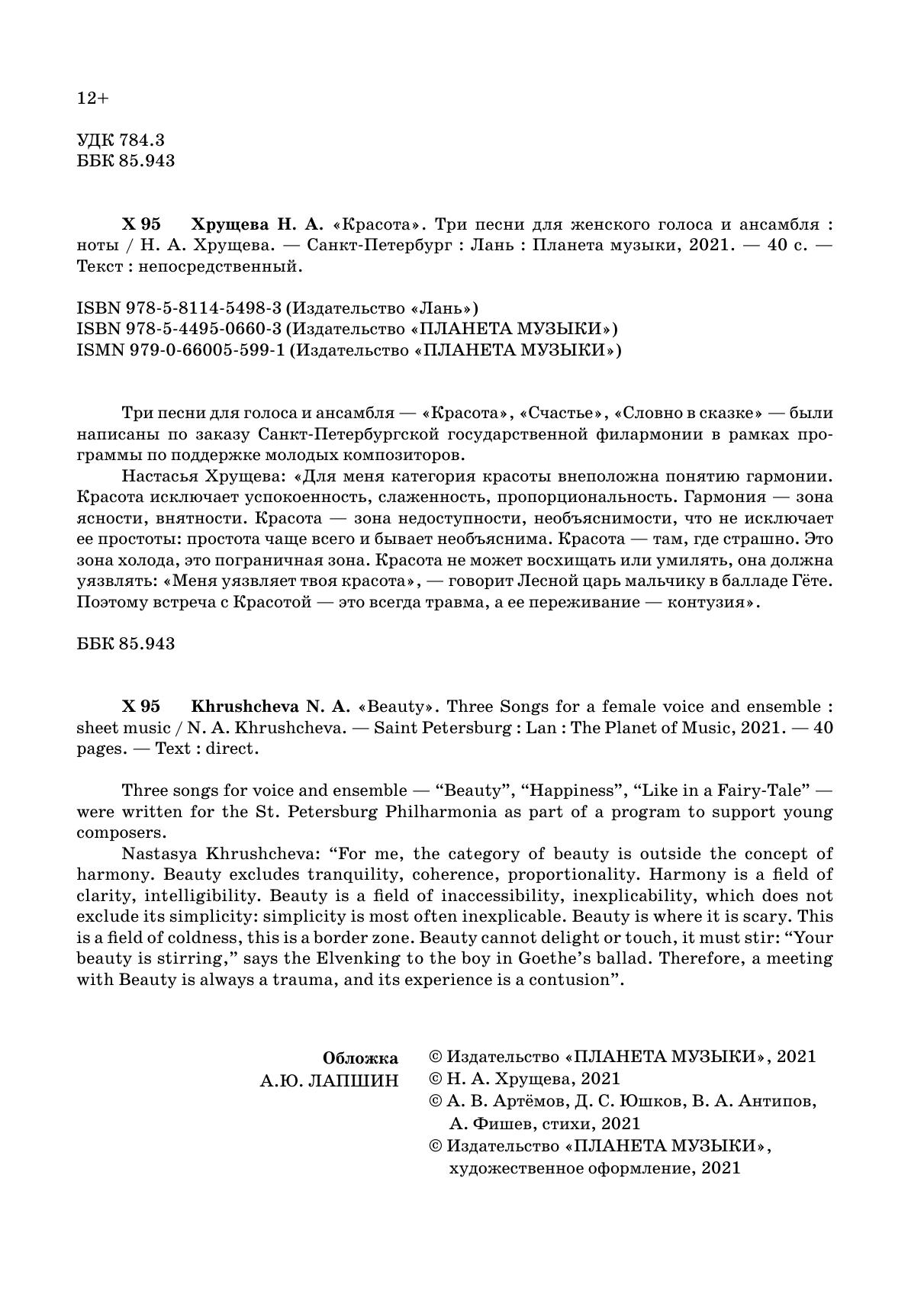 Three songs for voice and orchestra - “Beauty”, “Happiness”, “Like in a Fairy-Tale” - were written for the St. Petersburg Philharmonia as part of a program to support young composers. A meeting with Beauty, according to N. Khrushcheva, should hurt - cause injury to a listener. The texts, consisting of a number of commonplace and verbal stamps, are intended to look for a certain aesthetic beauty in them.
