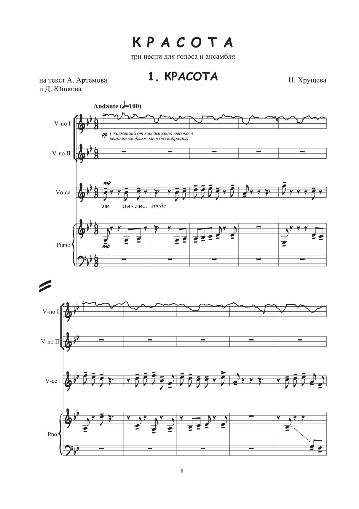 Три песни для голоса и оркестра — «Красота», «Счастье», «Словно в сказке» — были написаны по заказу Санкт-Петербургской государственной филармонии в рамках программы по поддержке молодых композиторов. Встреча с Красотой, по словам Н. Хрущевой, должна уязвлять — наносить травму слушателю. Состоящие из ряда банальностей и словесных штампов тексты призваны искать в них некую эстетскую красоту.