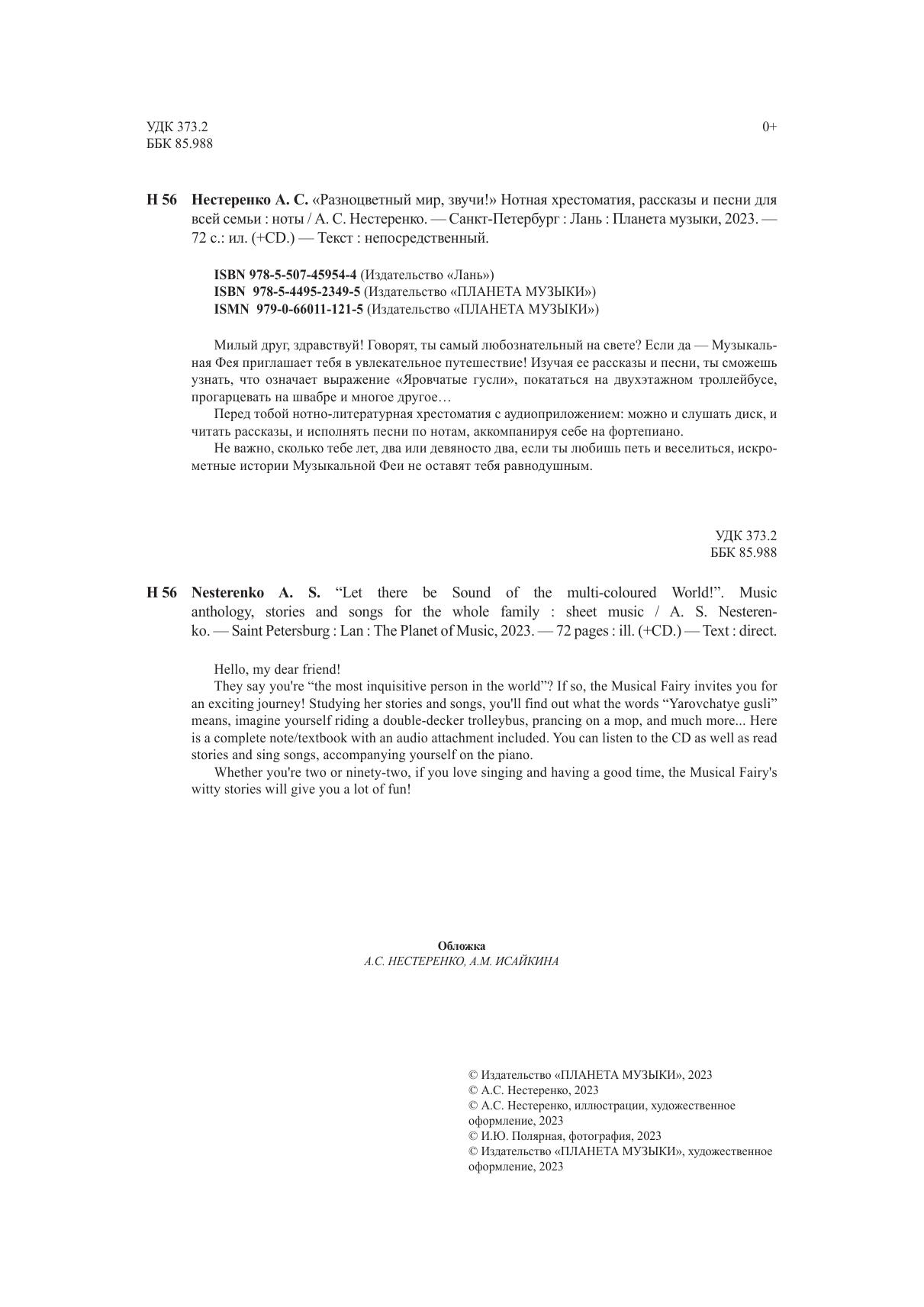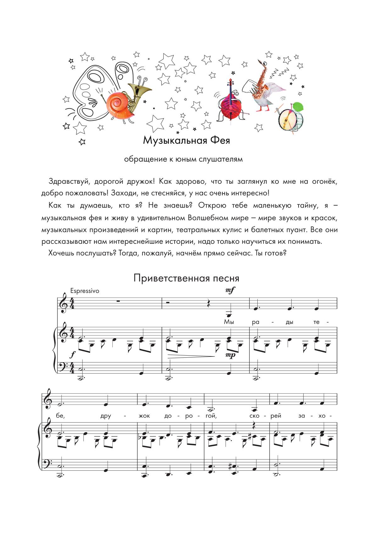 Милый друг, здравствуй! Говорят, ты самый любознательный на свете? Если да — Музыкальная Фея приглашает тебя в увлекательное путешествие! Изучая ее рассказы и песни, ты сможешь узнать, что означает выражение «Яровчатые гусли», покататься на двухэтажном троллейбусе, прогарцевать на швабре и многое другое… Перед тобой нотно-литературная хрестоматия с аудиоприложением: можно и слушать диск, и читать рассказы, и исполнять песни по нотам, аккомпанируя себе на фортепиано. Не важно, сколько тебе лет, два или девяносто два, если ты любишь петь и веселиться, искрометные истории Музыкальной Феи не оставят тебя равнодушным. Hello, dear friend! They say you’re the most curious person in the world? If it is so, the Musical Fairy invites you to join the exciting journey! If you know her stories and songs, you’ll be able to find out what the expression “Sonorous gusli” means, ride a double-decker trolleybus, ride a mop and much more... Here you have a musical and literary anthology with an audio application: you can listen to the CD, read stories, and sing songs, accompanying yourself on the piano. It does not matter how old you are, two or ninety-two, if you love to sing and have fun, the sparkling stories of the Musical Fairy will not leave you indifferent.