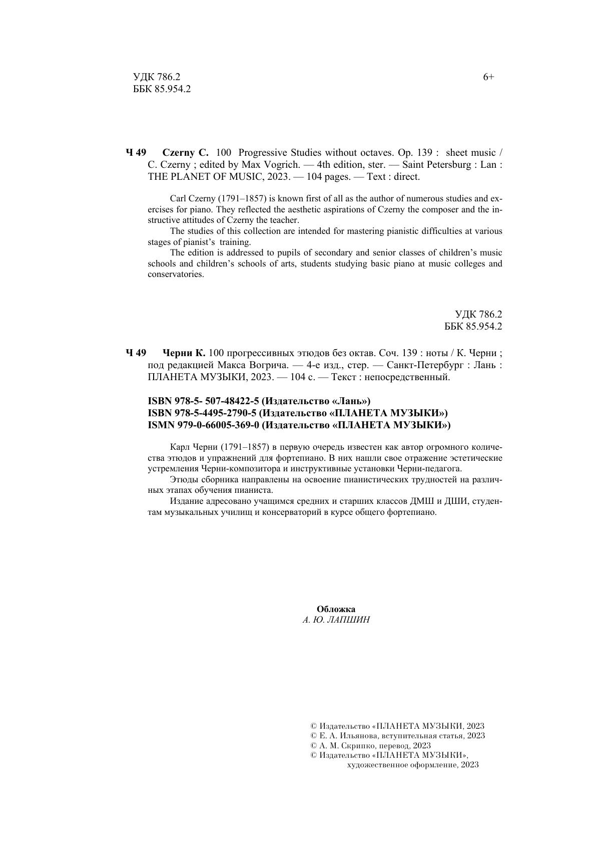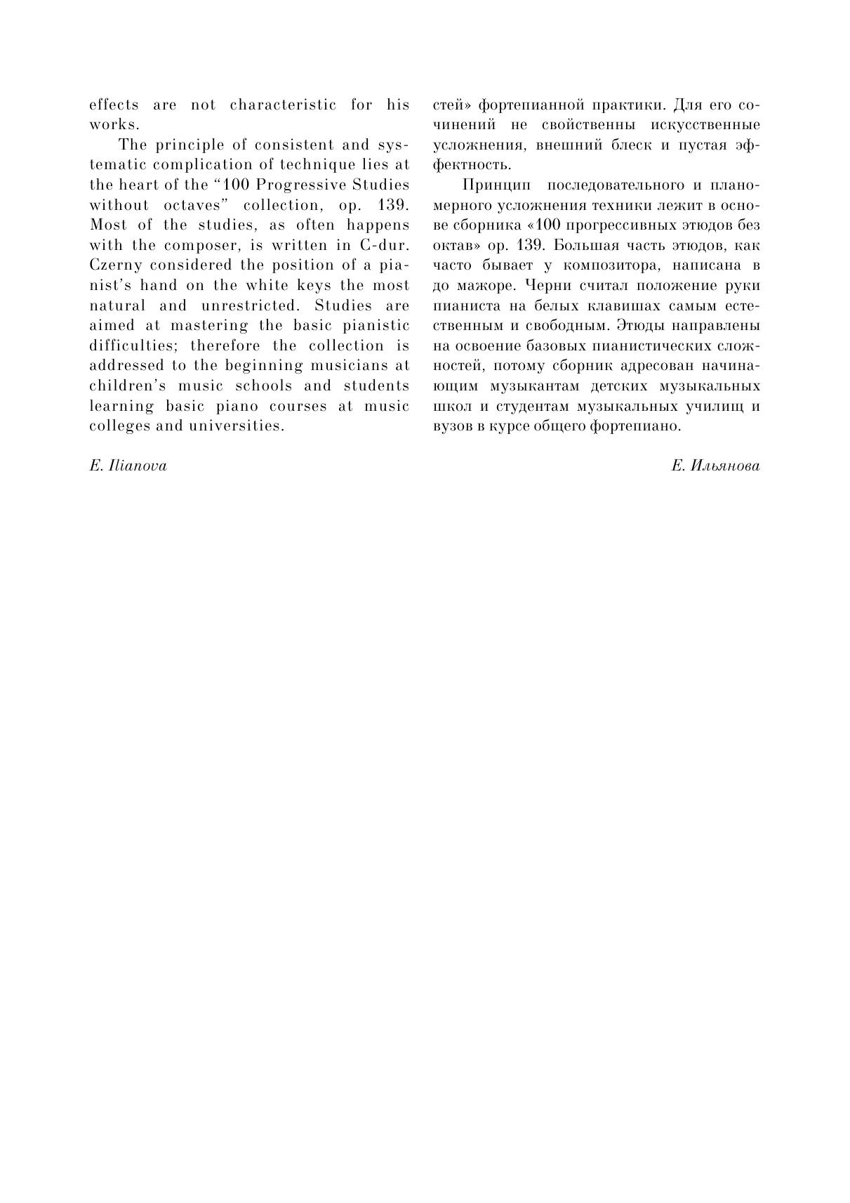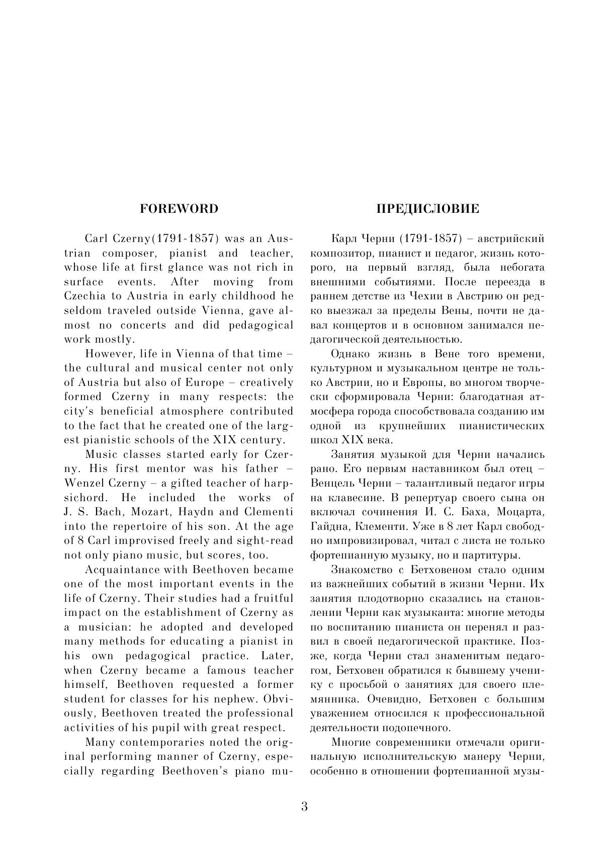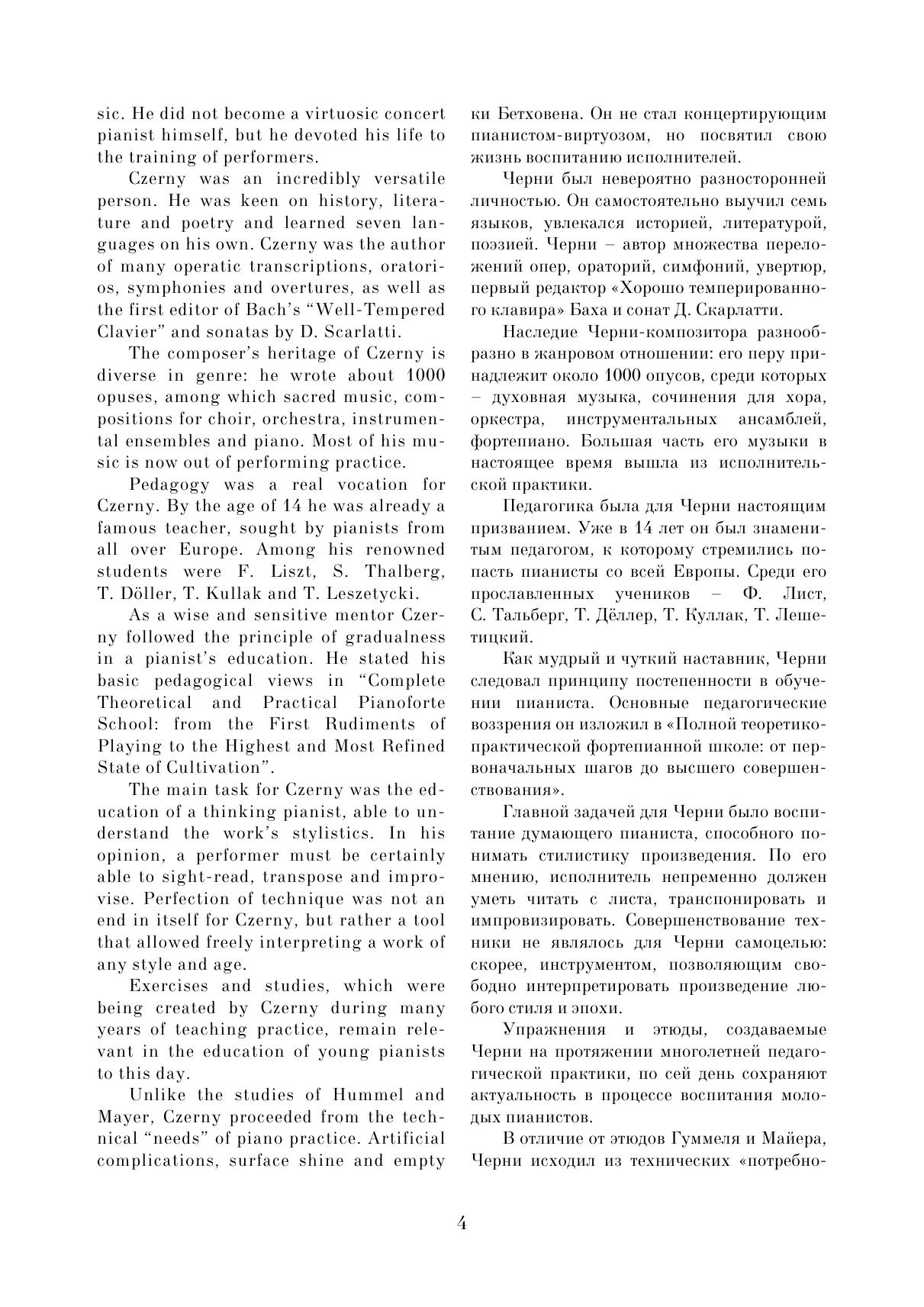 Карл Черни (1791-1857) в первую очередь известен как автор огромного количества этюдов и упражнений для фортепиано. В них нашли свое отражение эстетические устремления Черни-композитора и инструктивные установки Черни-педагога. Этюды сборника направлены на освоение пианистических трудностей на различных этапах обучения пианиста. Издание адресовано учащимся средних и старших классов ДМШ и ДШИ, студентам музыкальных училищ и консерваторий в курсе общего фортепиано. Carl Czerny (1791–1857) is known first of all as the author of numerous studies and exercises for piano. They reflected the aesthetic aspirations of Cherny the composer and the instructive attitudes of Cherny the teacher. The studies of this collection are intended for mastering pianistic difficulties at various stages of pianist’s training. The editon is addressed to pupils of secondary and senior classes of children’s music schools and children’s schools of arts, students studying general piano at music colleges and conservatories.