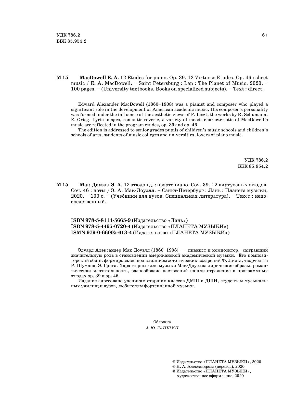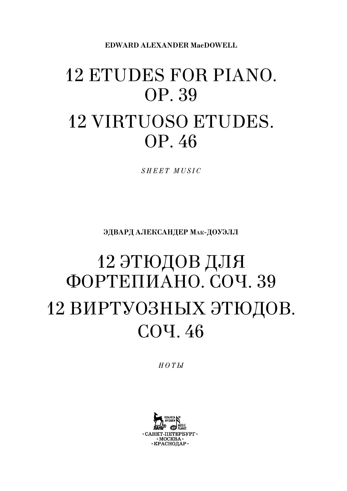 Эдуард Александер Мак-Доуэлл (1860-1908) — пианист и композитор, сыгравший значительную роль в становлении американской академической музыки. Его композиторский облик формировался под влиянием эстетических воззрений Ф. Листа, творчества Р. Шумана, Э. Грига. Характерные для музыки Мак-Доуэлла лирические образы, романтическая мечтательность, разнообразие настроений нашли отражение в программных этюдах ор. 39 и ор. 46. Издание адресовано ученикам старших классов ДМШ и ДШИ, студентам музыкальных училищ и вузов, любителям фортепианной музыки.