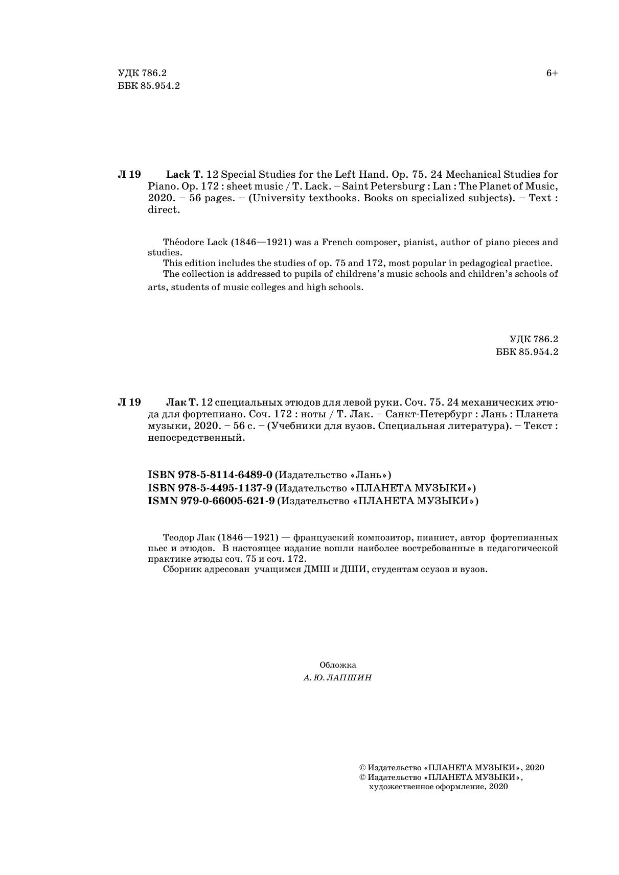 Теодор Лак (1846—1921) — французский композитор, пианист, автор фортепианных пьес и этюдов. В настоящее издание вошли наиболее востребованные в педагогической практике этюды соч. 75 и соч. 172.