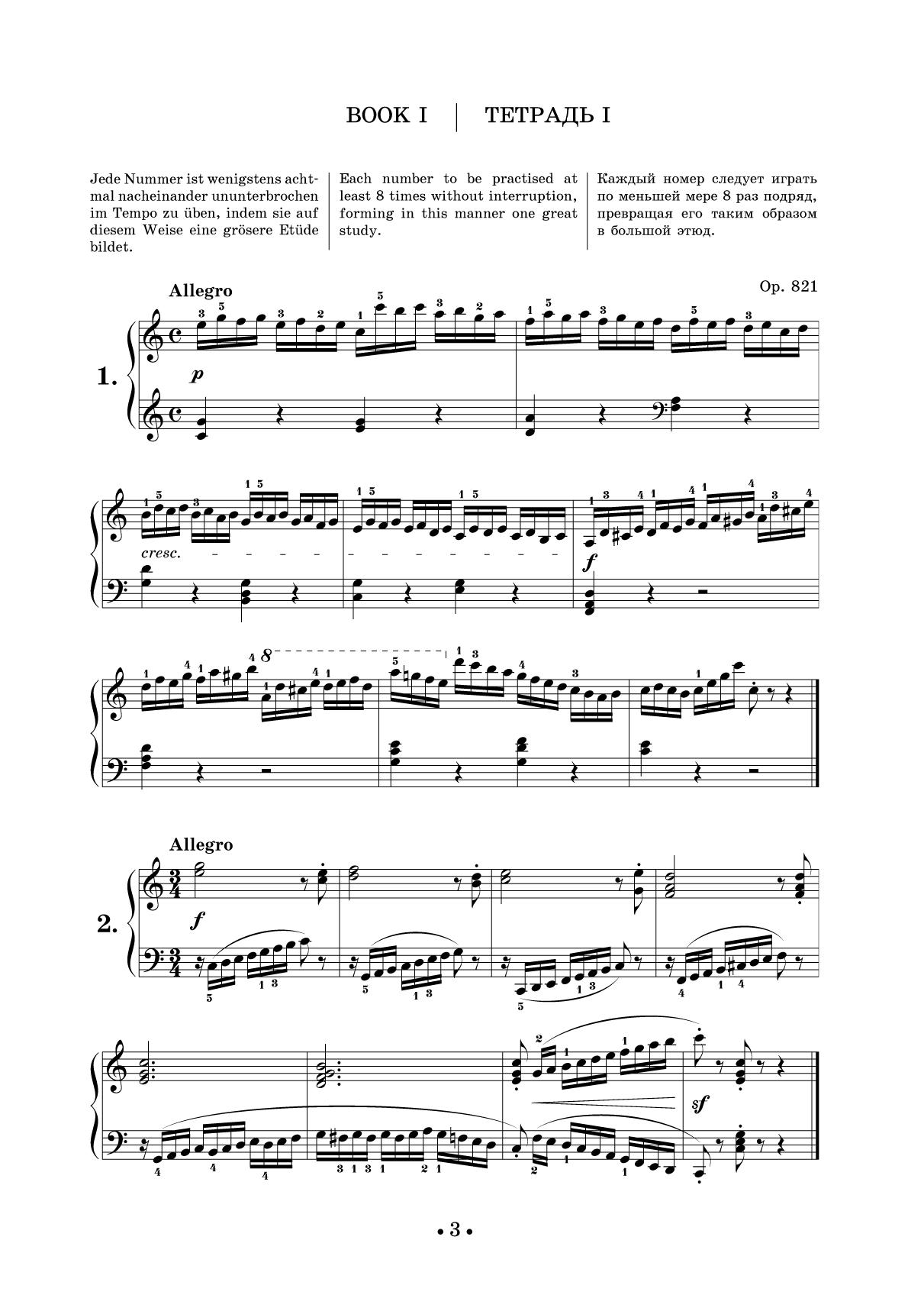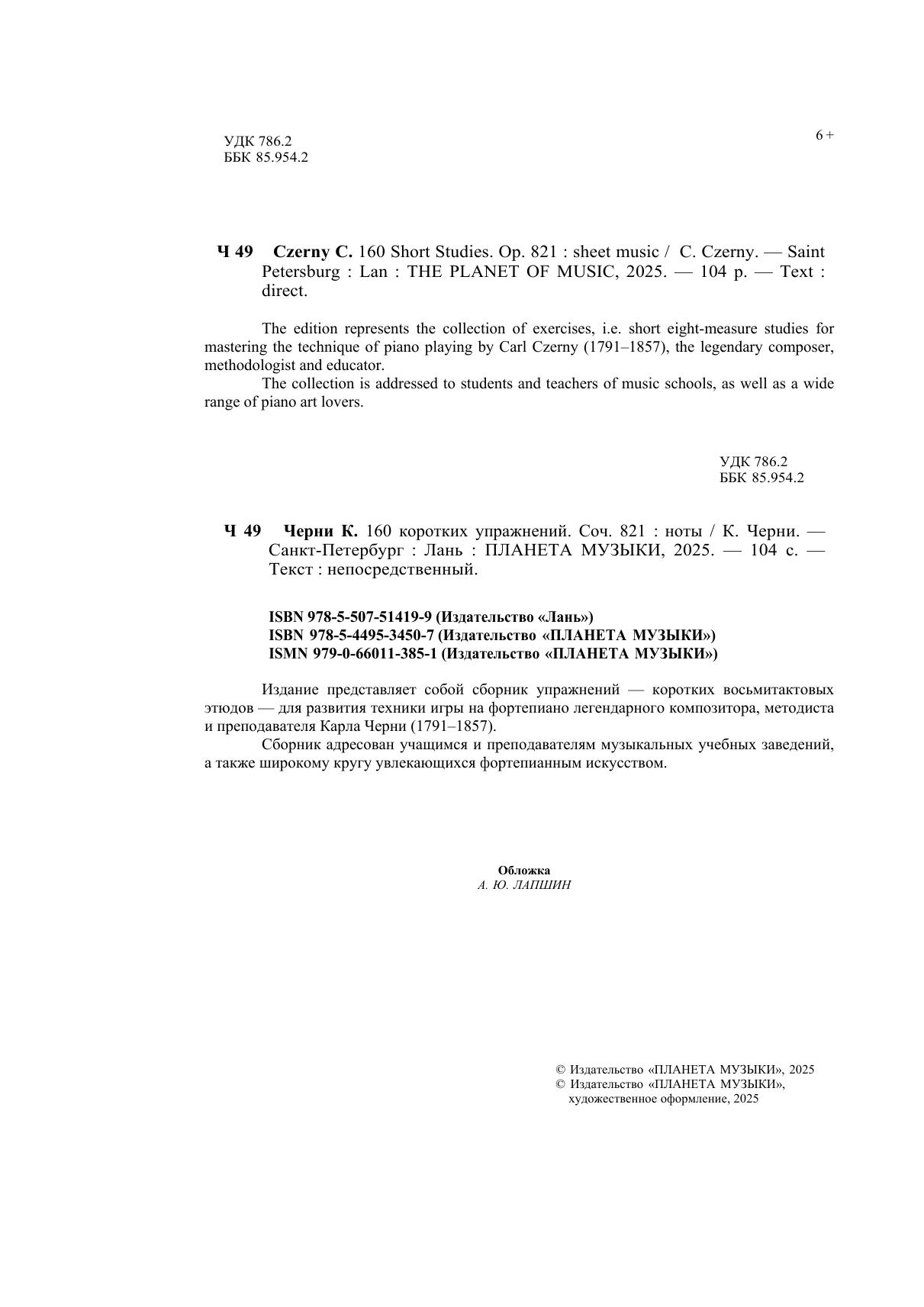 Издание представляет собой сборник упражнений — коротких восьмитактовых этюдов — для развития техники игры на фортепиано легендарного композитора, методиста и преподавателя Карла Черни (1791–1857). Сборник адресован учащимся и преподавателям музыкальных учебных заведений, а также широкому кругу увлекающихся фортепианным искусством. The edition represents the collection of exercises, i.e. short eight-measure studies for mastering the technique of piano playing by Carl Czerny (1791–1857), the legendary composer, methodologist and educator. The collection is addressed to students and teachers of music schools, as well as a wide range of piano art lovers.
