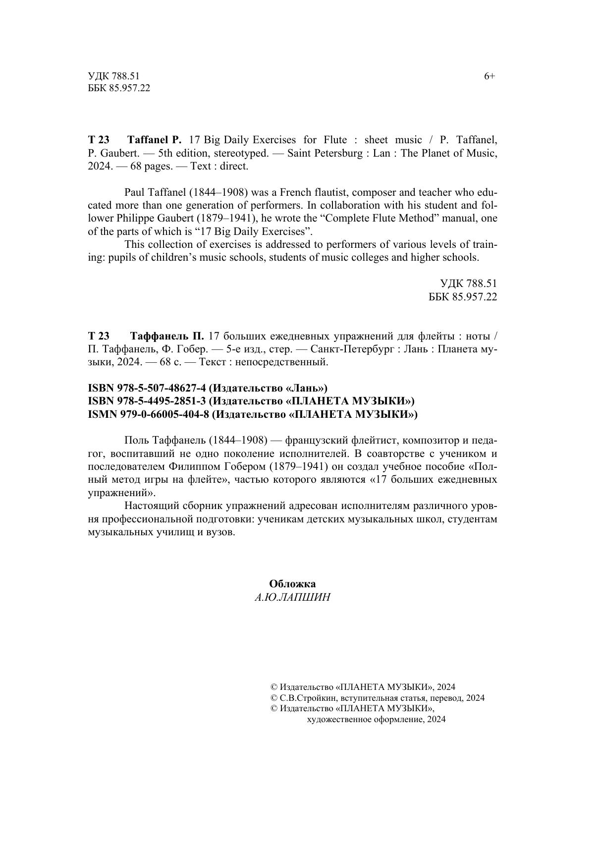 Поль Таффанель (1844-1908) — французский флейтист, композитор и педагог, воспитавший не одно поколение исполнителей. В соавторстве с учеником и последователем Филиппом Гобером (1879-1941) он создал учебное пособие «Полный метод игры на флейте», одной из частей которого являются «17 больших ежедневных упражнений». Настоящий сборник упражнений адресован исполнителям различного уровня профессиональной подготовки: ученикам детских музыкальных школа, студентам музыкальных училищ и вузов.