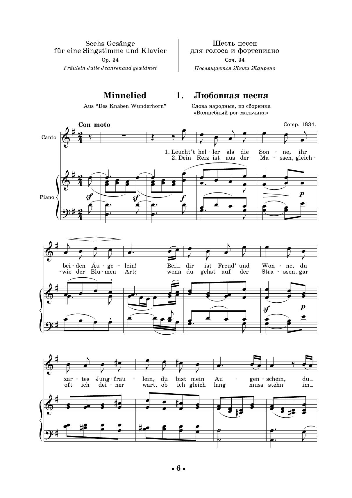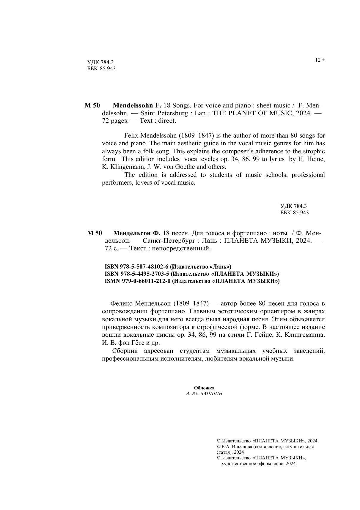 Феликс Мендельсон (1809–1847) — автор более 80 песен для голоса в сопровождении фортепиано. Главным эстетическим ориентиром в жанрах вокальной музыки для него всегда была народная песня. Этим объясняется приверженность композитора к строфической форме. В настоящее издание вошли вокальные циклы ор. 34, 86, 99 на стихи Г. Гейне, К. Клингеманна, И. В. фон Гёте и др. Сборник адресован студентам музыкальных учебных заведений, профессиональным исполнителям, любителям вокальной музыки. Felix Mendelssohn (1809–1847) is the author of more than 80 songs for voice and piano. The main aesthetic guide in the vocal music genres for him has always been a folk song. This explains the composer’s adherence to the strophic form. This edition includes vocal cycles op. 34, 86, 99 to lyrics by H. Heine, K. Klingemann, J. W. von Goethe and others. The edition is addressed to students of music schools, professional performers, lovers of vocal music.