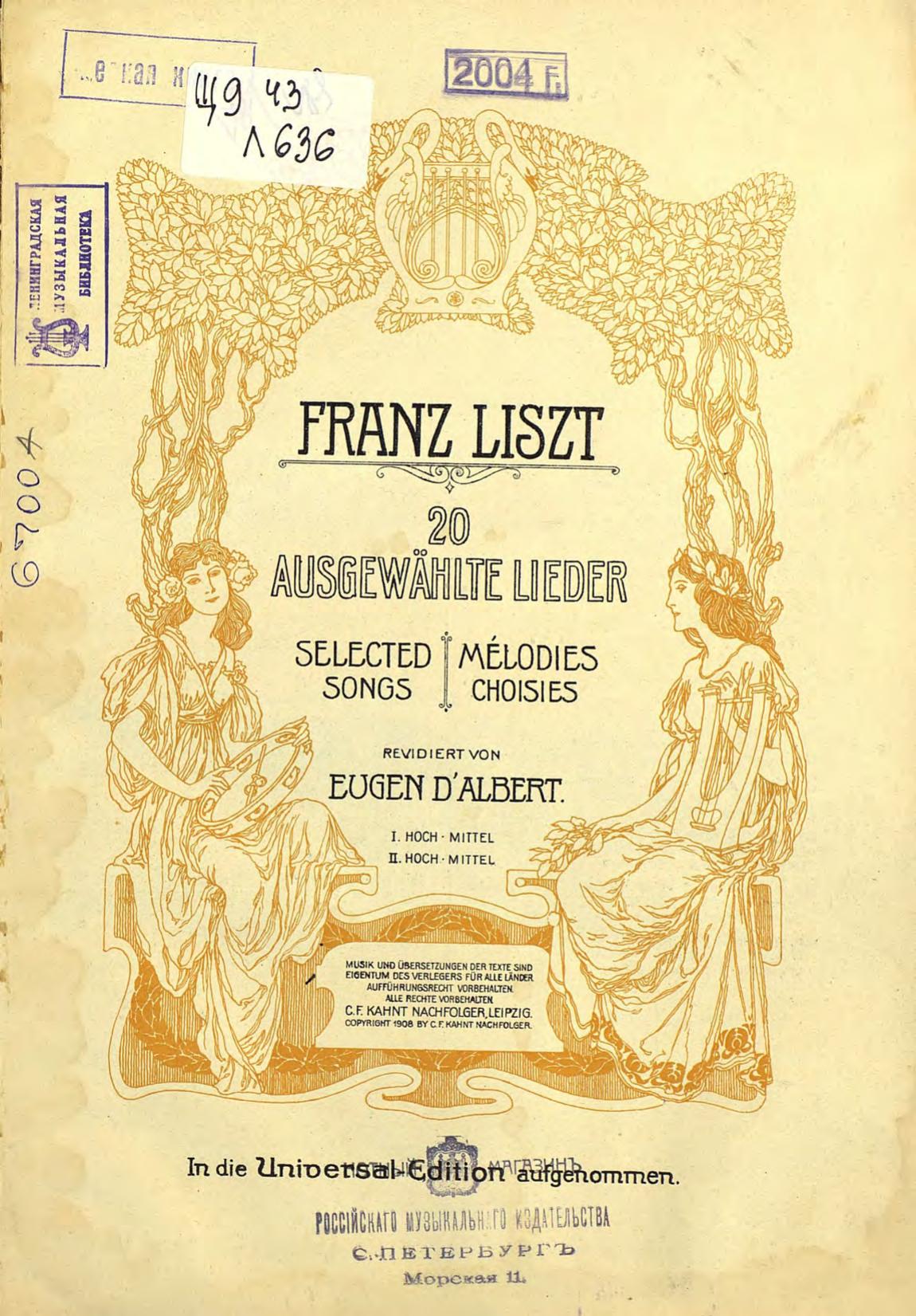 Перешедшие в общественное достояние материалы электронного фонда ЦГПБ им. В.В. Маяковского. Сведения о издательстве или типографии: C.F. Kahnt Nachfolger. Место издания: Лейпциг