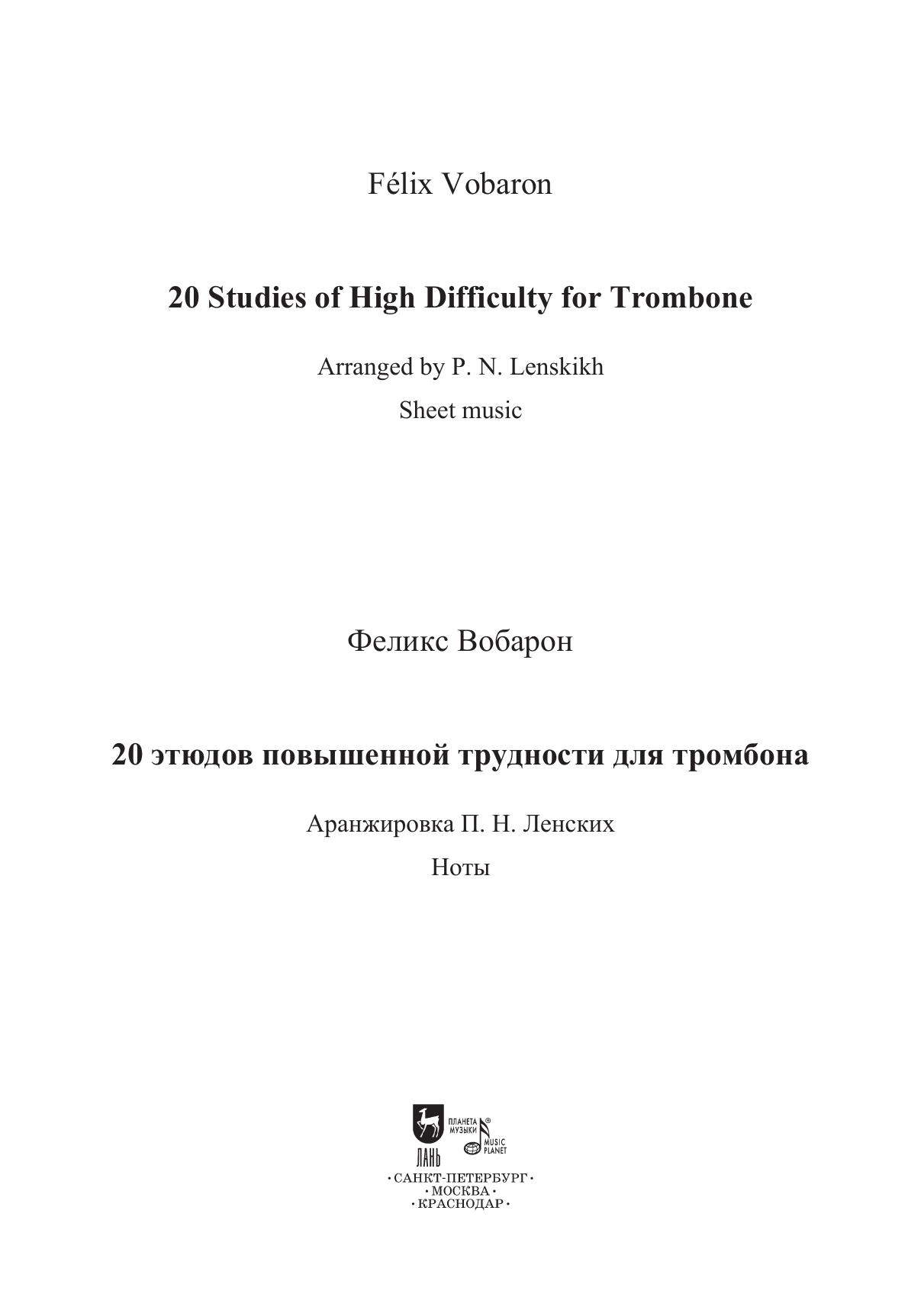 В настоящее издание вошли 20 этюдов повышенной трудности для тромбона французского композитора Феликса Вобарона (1791–1848). Популярные в педагогической практике этюды расположены по возрастанию технической сложности. Автор аранжировки — хабаровский композитор Петр Ленских, написавший для каждого этюда фортепианный аккомпанемент. Сборник адресован студентам исполнительских отделений музыкальных училищ и вузов. The current edition includes 20 studies of high difficulty for trombone by French composer Félix Vobaron (1791–1848). The studies which are popular in pedagogical repertoire are arranged in order of increasing technical complexity. The arrangements belong to the composer from Khabarovsk Pyotr Lenskikh, who wrote a piano accompaniment for each study. The collection is addressed to students of performing departments of music colleges and higher schools.