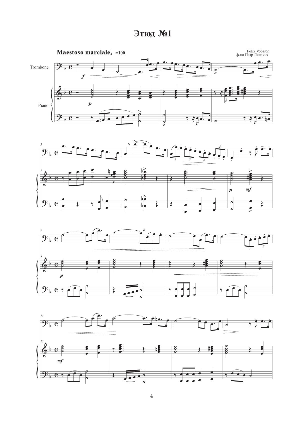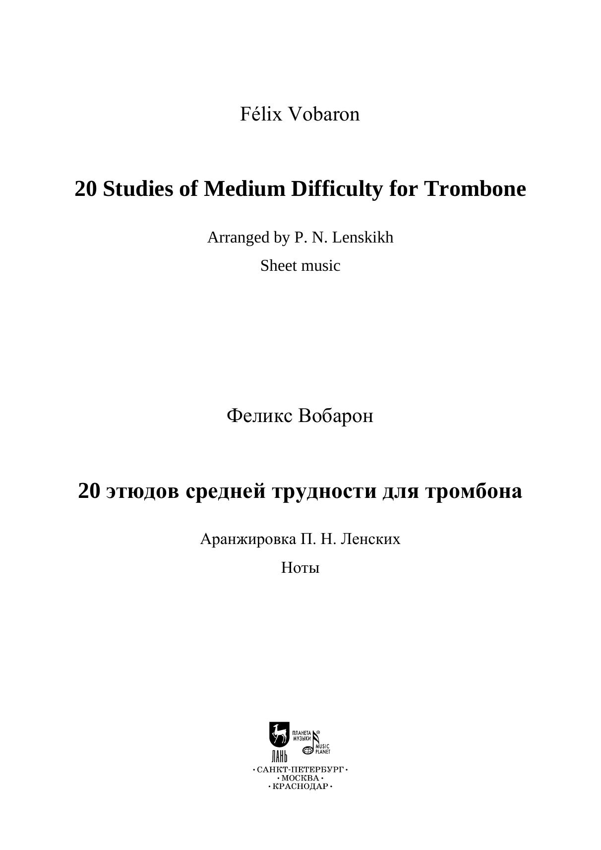 В настоящее издание вошли 20 этюдов средней трудности для тромбона французского композитора Феликса Вобарона (1791–1848). Популярные в педагогической практике этюды расположены по возрастанию технической сложности. Автор аранжировки — хабаровский композитор Петр Ленских, написавший для каждого этюда фортепианный аккомпанемент. Сборник адресован студентам исполнительских отделений музыкальных учебных заведений. The current edition includes 20 studies of medium difficulty for trombone by French composer Félix Vobaron (1791–1848). The studies which are popular in pedagogical repertoire are arranged in order of increasing technical complexity. The arrangements belong to the composer from Khabarovsk Pyotr Lenskikh, who wrote a piano accompaniment for each study. The collection is addressed to students of performing departments of music educational institutions.