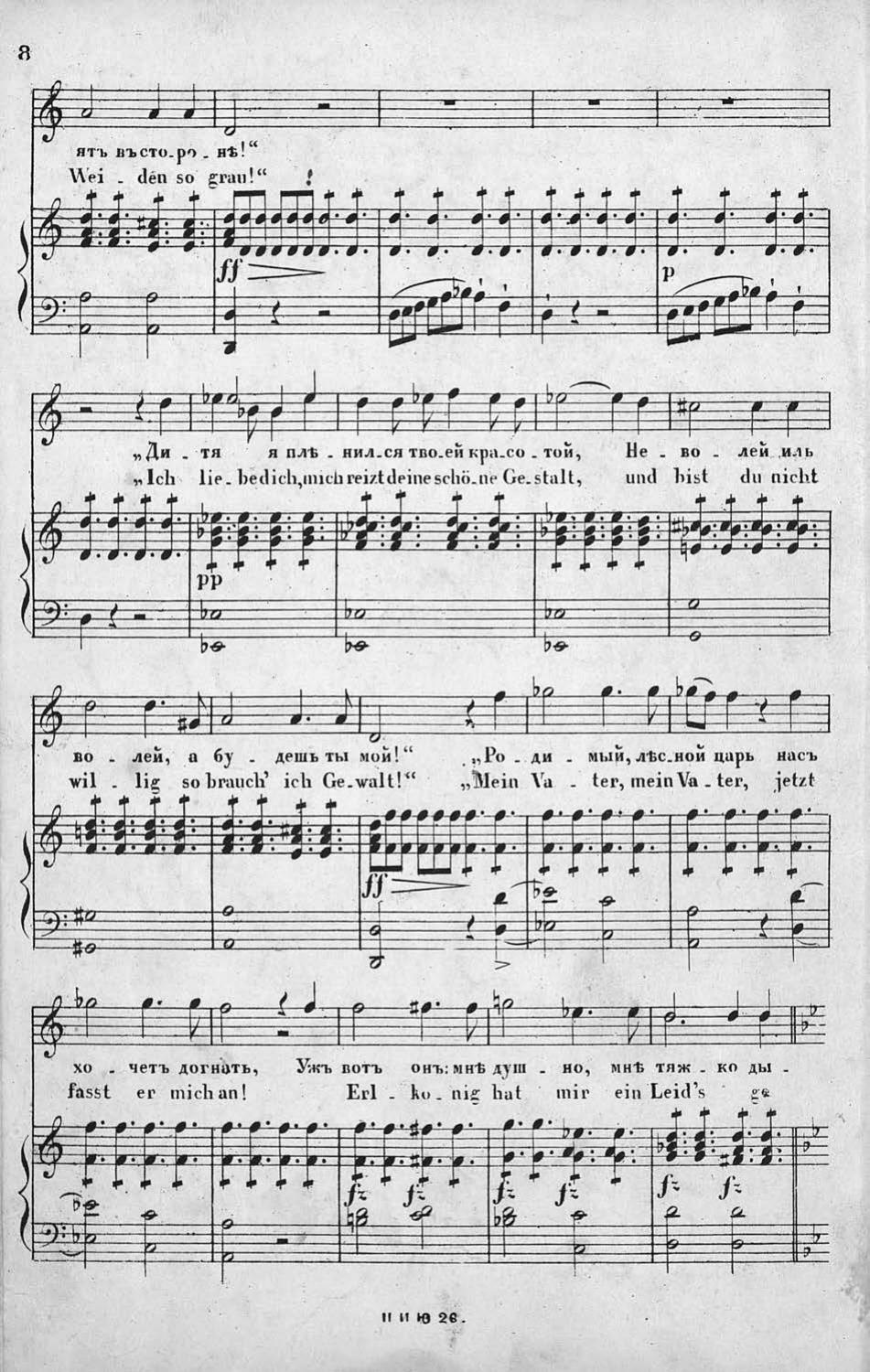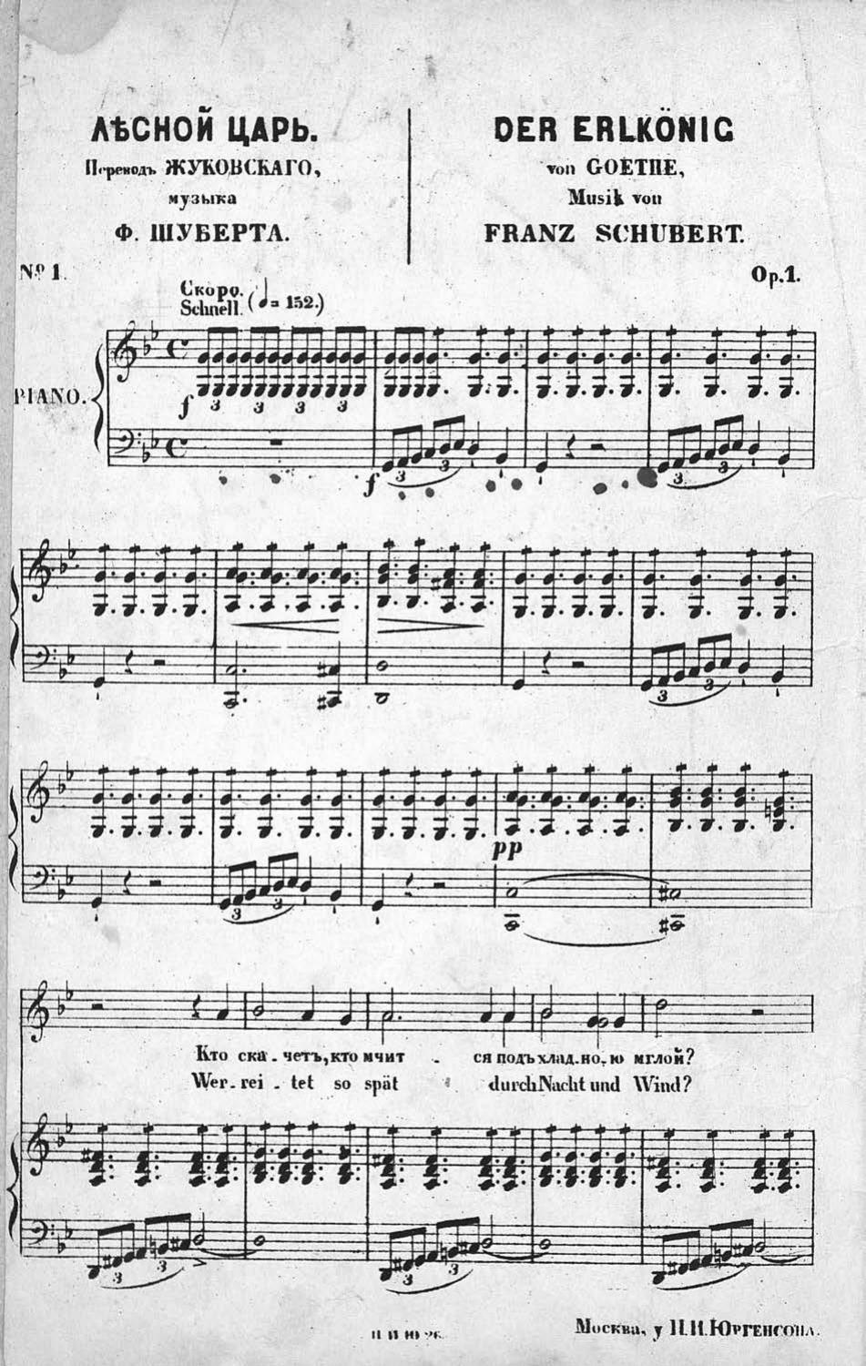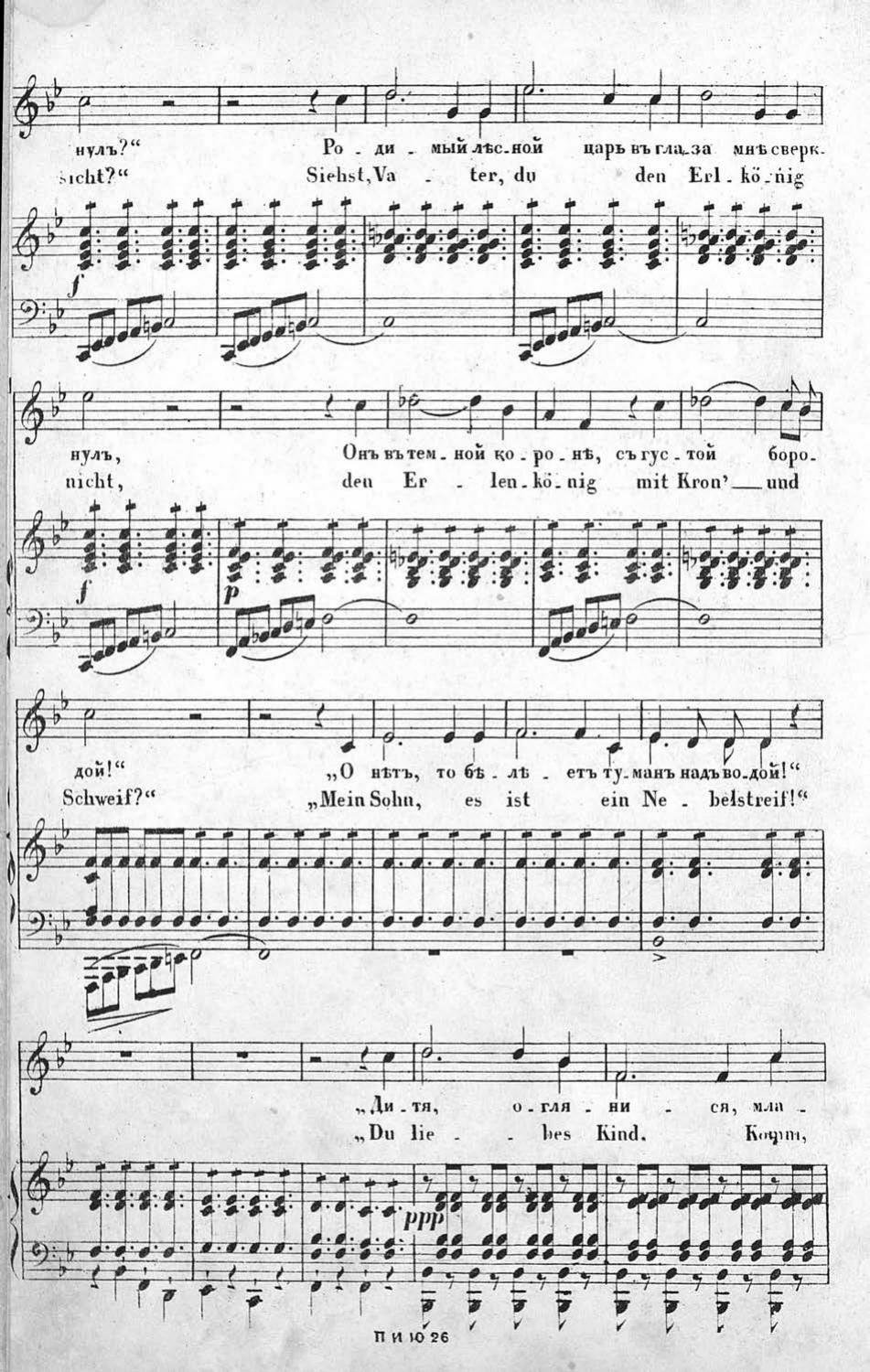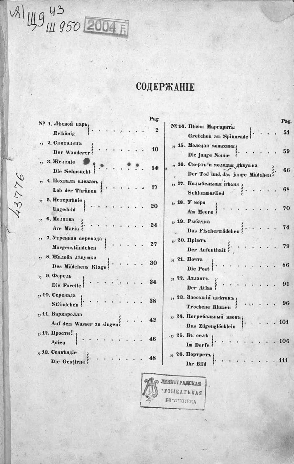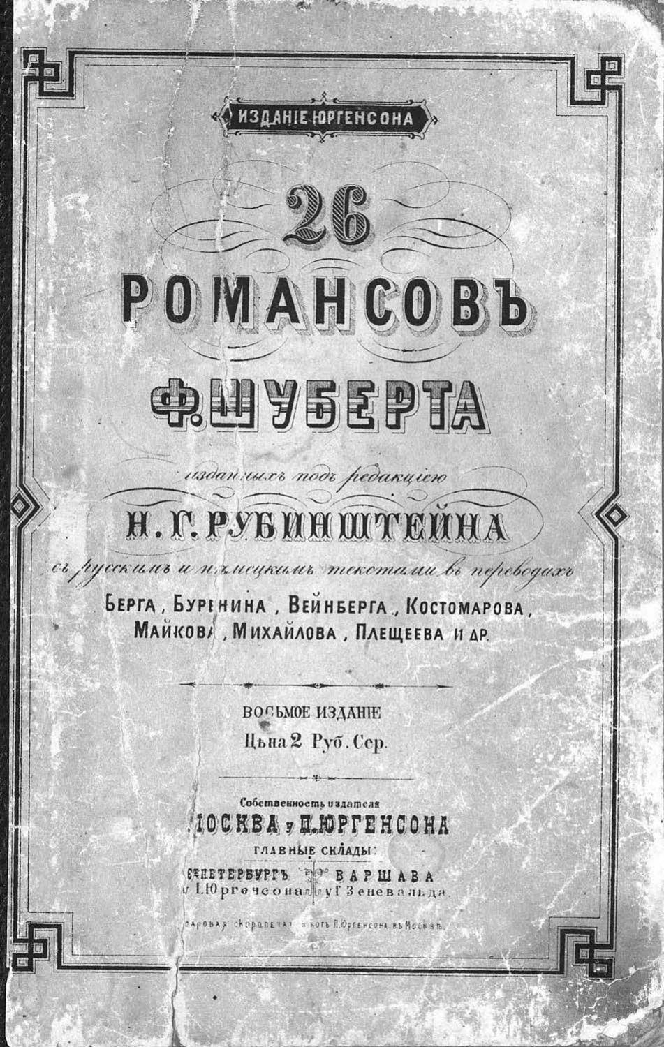 26 романсов Ф. Шуберта, изд. под ред. Н. Г. Рубинштейна с русским и нем. текстами в пер. Берга, Буренина, Вейнберга, Майкова, Плещеева и др.