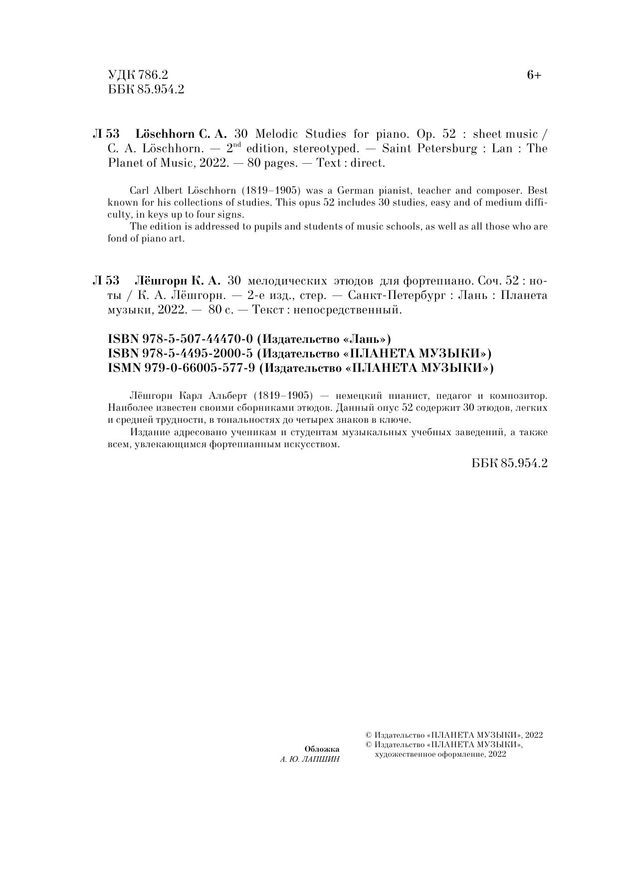 Лёшгорн Карл Альберт (1819–1905) – немецкий пианист, педагог и композитор. Наиболее известен своими сборниками этюдов. Данный опус 52 содержит 30 этюдов, легких и средней трудности, в тональностях до четырех знаков в ключе.