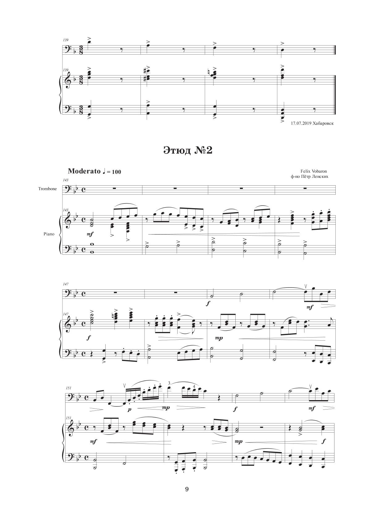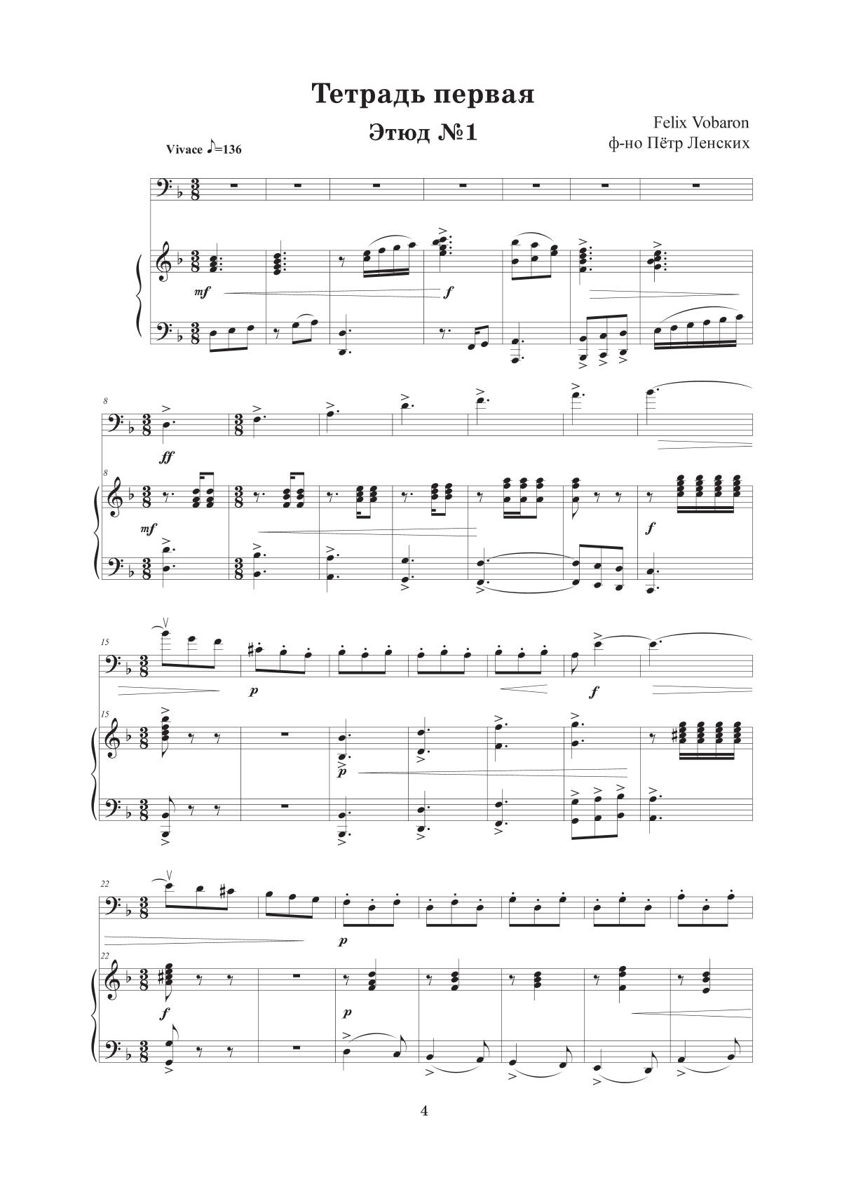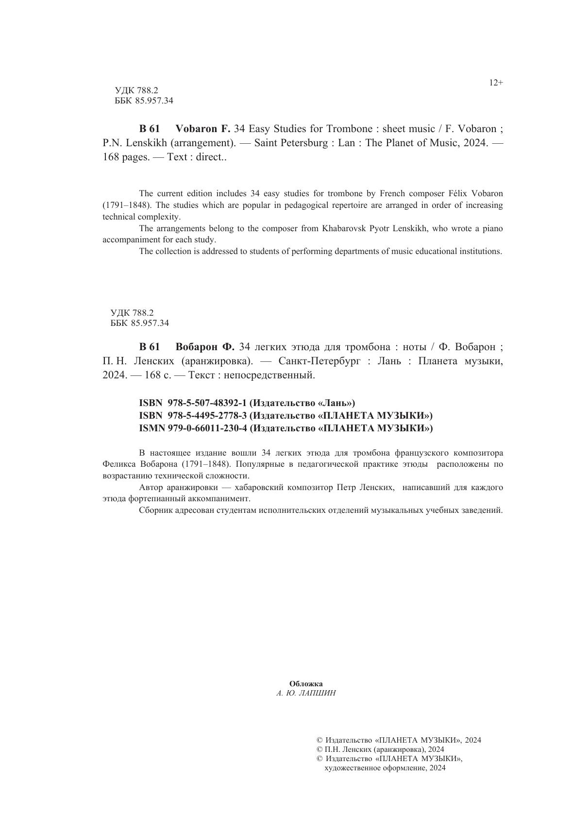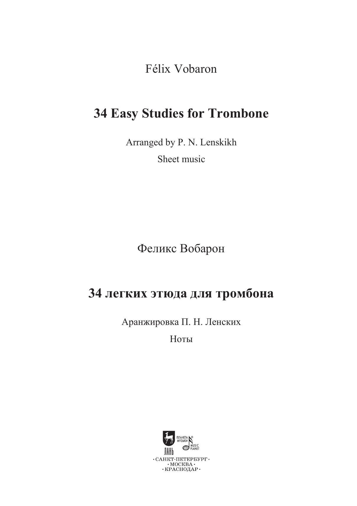В настоящее издание вошли 34 легких этюда для тромбона французского композитора Феликса Вобарона (1791–1848). Популярные в педагогической практике этюды расположены по возрастанию технической сложности. Автор аранжировки — хабаровский композитор Петр Ленских, написавший для каждого этюда фортепианный аккомпанимент. Сборник адресован студентам исполнительских отделений музыкальных учебных заведений. The current edition includes 34 easy studies for trombone by French composer Félix Vobaron (1791–1848). The studies which are popular in pedagogical repertoire are arranged in order of increasing technical complexity. The arrangements belong to the composer from Khabarovsk Pyotr Lenskikh, who wrote a piano accompaniment for each study. The collection is addressed to students of performing departments of music educational institutions.