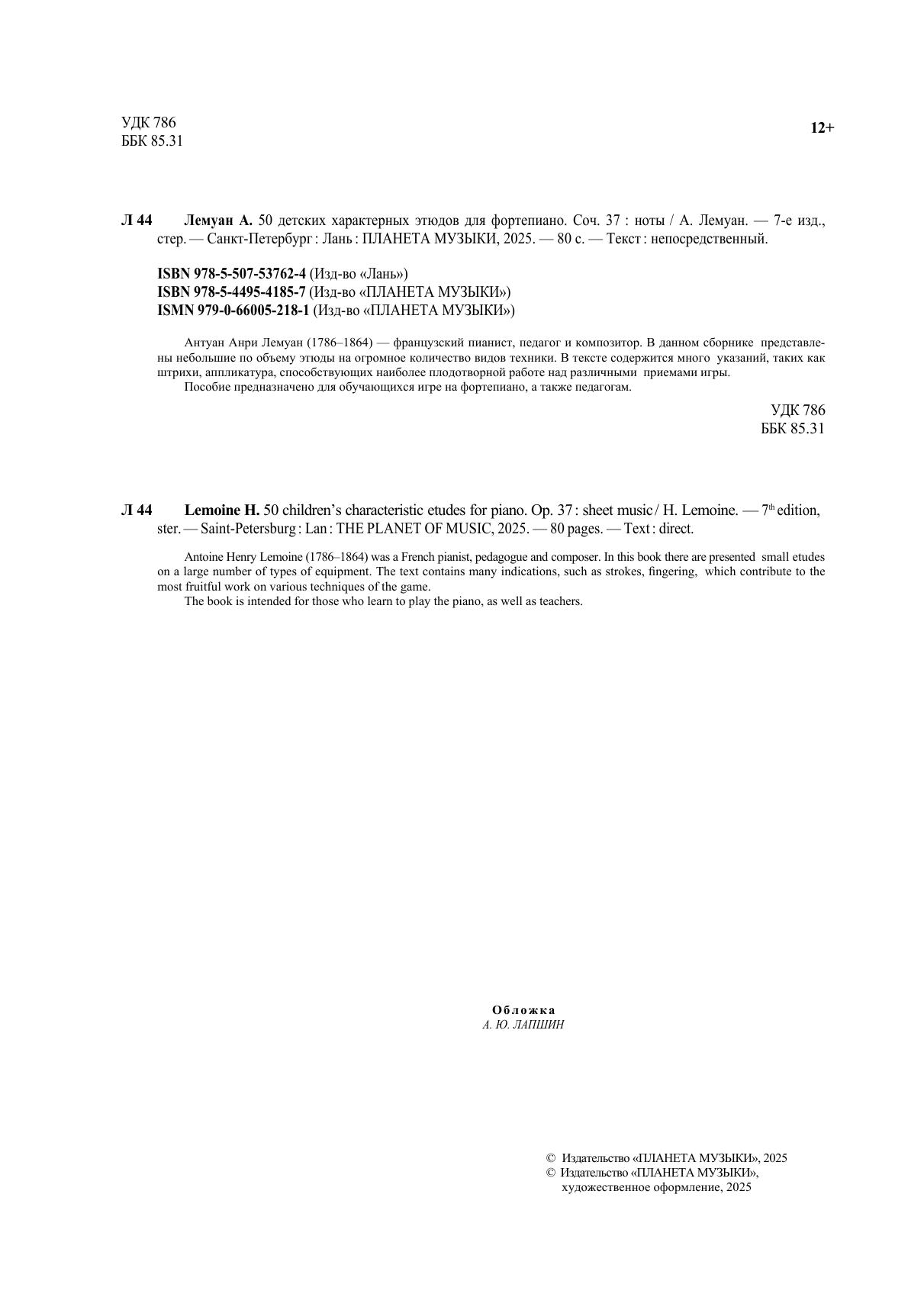 Антуан Анри Лемуан (1786–1864) — французский пианист, педагог и композитор. В данном сборнике представлены небольшие по объему этюды на огромное количество видов техники. В тексте содержится много указаний, таких как штрихи, аппликатура, способствующих наиболее плодотворной работе над различными приемами игры. Пособие предназначено для обучающихся игре на фортепиано, а также педагогам. Antoine Henry Lemoine (1786–1864) was a French pianist, pedagogue and composer. In this book there are presented small etudes on a large number of types of equipment. The text contains many indications, such as strokes, fingering, which contribute to the most fruitful work on various techniques of the game. The book is intended for those who learn to play the piano, as well as teachers.