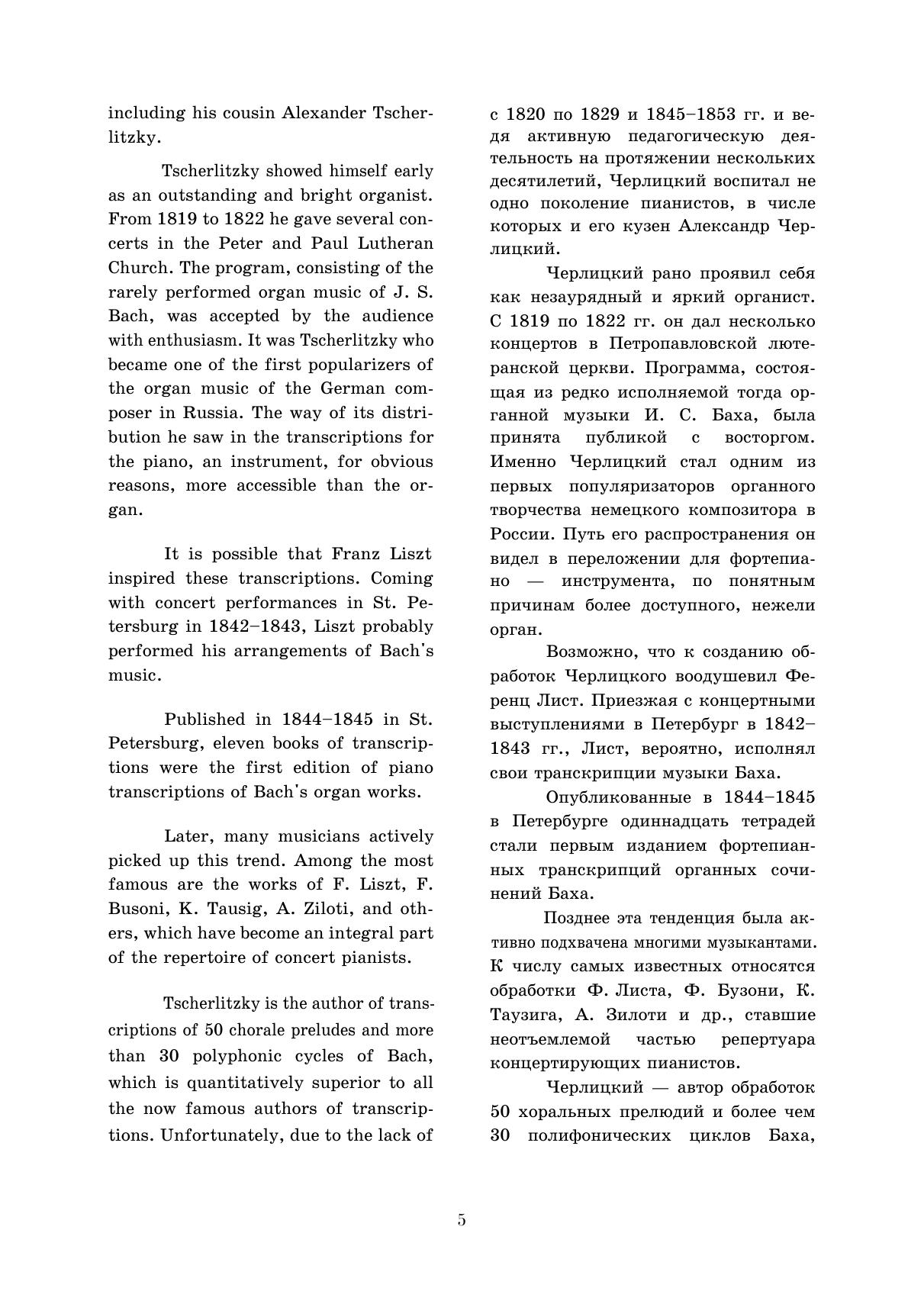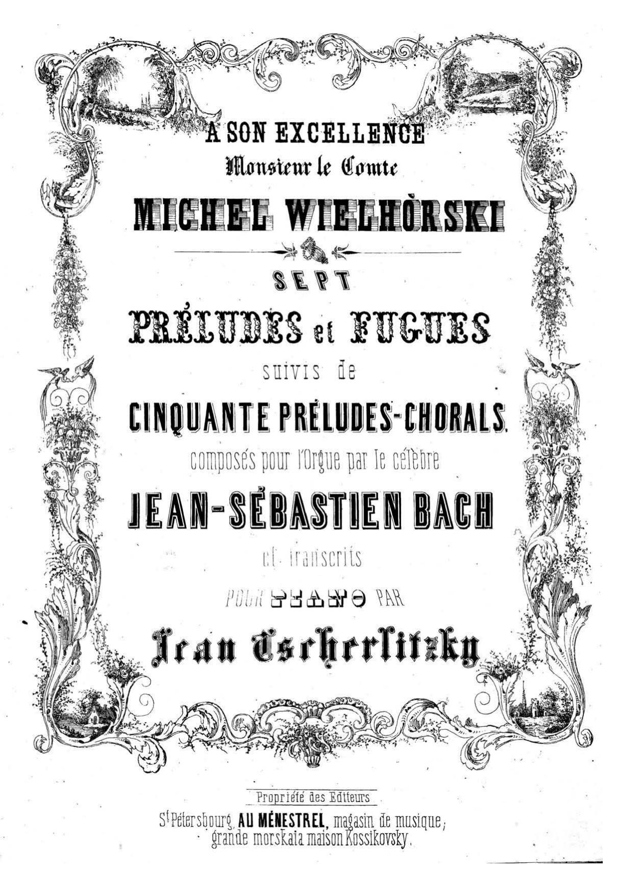 Органное наследие И. С. Баха (1685-1750) обширно: композитор обращался к своему любимому инструменту на протяжении всего творческого пути. В жанровом разнообразии особое место занимают хоральные прелюдии (более 150). И. К. Черлицкий (1799-1865), петербургский пианист, органист и педагог, принимал активное участие в популяризации органной музыки Баха путем ее переложения для фортепиано.