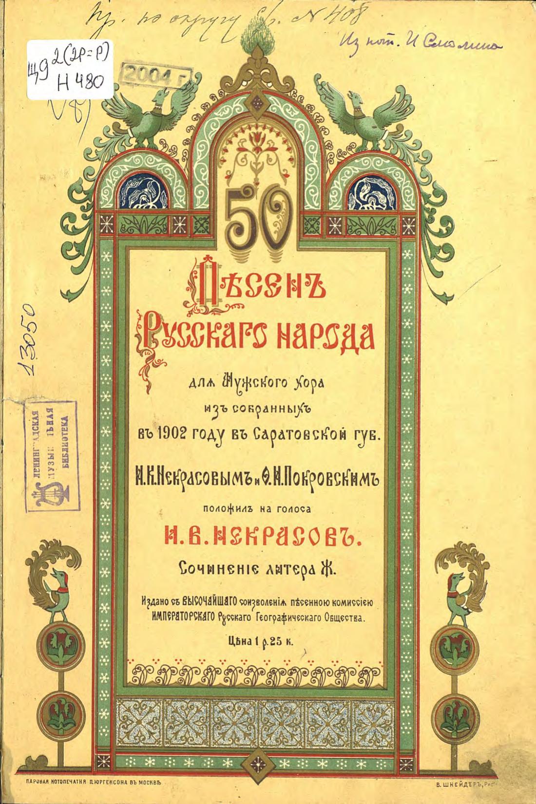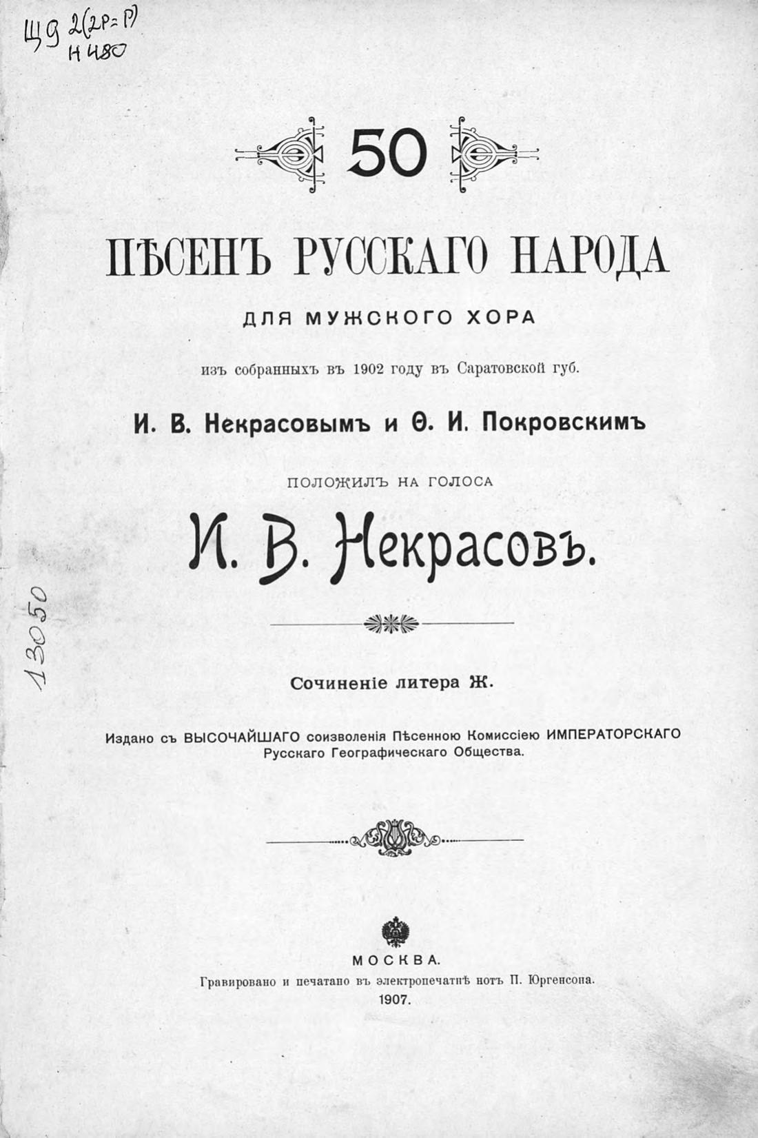 50 песен русского народа для мужского хора из собранных в 1902 году в Саратовской губернии И. В. Некрасовым и Ф. И. Покровским