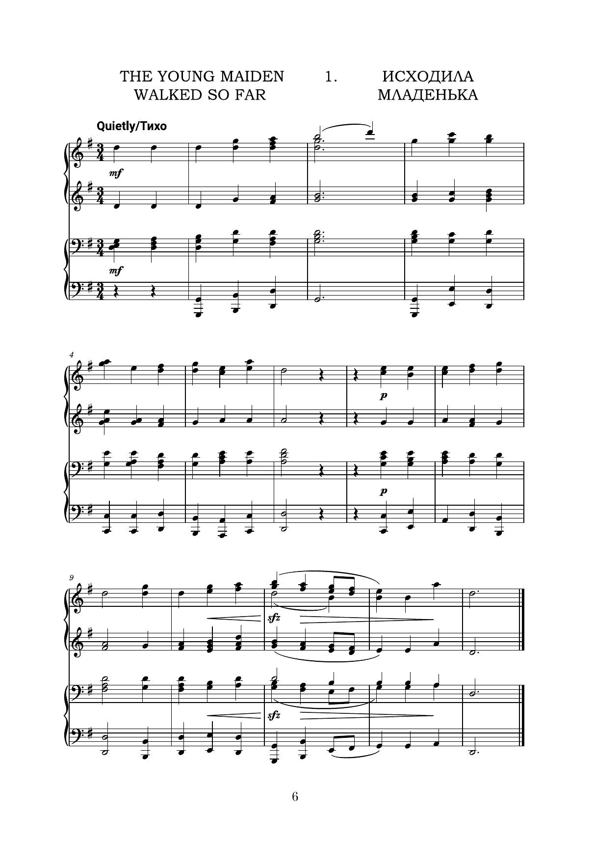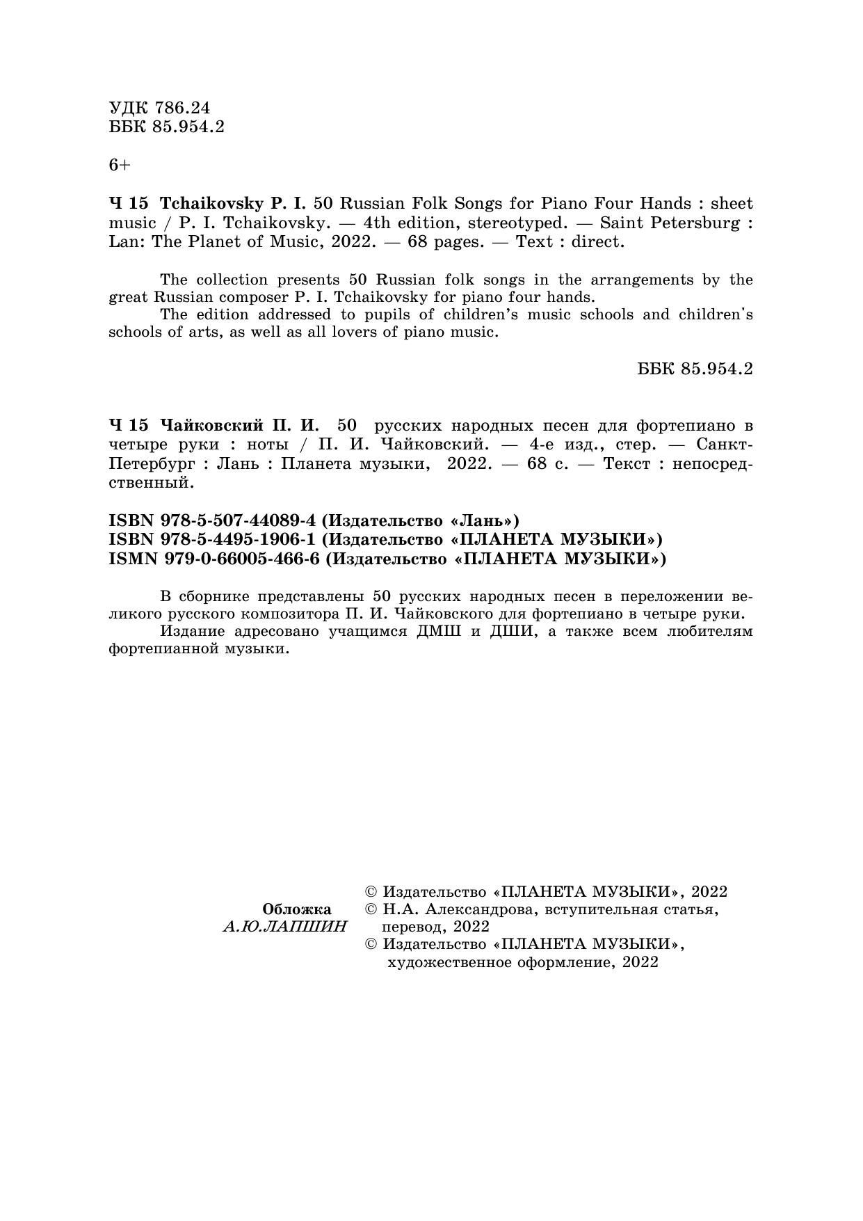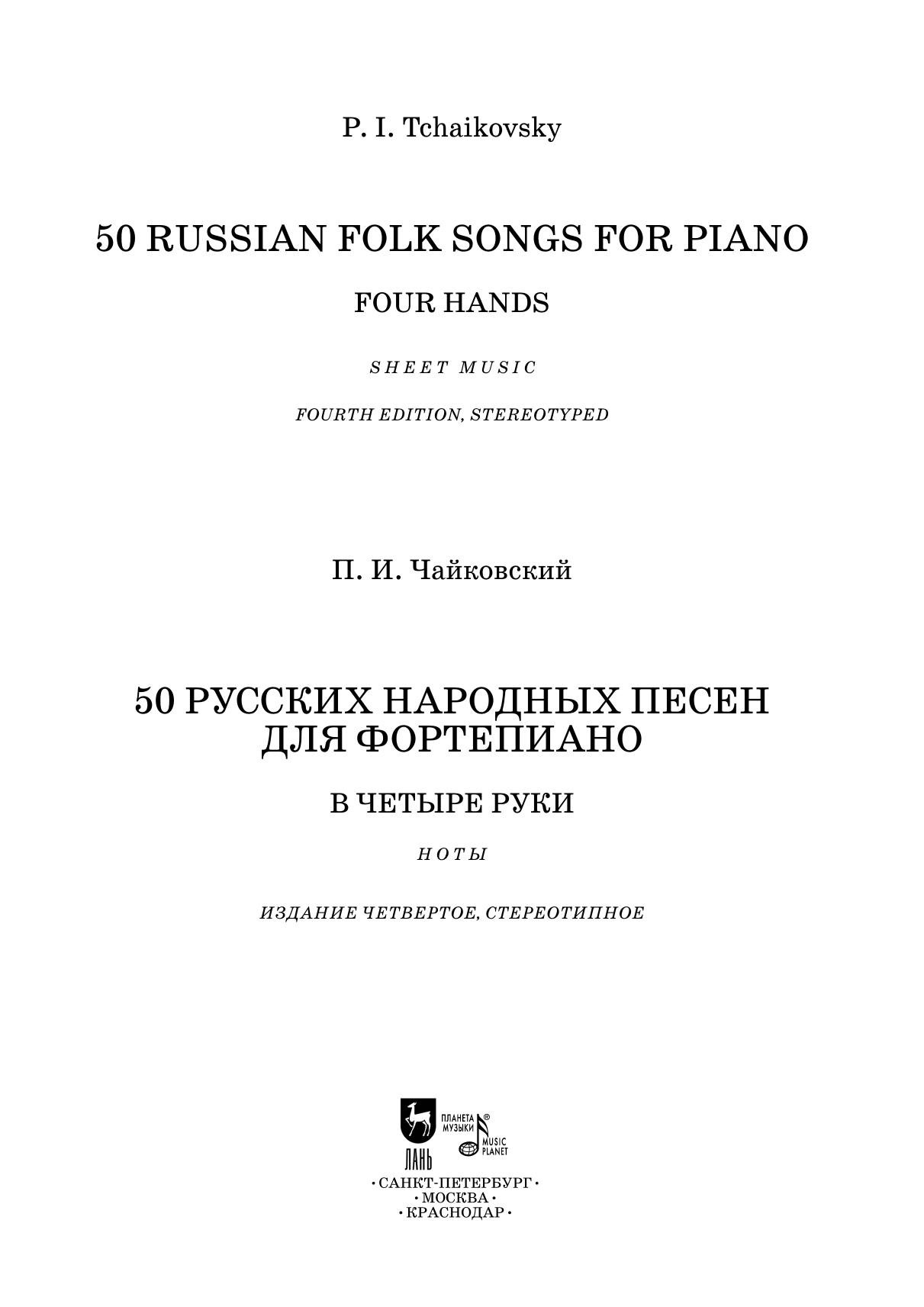 В сборнике представлены 50 русских народных песен в переложении великого русского композитора П. И. Чайковского для фортепиано в четыре руки.