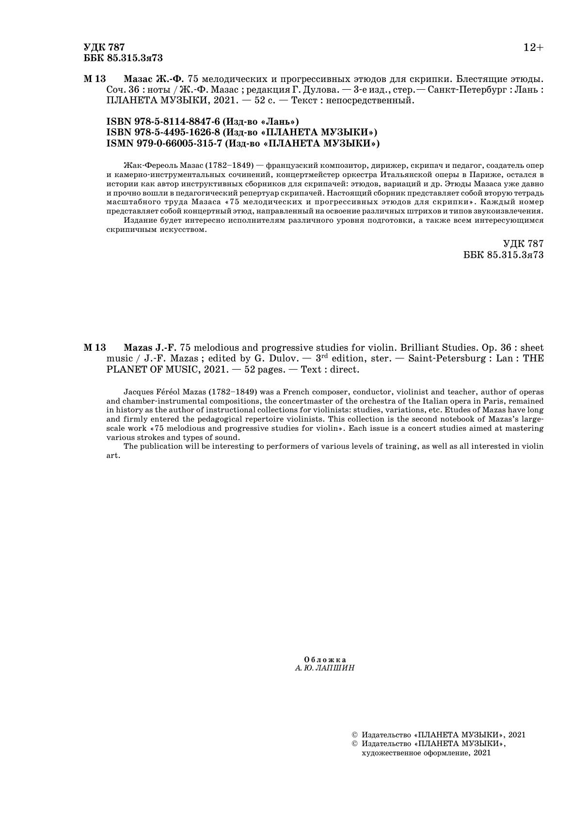 Jacques Fйrйol Mazas (1782–1849) was a French composer, conductor, violinist and teacher, author of operas and chamber-instrumental compositions, the concertmaster of the orchestra of the Italian opera in Paris, remained in history as the author of instructional collections for violinists: studies, variations, etc. Etudes of Mazas have long and firmly entered the pedagogical repertoire violinists. This collection is the second notebook of Mazas’s large-scale work «75 melodious and progressive studies for violin». Each issue is a concert studies aimed at mastering various strokes and types of sound.