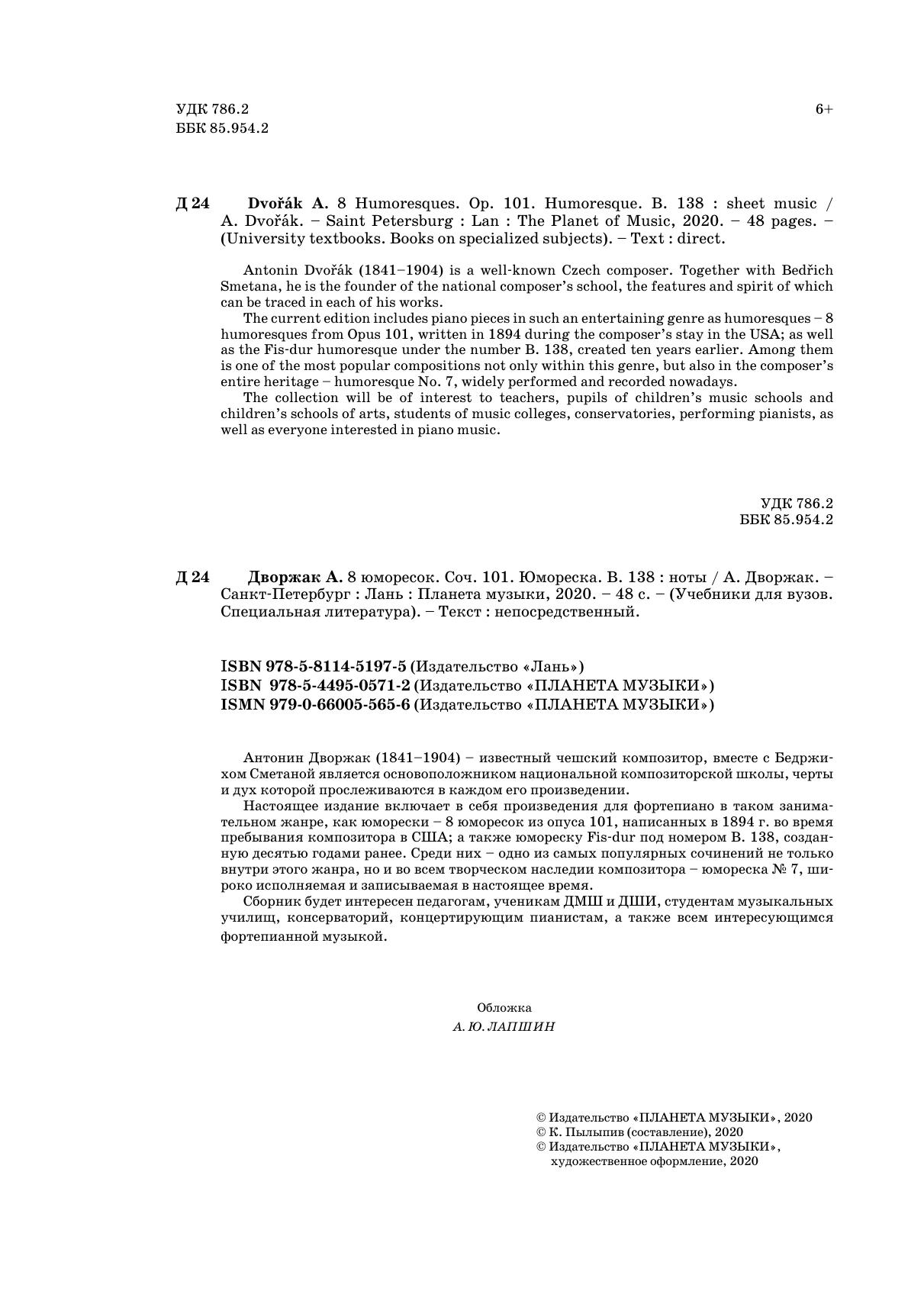 Настоящее издание включает в себя произведения для фортепиано в таком занимательном жанре, как юморески — 8 юморесок из опуса 101, написанных в 1894 г. во время пребывания композитора в США; а также юмореску Fis-dur под номером B. 138, созданную десятью годами ранее. Среди них — одно из самых популярных сочинений не только внутри этого жанра, но и во всем творческом наследии композитора – юмореска № 7, широко исполняемая и записываемая в настоящее время.