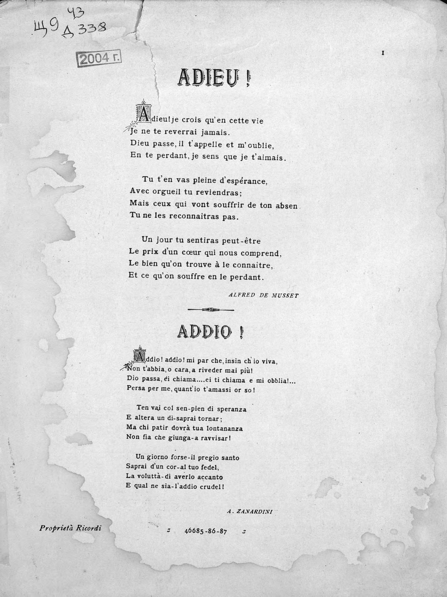 Перешедшие в общественное достояние материалы электронного фонда ЦГПБ им. В.В. Маяковского. Сведения о издательстве или типографии: G. Ricordi & C. Место издания: Париж