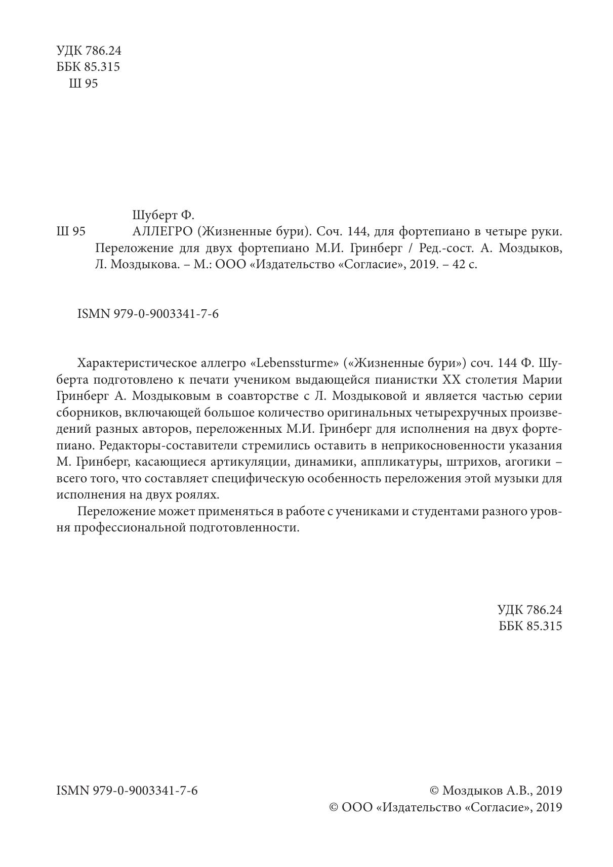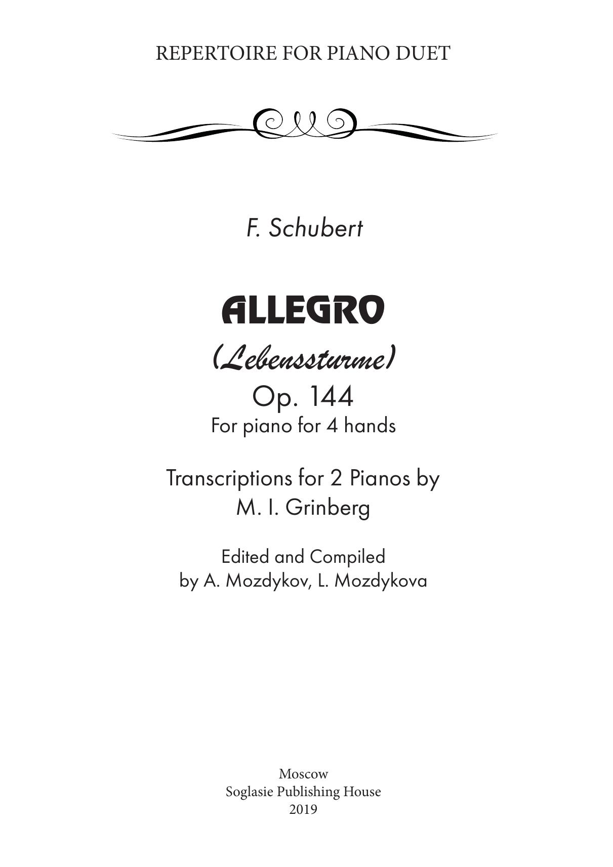 Характеристическое аллегро «Lebenssturme» («Жизненные бури») соч. 144 Ф. Шуберта подготовлено к печати учеником выдающейся пианистки XX столетия Марии Гринберг А. Моздыковым в соавторстве с Л. Моздыковой и является частью серии сборников, включающей большое количество оригинальных четырехручных произведений разных авторов, переложенных М.И. Гринберг для исполнения на двух фортепиано. Редакторы-составители стремились оставить в неприкосновенности указания М. Гринберг, касающиеся артикуляции, динамики, аппликатуры, штрихов, агогики – всего того, что составляет специфическую особенность переложения этой музыки для исполнения на двух роялях. Переложение может применяться в работе с учениками и студентами разного уровня профессиональной подготовленности.