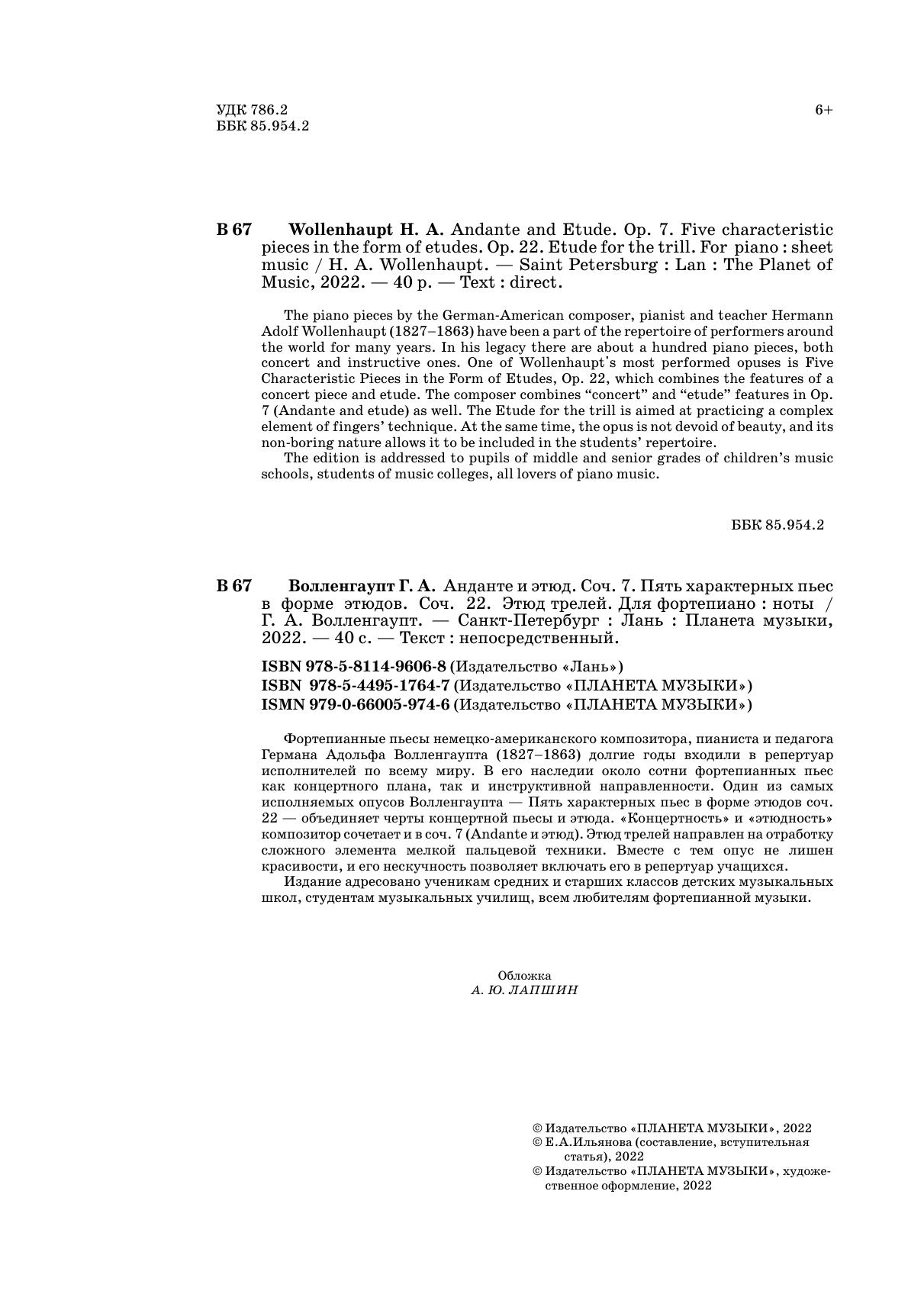 The piano pieces by the German-American composer, pianist and teacher Hermann Adolf Wollenhaupt (1827–1863) have been a part of the repertoire of performers around the world for many years. In his legacy there are about a hundred piano pieces, both concert and instructive ones. One of Wollenhaupt's most performed opuses is Five Characteristic Pieces in the Form of Etudes, Op. 22, which combines the features of a concert piece and etude. The composer combines “concert” and “etude” features in Op. 7 (Andante and etude) as well. The Etude for the trill is aimed at practicing a complex element of fingers’ technique. At the same time, the opus is not devoid of beauty, and its non-boring nature allows it to be included in the students’ repertoire.